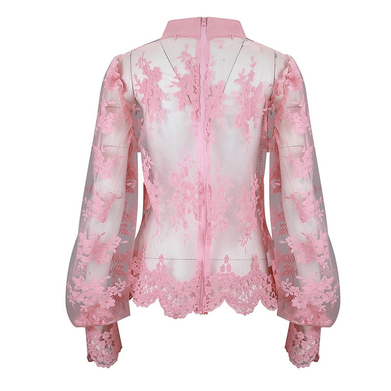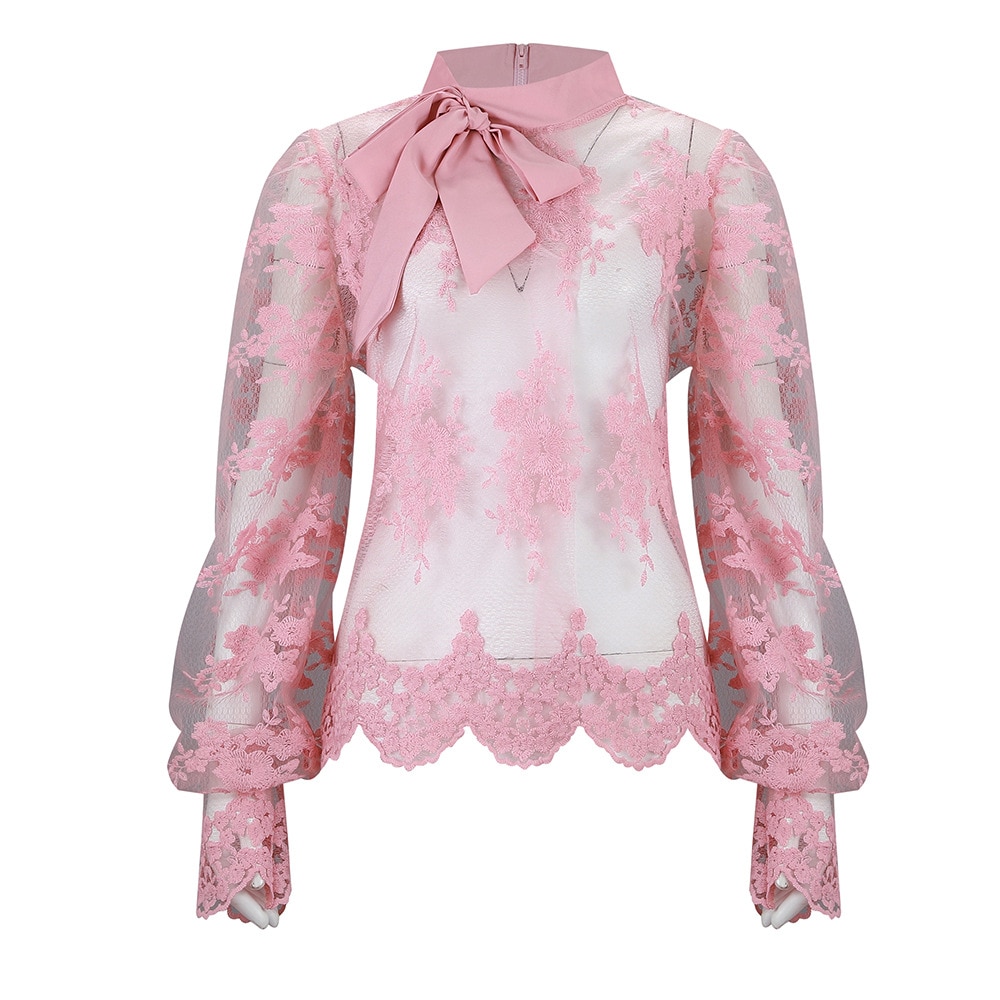 Floral Crochet Women Lace Tops Bow Tied Neck Puff Sleeve Top Sexy See Through Flower Chic Blouse Shirt Transparent Blusa