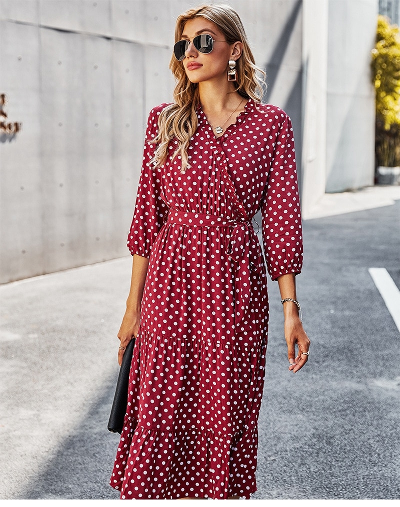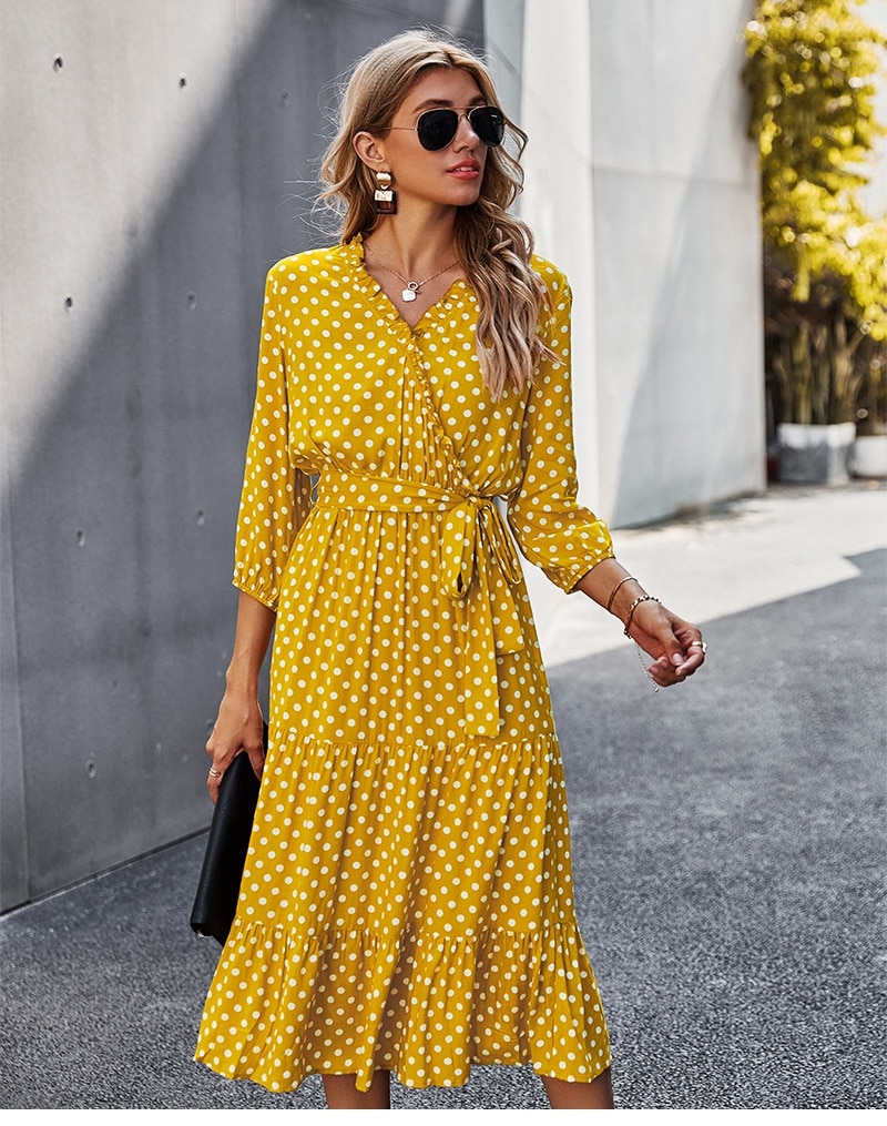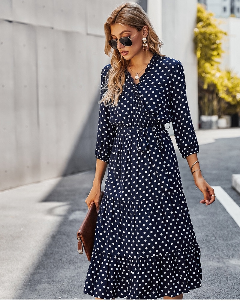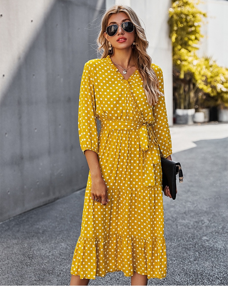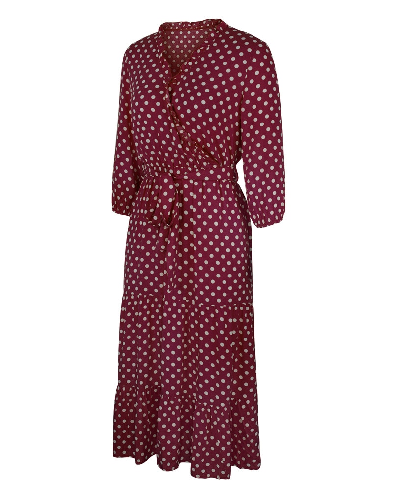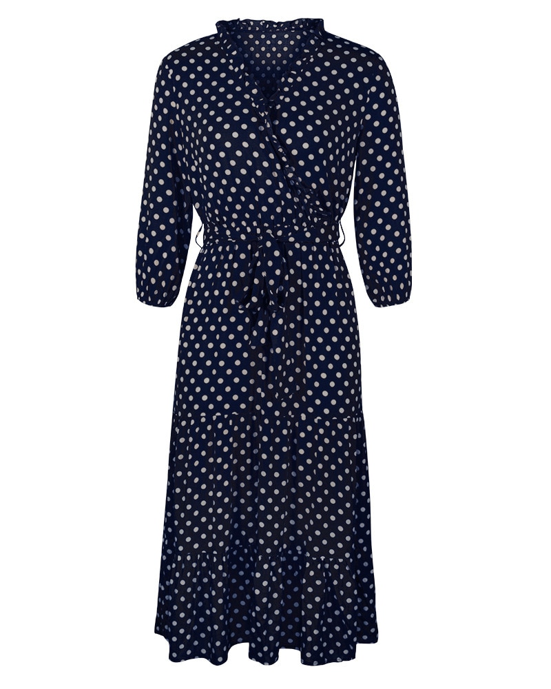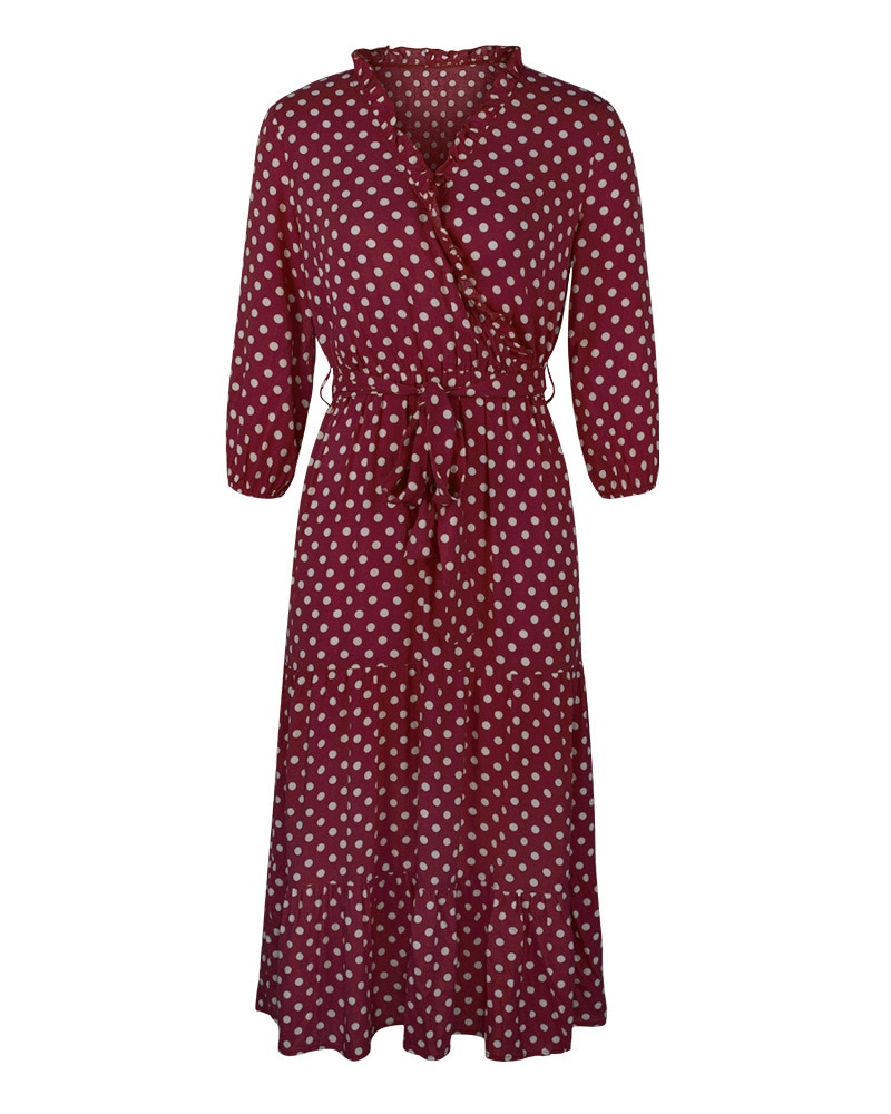 Autumn Winter Dot Bandage Dress Women Casual Ruffles V Neck High Waist Slim Print Long Dress Fashion