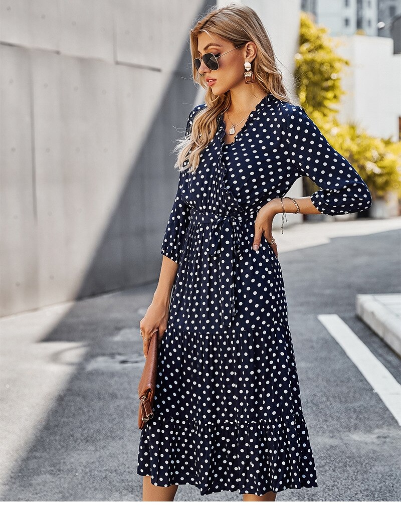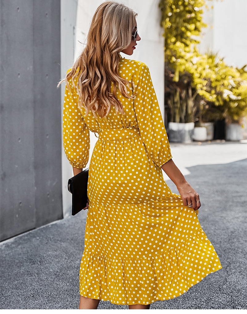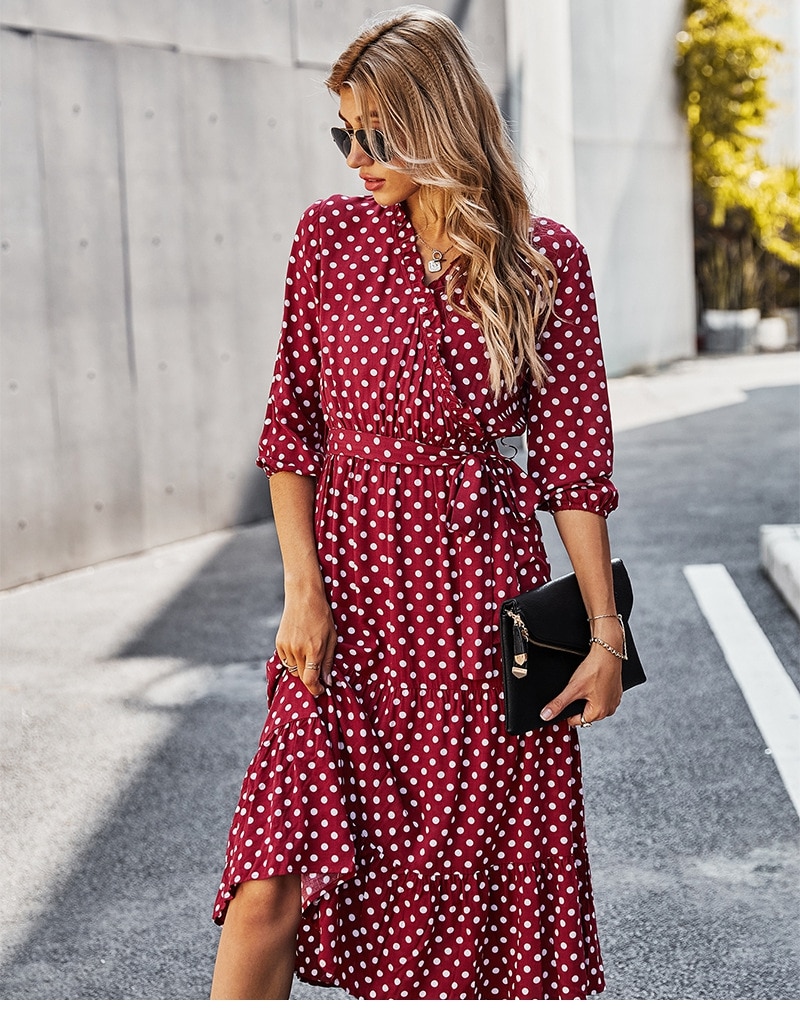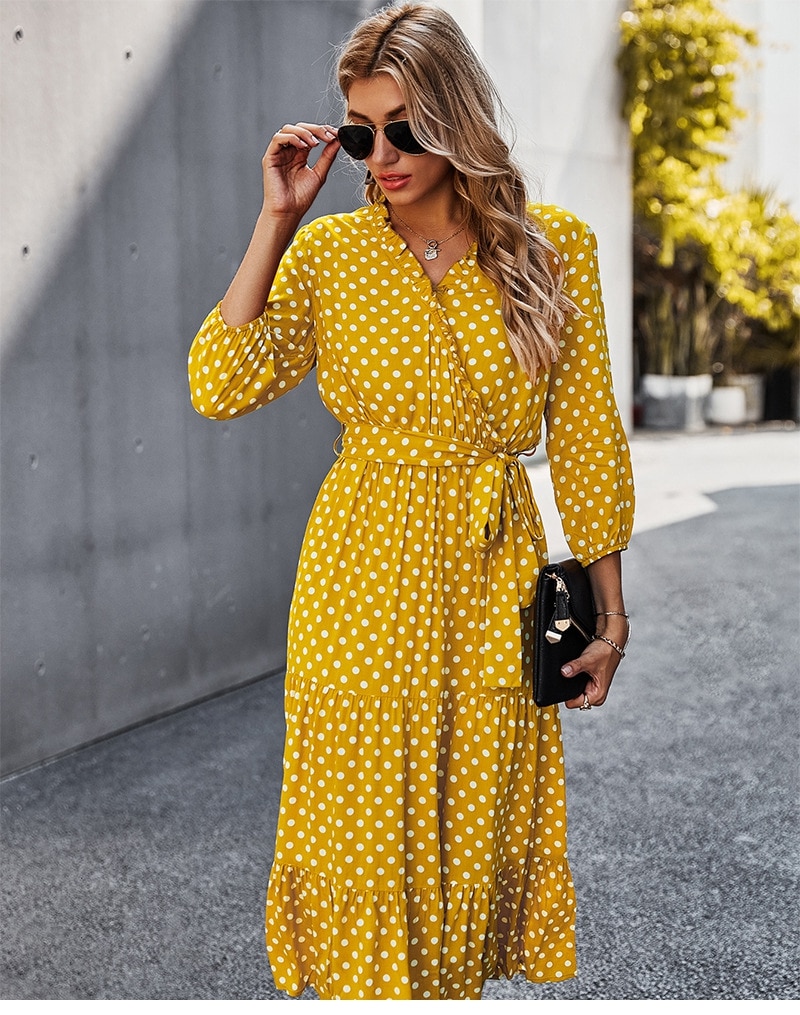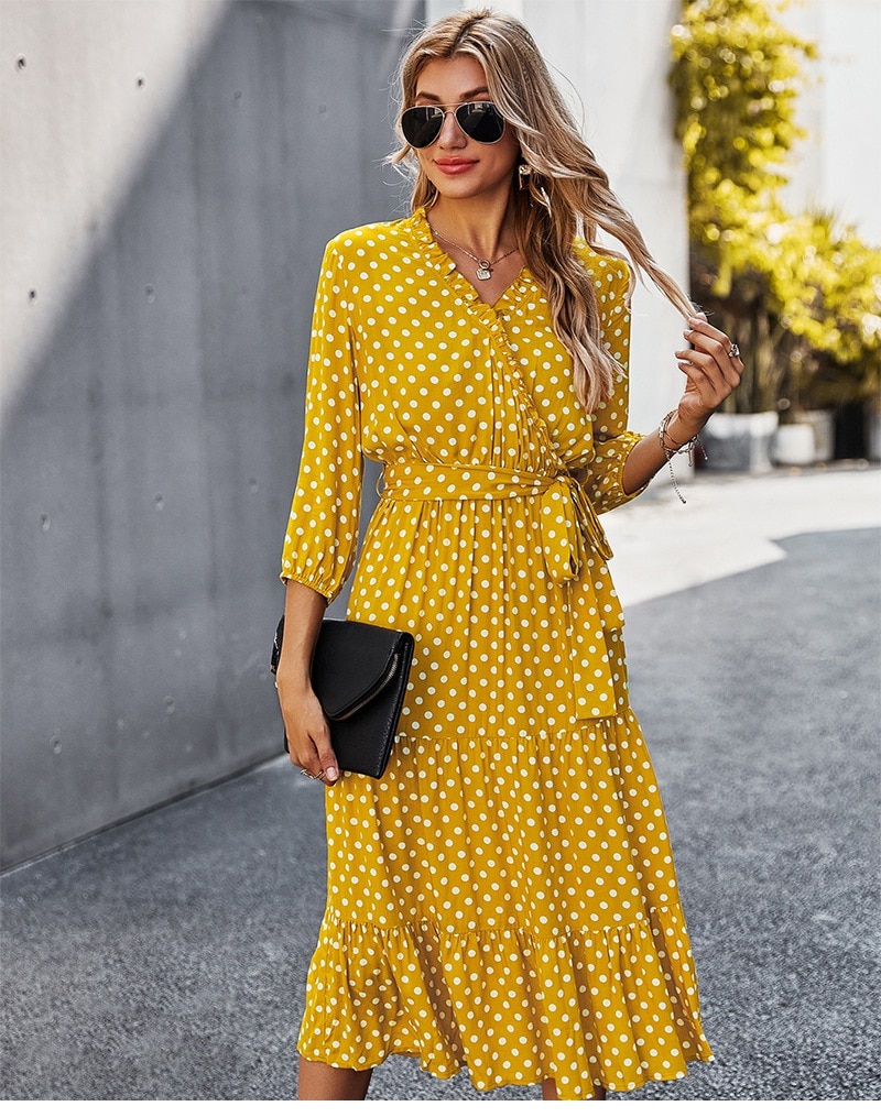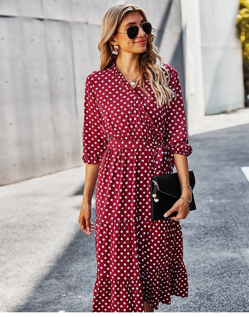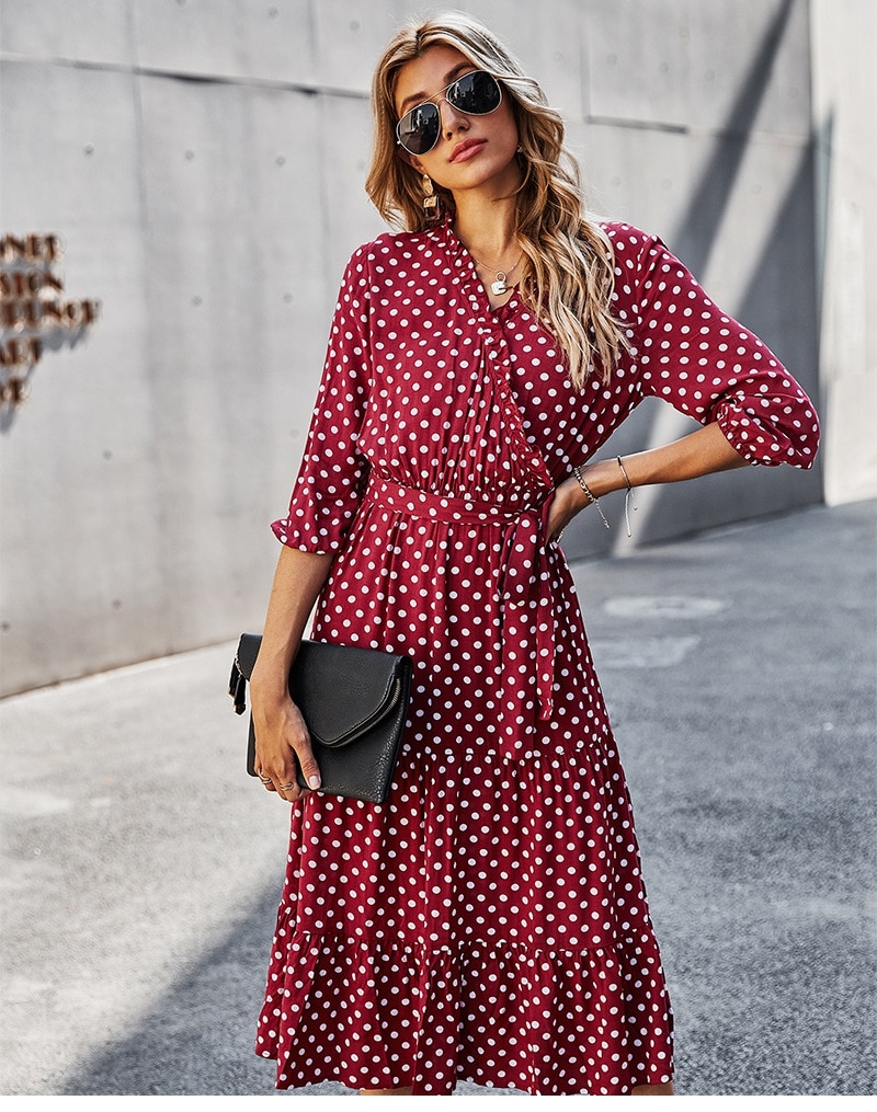 Autumn Winter Dot Bandage Dress Women Casual Ruffles V Neck High Waist Slim Print Long Dress Fashion