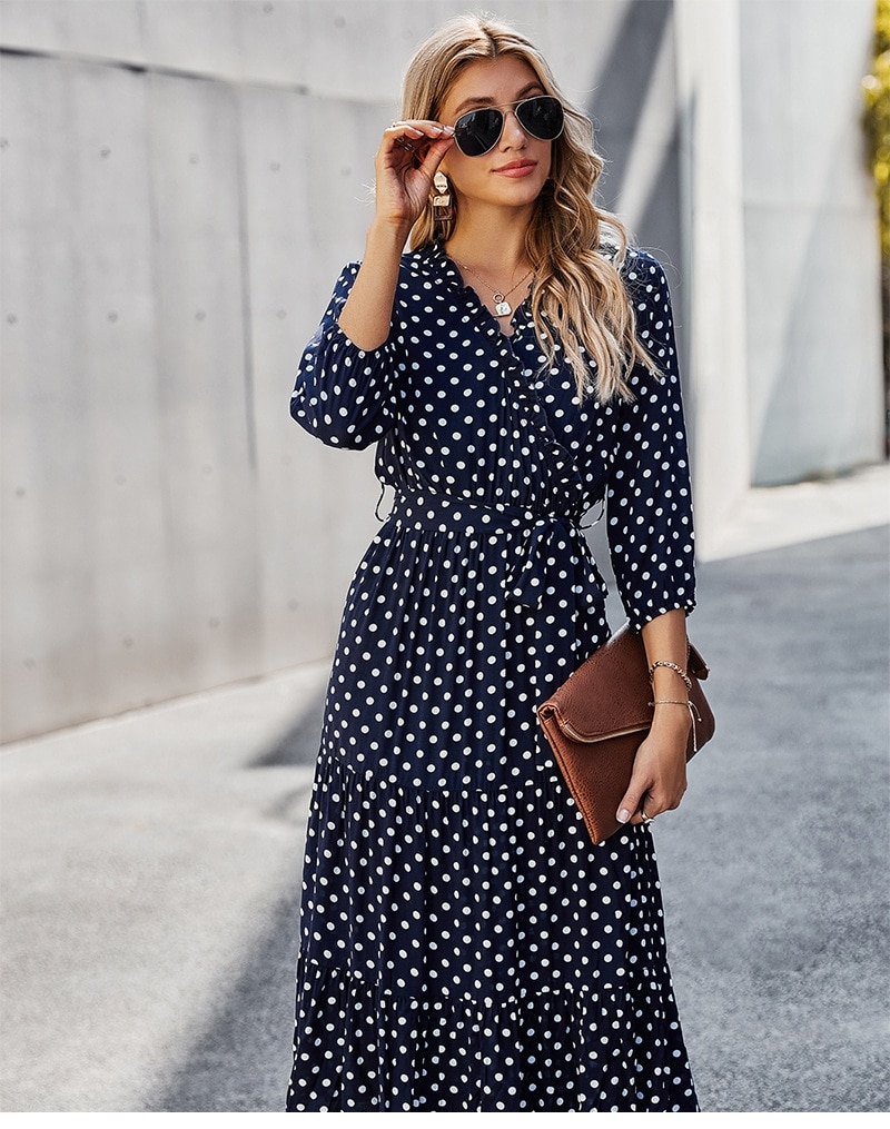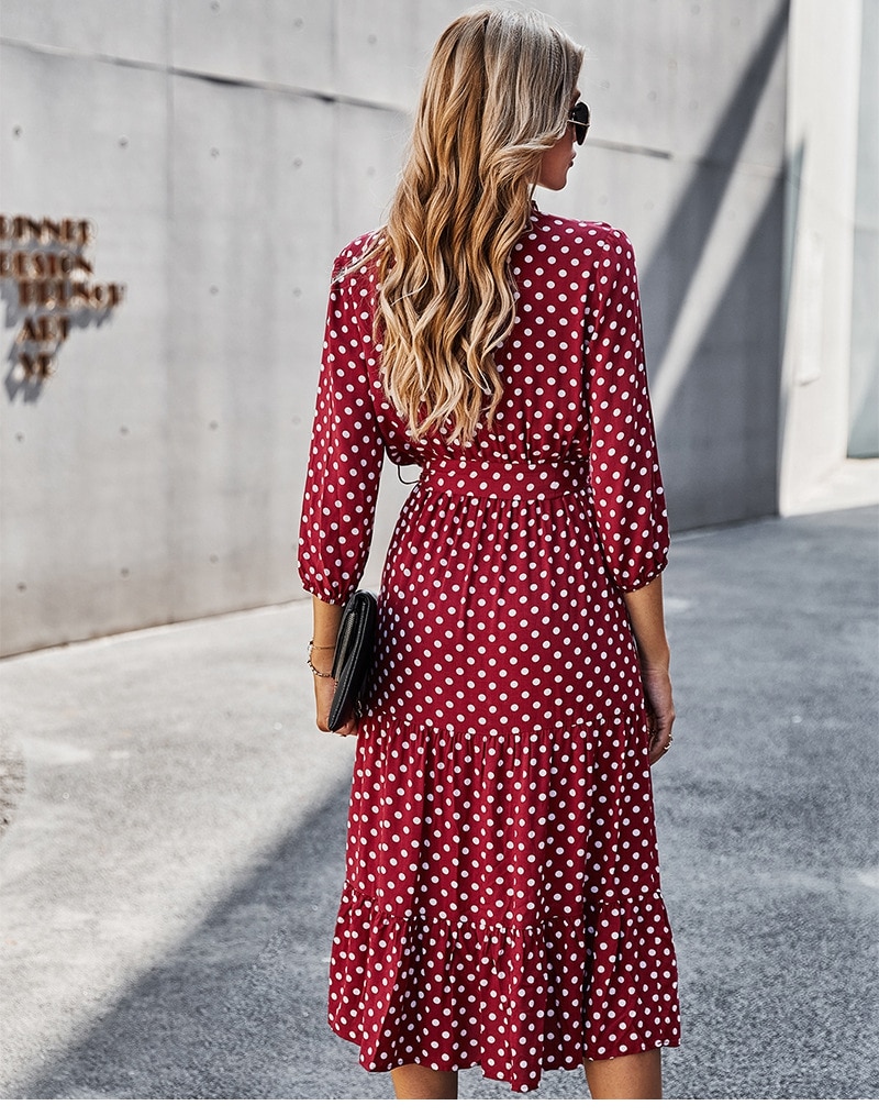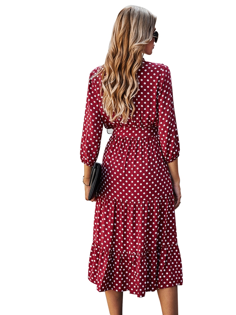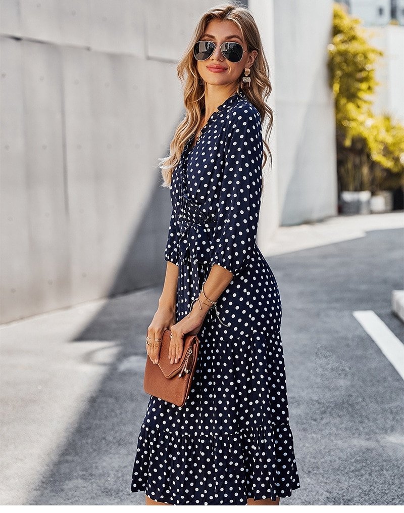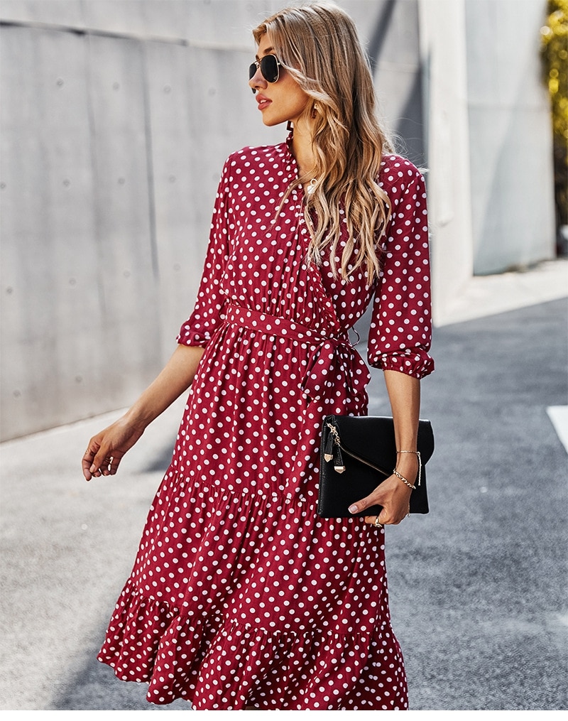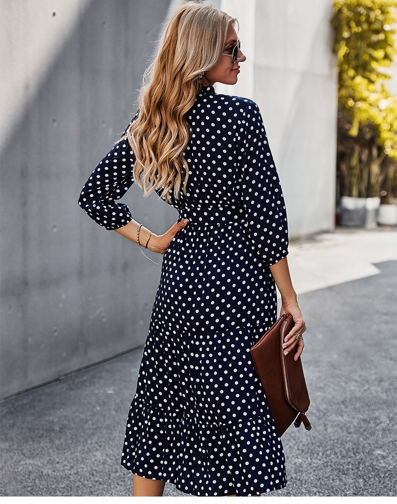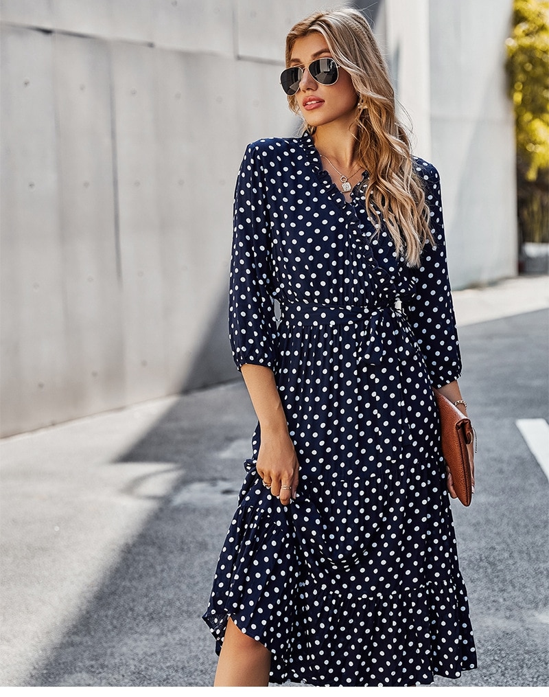 Autumn Winter Dot Bandage Dress Women Casual Ruffles V Neck High Waist Slim Print Long Dress Fashion