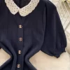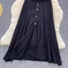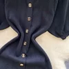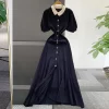 This black knit summer dress for women features an A-line silhouette with puff sleeves and mid-calf length. It has a turn-down collar, empire waistline, and button decoration. The dress is made of knitting material with medium stretch, offering a regular fit. Perfect for summer, it combines high street style with a solid pattern, making it a versatile addition to your wardrobe.