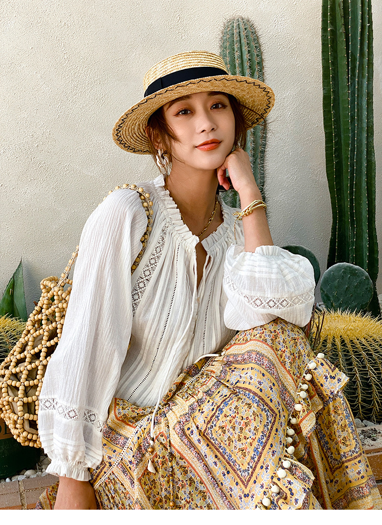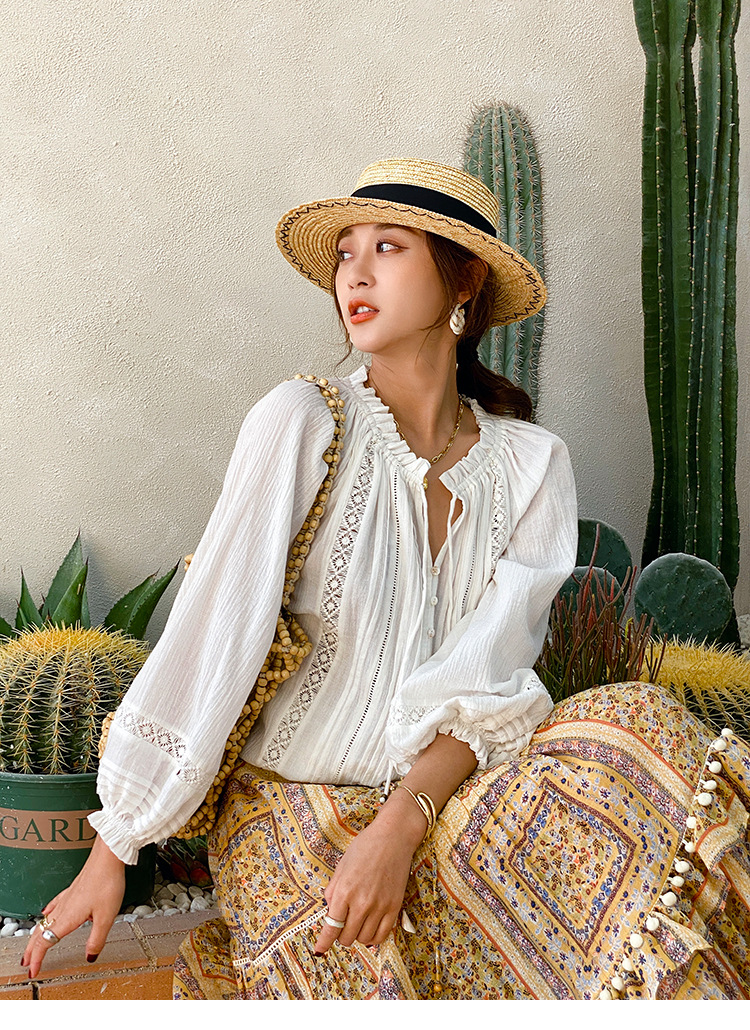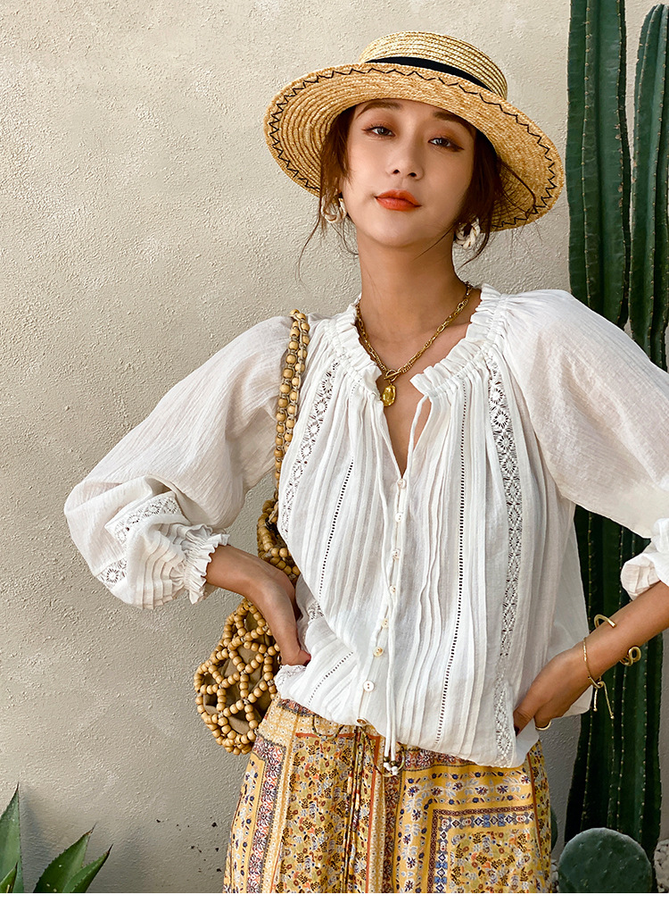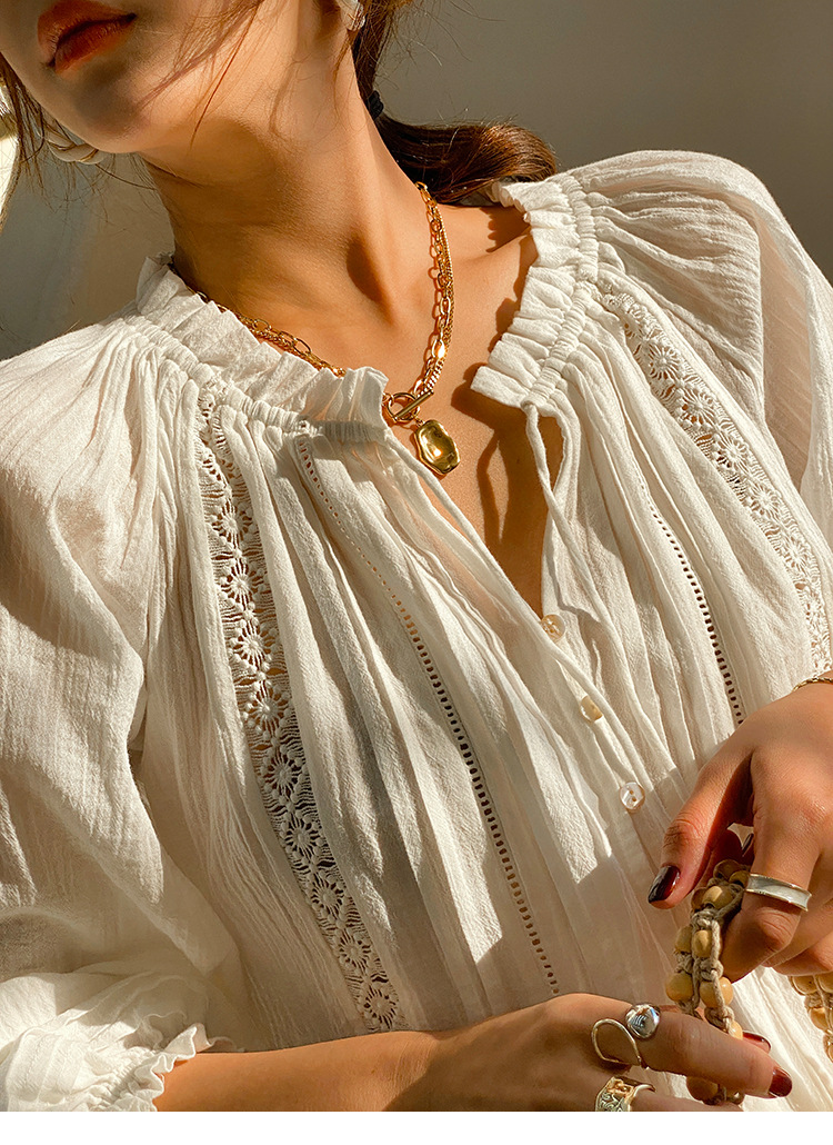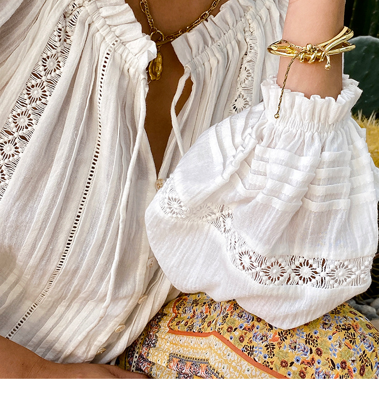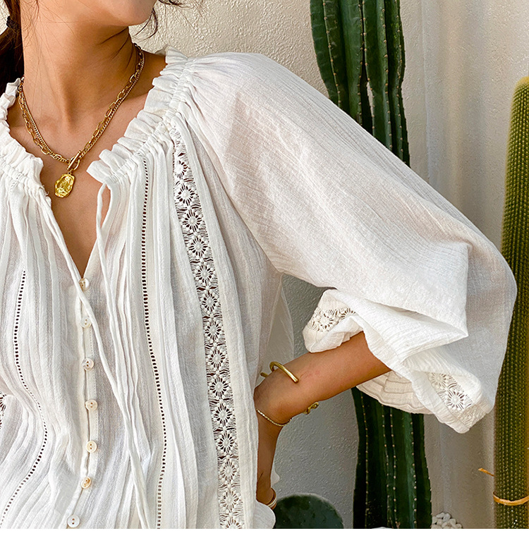 - Design: Relaxed loose fit, tie V-neck, lantern sleeves, delicate lace embroidery panel accents