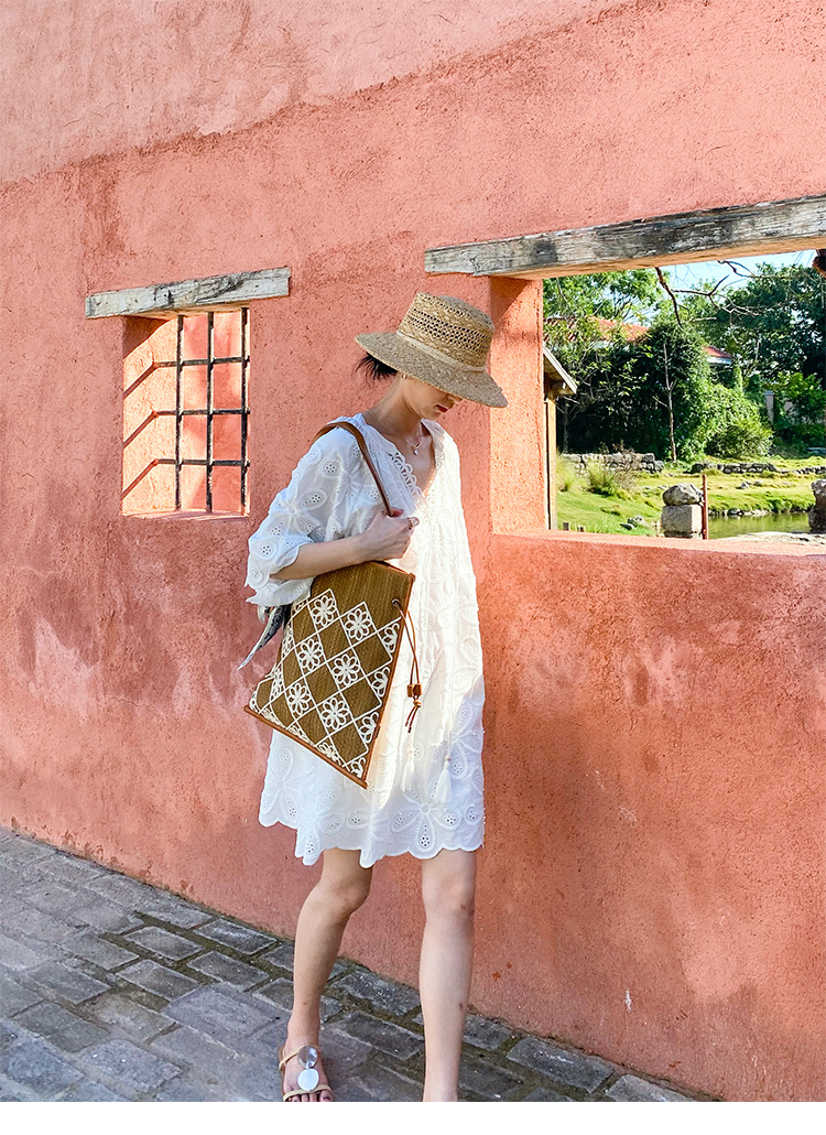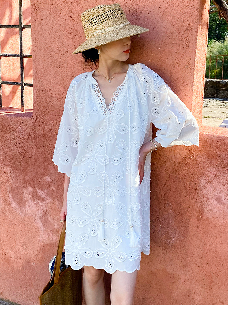 This Cotton Embroidered Eyelet Tassel Loose Midi Dress brings boho, retro, and elegant charm to your summer wardrobe! Made from 100% cotton, it features a round neck, three – quarter regular sleeves, and an oversized swing silhouette with a loose waist for easy comfort. The detailed embroidery, hollow – out details, and tassel accents add unique flair, making it ideal for travel, casual outings, or sunny summer adventures. Stay cool and stylish in this versatile white midi dress!