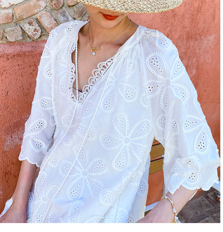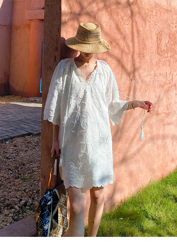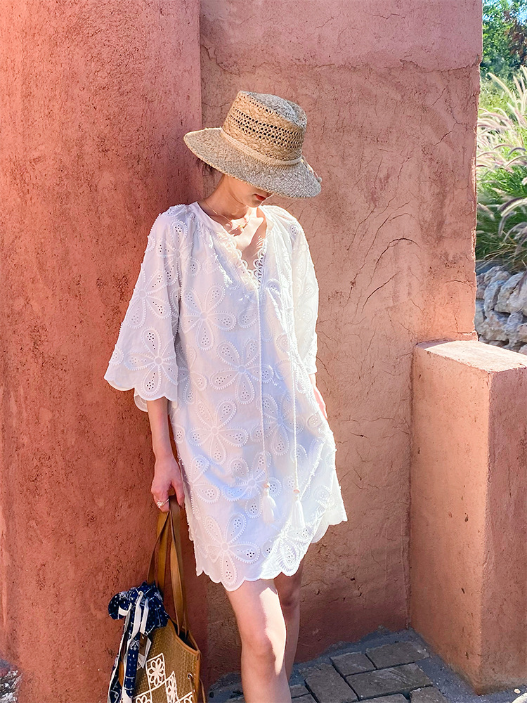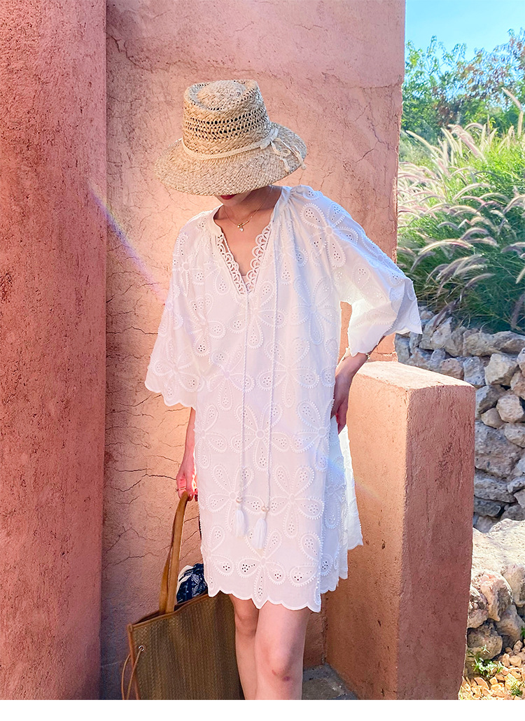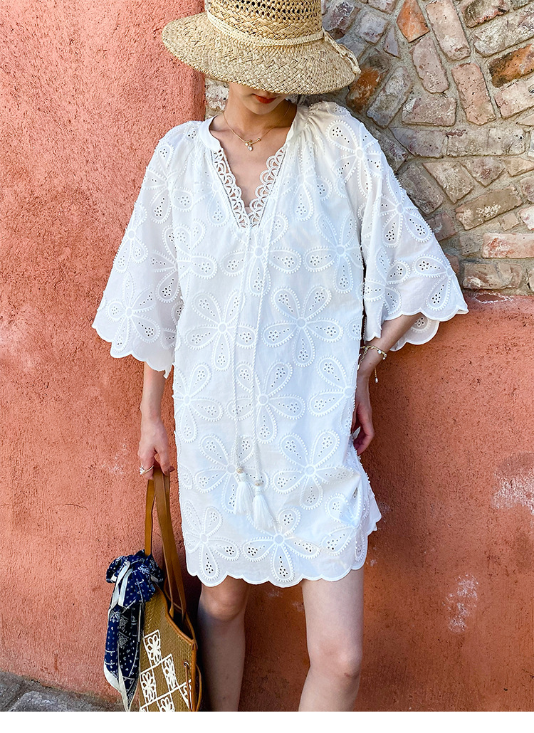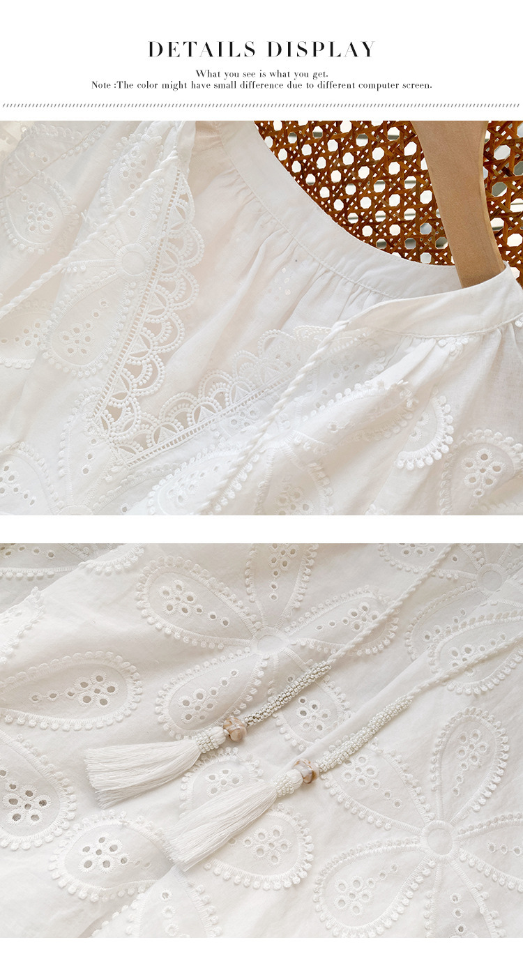 - Design: Round neck, three – quarter regular sleeves, midi length, oversized swing silhouette, loose waist, embroidery, hollow out, tassel accents
