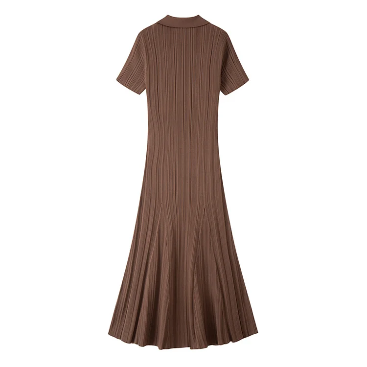 Dark Brown Collared Short Sleeve Knit Midi Dress Elegant Work Casual