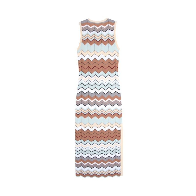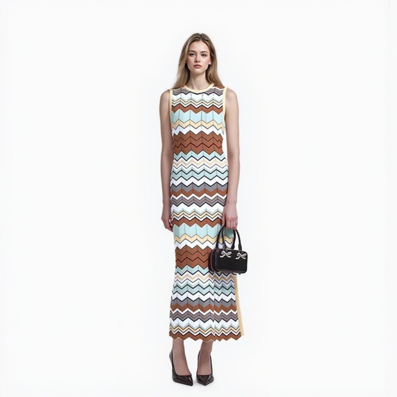 - Design: Crew neck, sleeveless, high waist, A-line silhouette, midi length, chevron stripe pattern