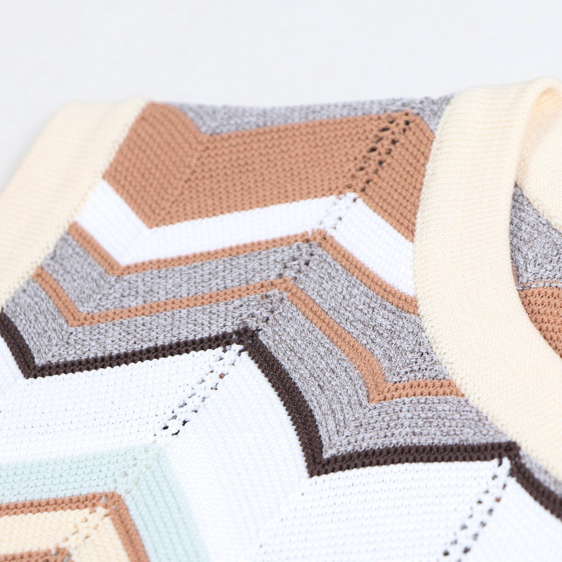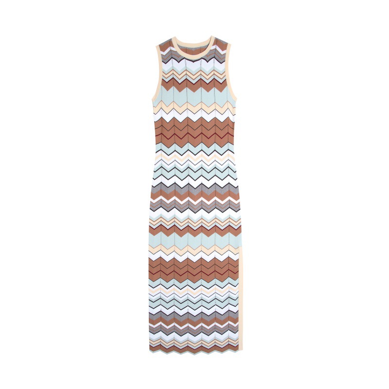 This midi knit dress fits most body shapes perfectly. It features a chic chevron stripe pattern in soft neutral tones that pair easily with heels, sneakers, or light jackets. The crew neck and sleeveless cut keep you cool in warm spring and summer weather. The high waist and flowy A-line silhouette flatter your figure. It works for daily errands, office days, weekend brunch, or casual evening outings. The soft stretchy fabric feels comfortable against your skin for all-day wear.