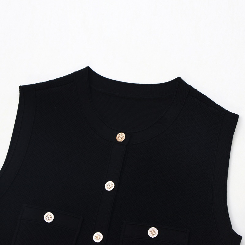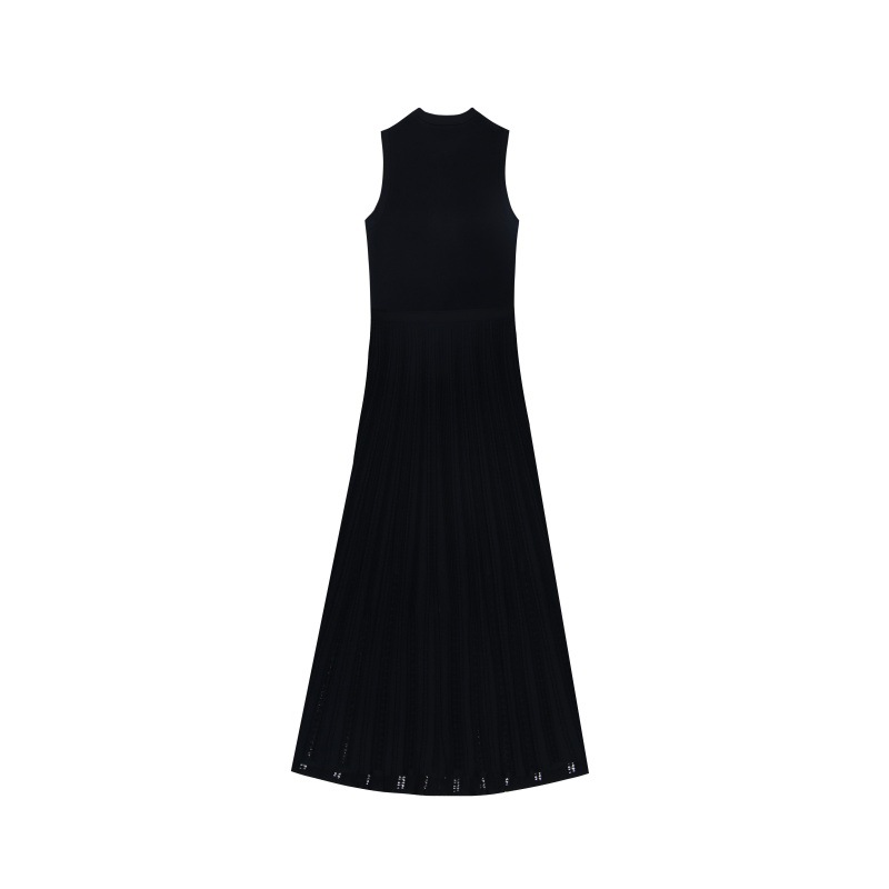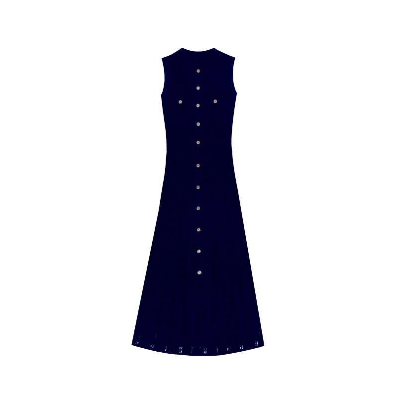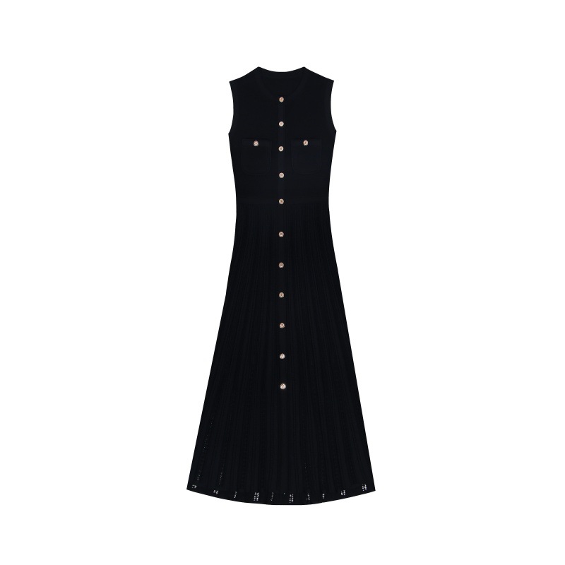 - Design Details: Crew neck, sleeveless, high waist, front single-breasted button placket, cutout details, A-line midi silhouette, pleated skirt