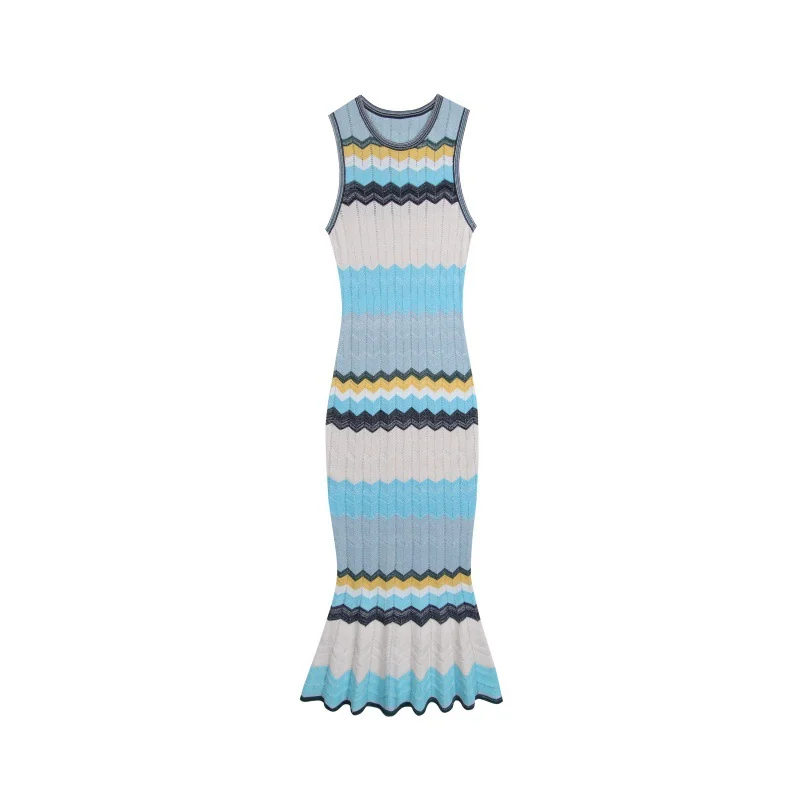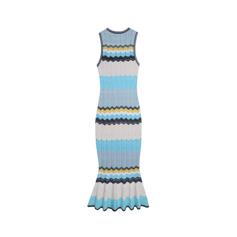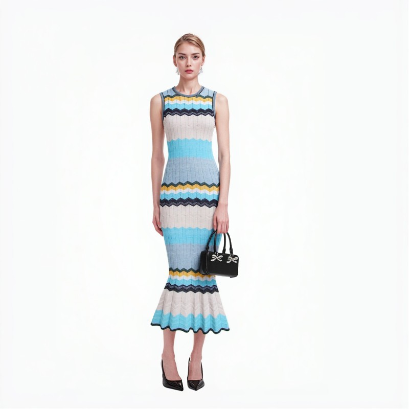 Elegant Sleeveless Round Neck Wavy Stripe Midi Knit Fishtail Dress Skin-Friendly Cooling