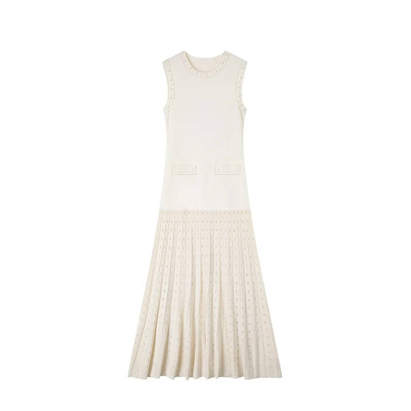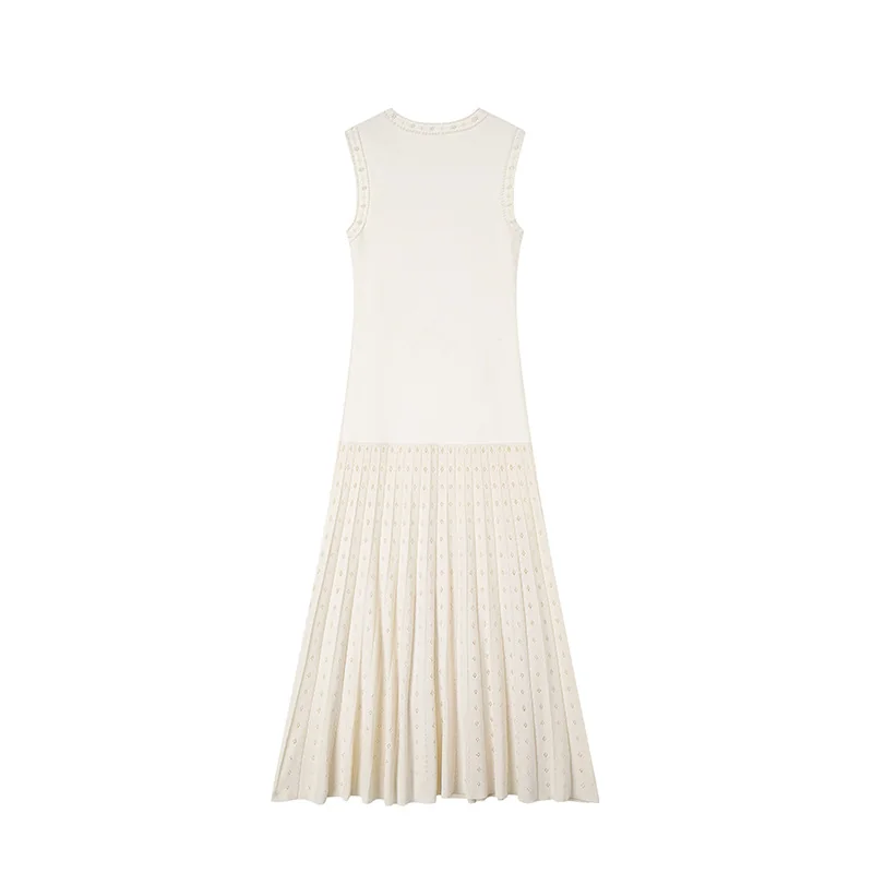 Elegant Summer Sleeveless Crewneck Rhinestone Pleated Midi Knit Dress