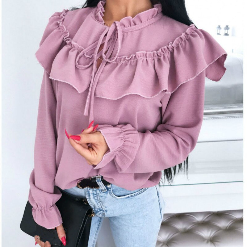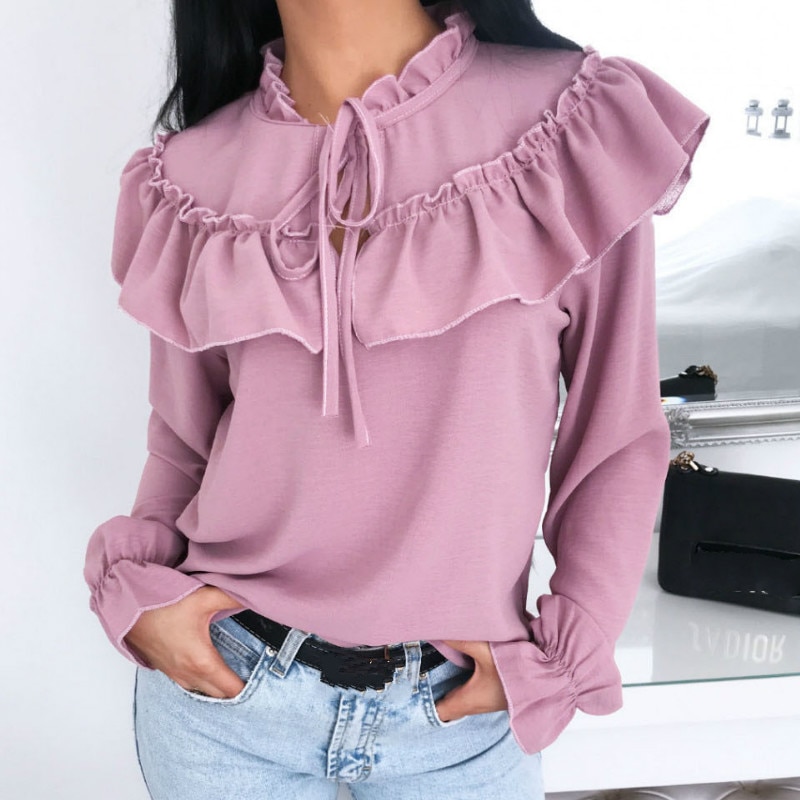 Women Blouse Round Neck Ruffle Casual Tops Long Sleeve Shirt