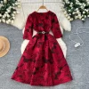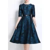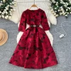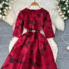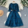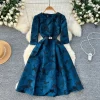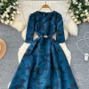 Look stylish and feel comfortable in this French Fashion Print O-Neck A-Line Ball Gown Dress. It features a classic O-neck design and an A-line silhouette that flatters all body types. The dress is made from polyester fabric with slight stretch for a comfortable fit. Perfect for spring and summer parties, it comes in blue and red colors. The mid-calf length and full sleeves add a touch of elegance, while the embroidery decoration gives it a luxurious look. The pullover closure makes it easy to wear.