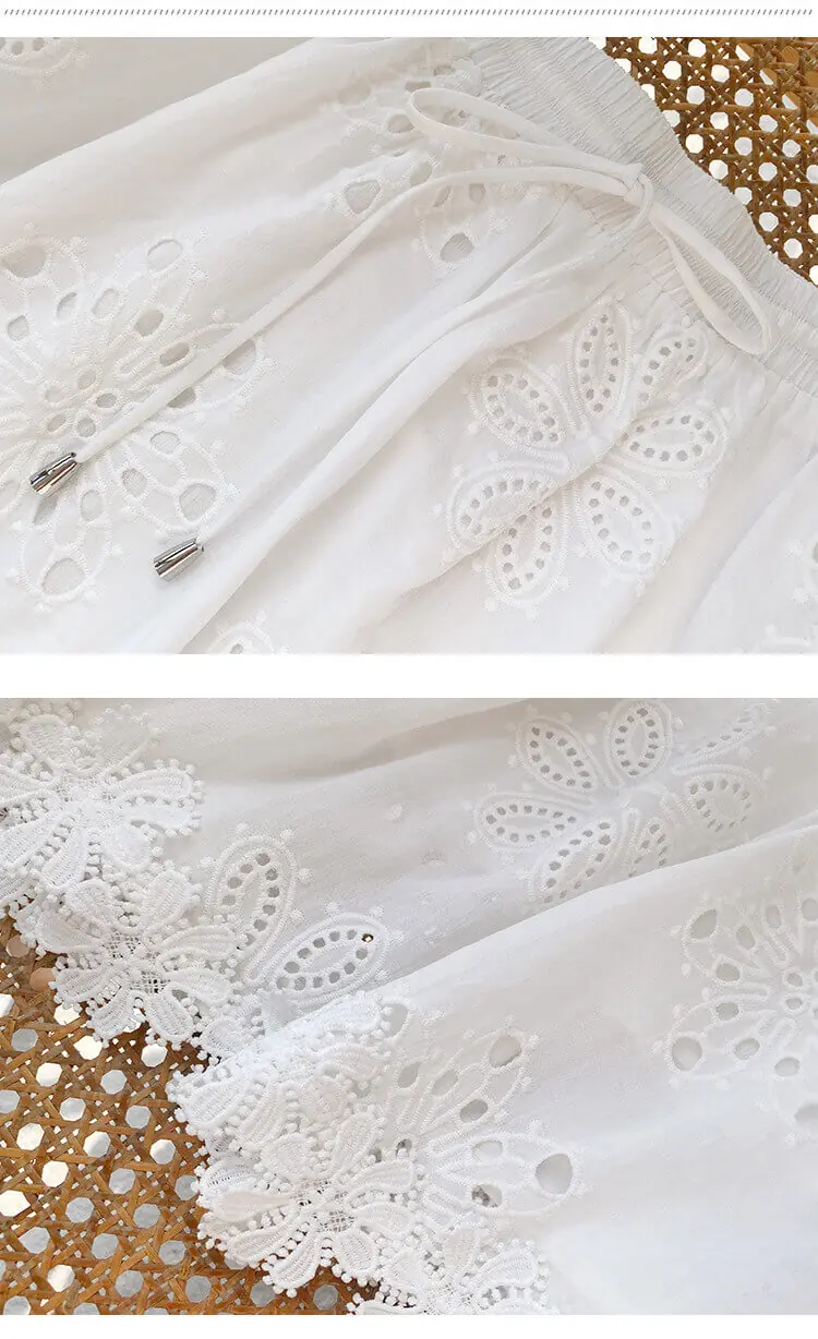 - Design: Intricate floral embroidery, eyelet cutout details, scalloped frill hem, elasticated adjustable waist