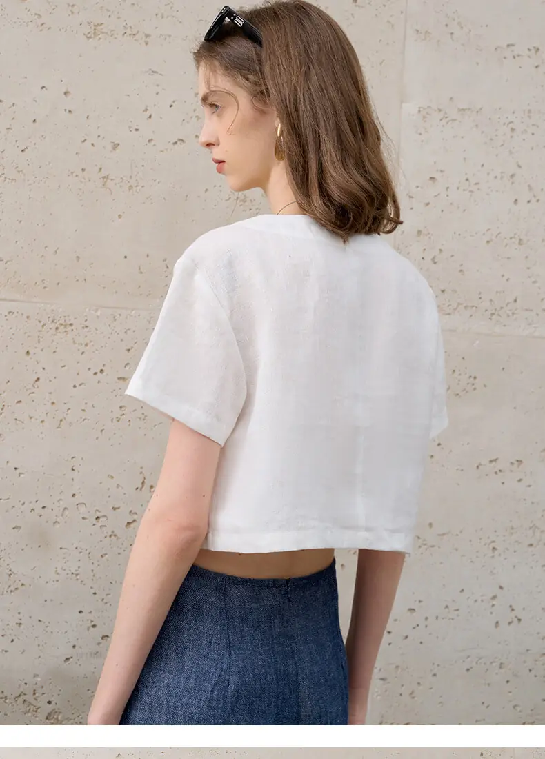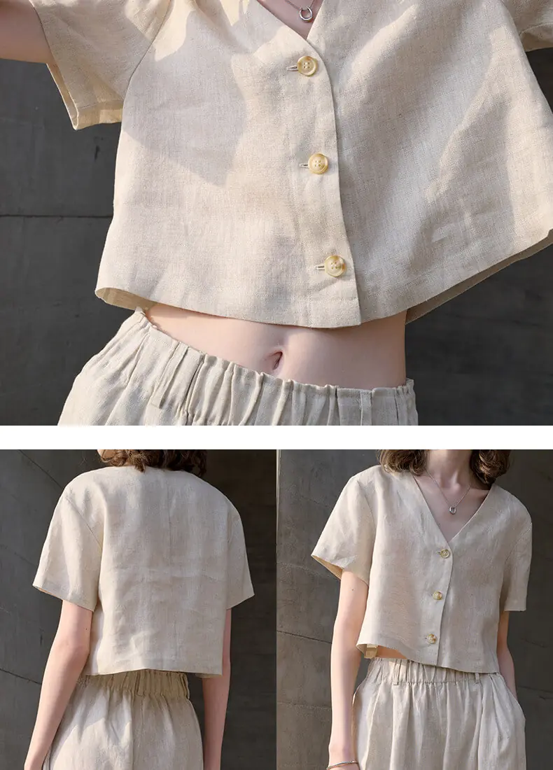 French Riviera Breathable Linen V Neck Cropped Short Sleeve Blouse