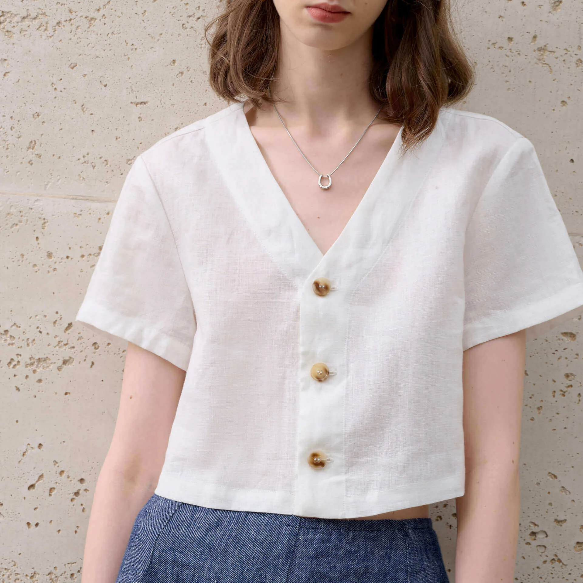 - Design: Cropped fit, V-neckline, three tortoiseshell front buttons, short sleeves, subtle gathered details