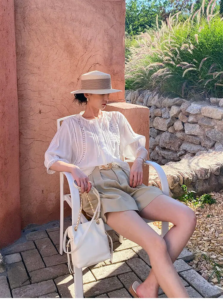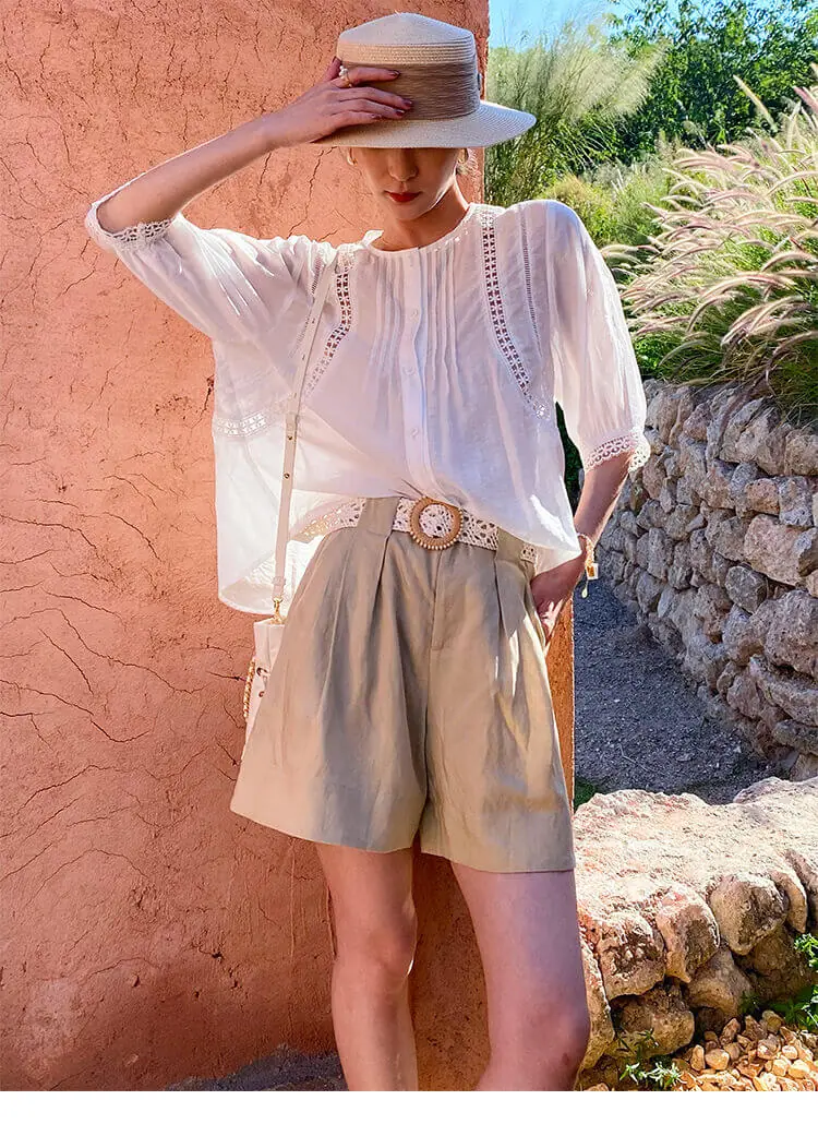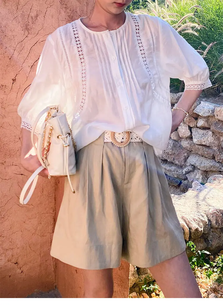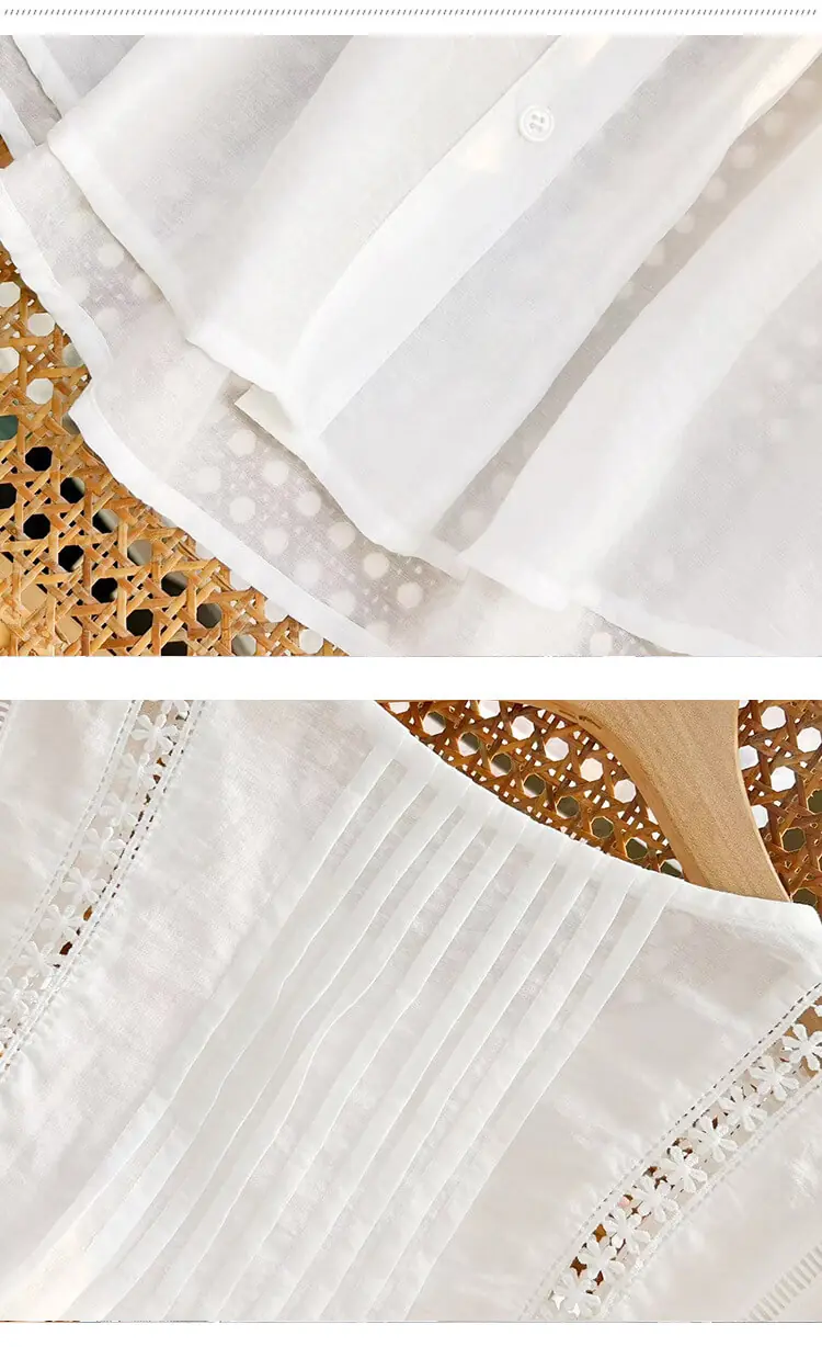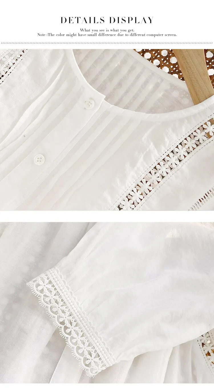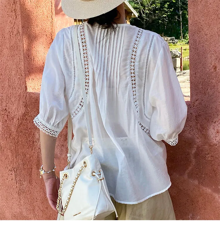 - Design: Relaxed loose fit, round neck, three-quarter puff sleeves, intricate floral lace cutout details, button-front placket, pintuck detailing on bodice