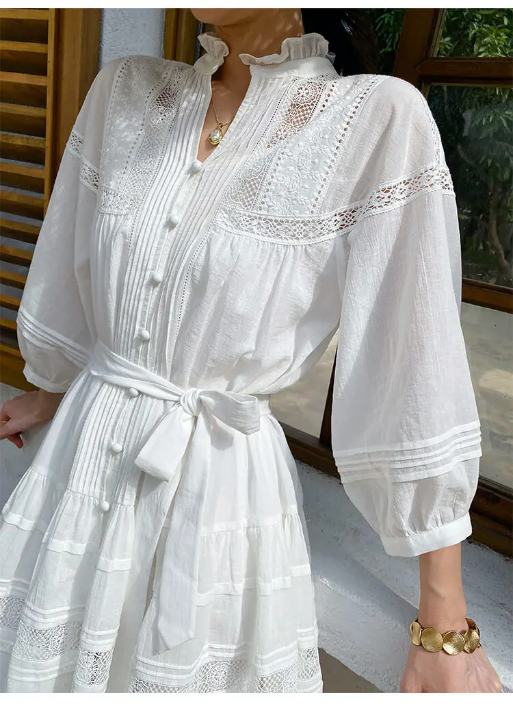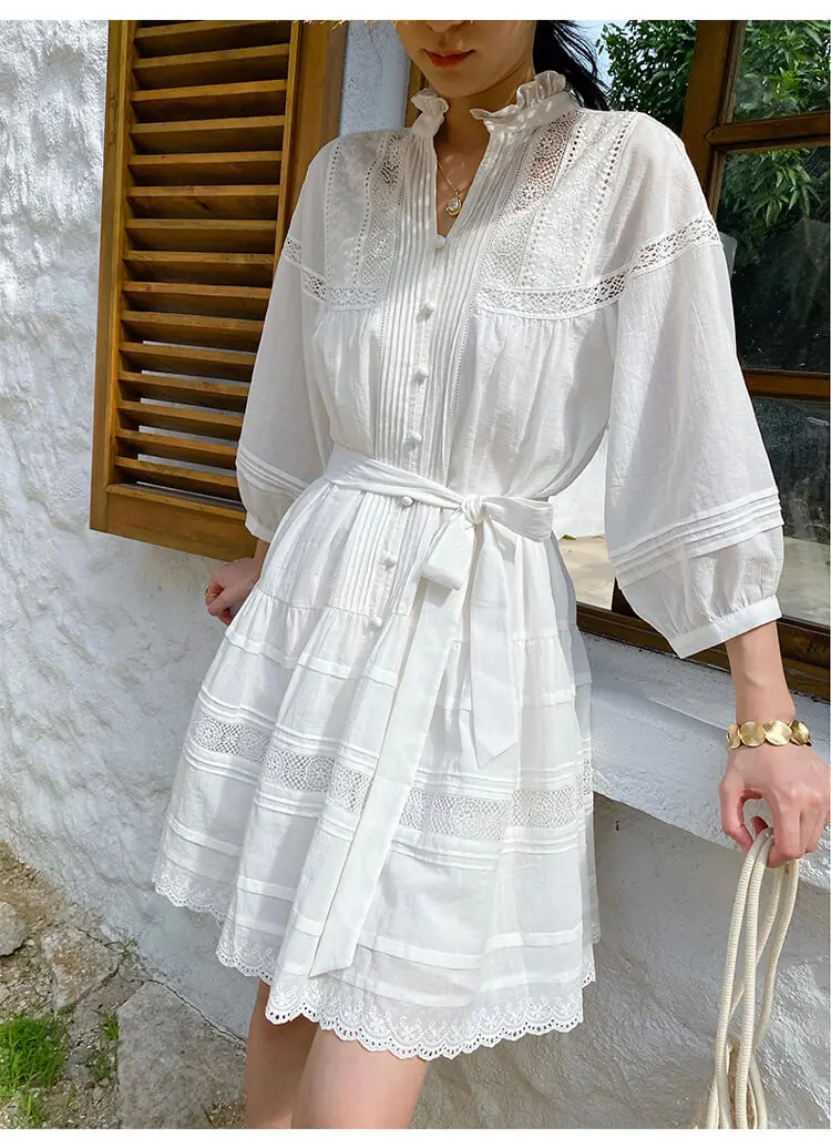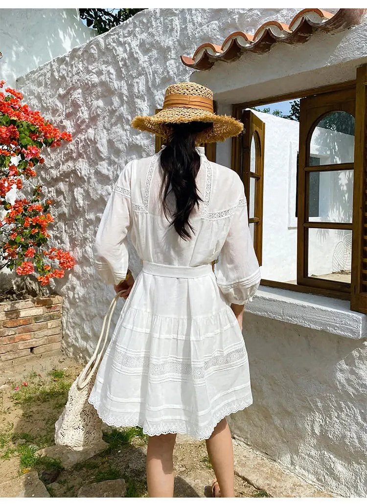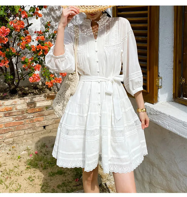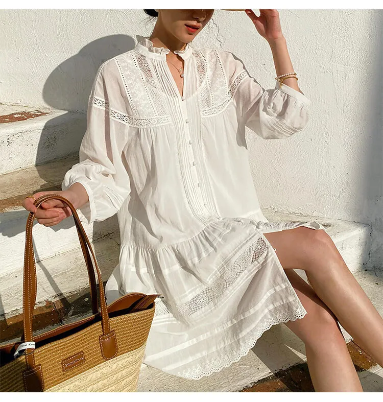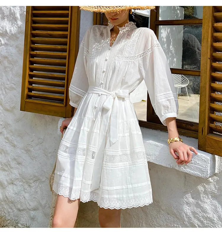 French Riviera Breathable Pure Cotton Broderie Anglaise Mini Shirt Dress