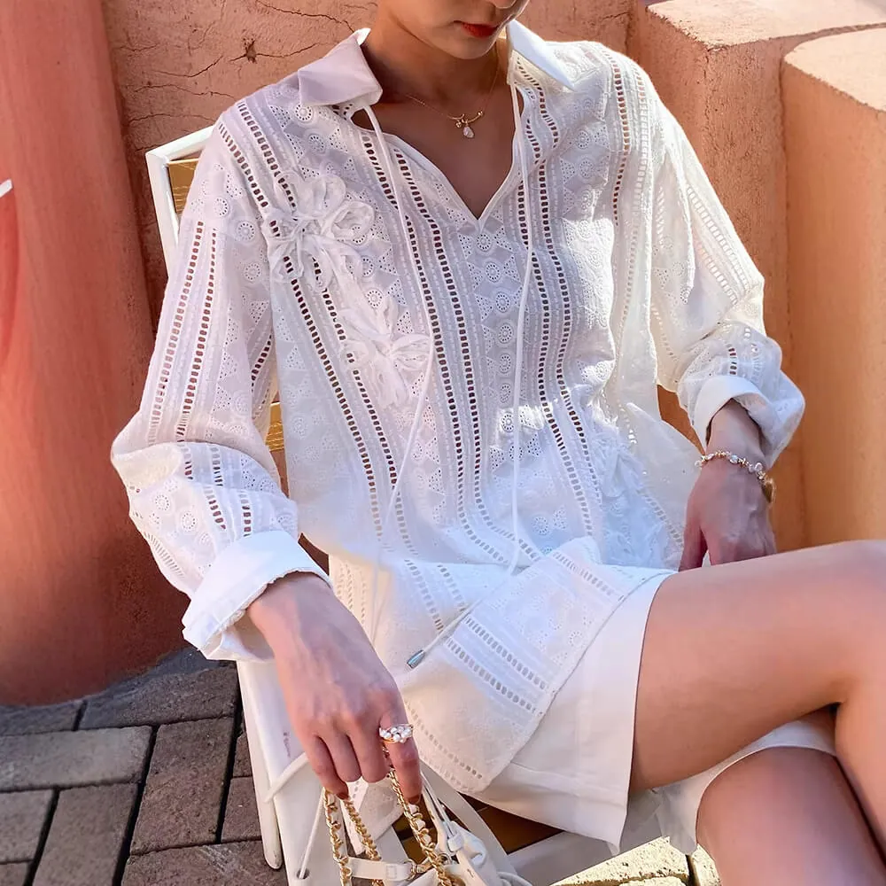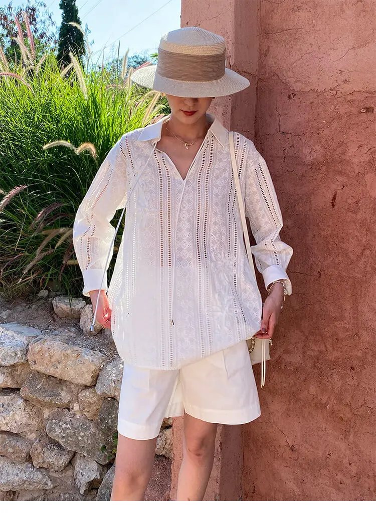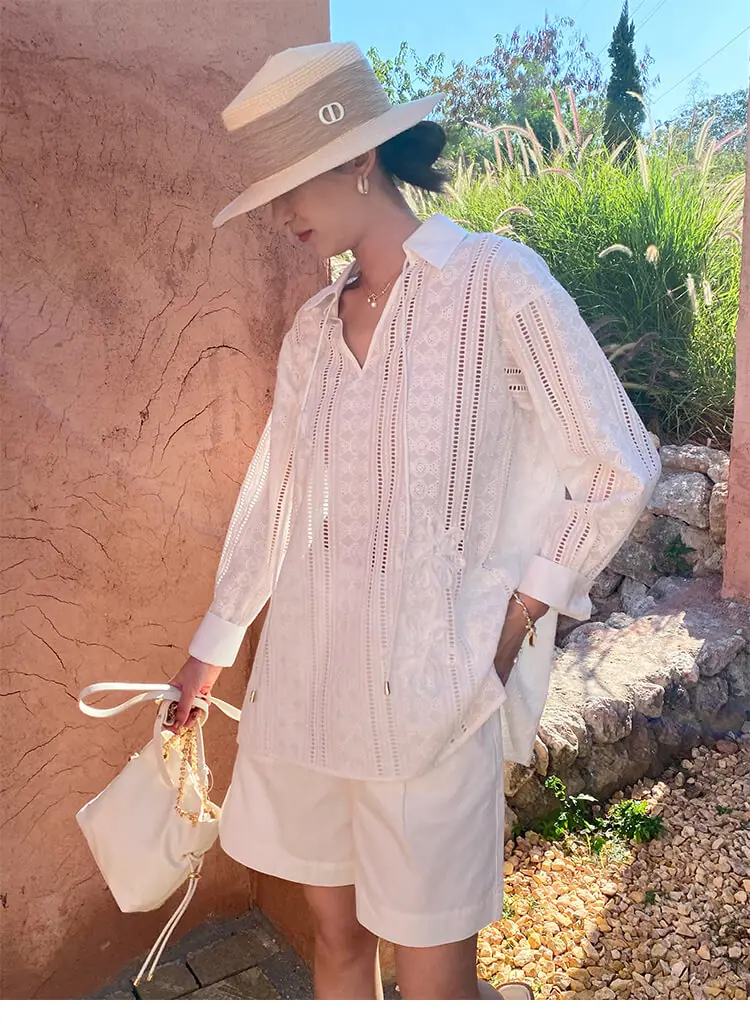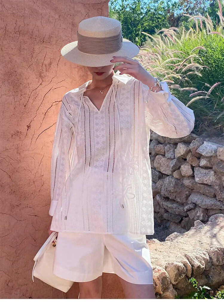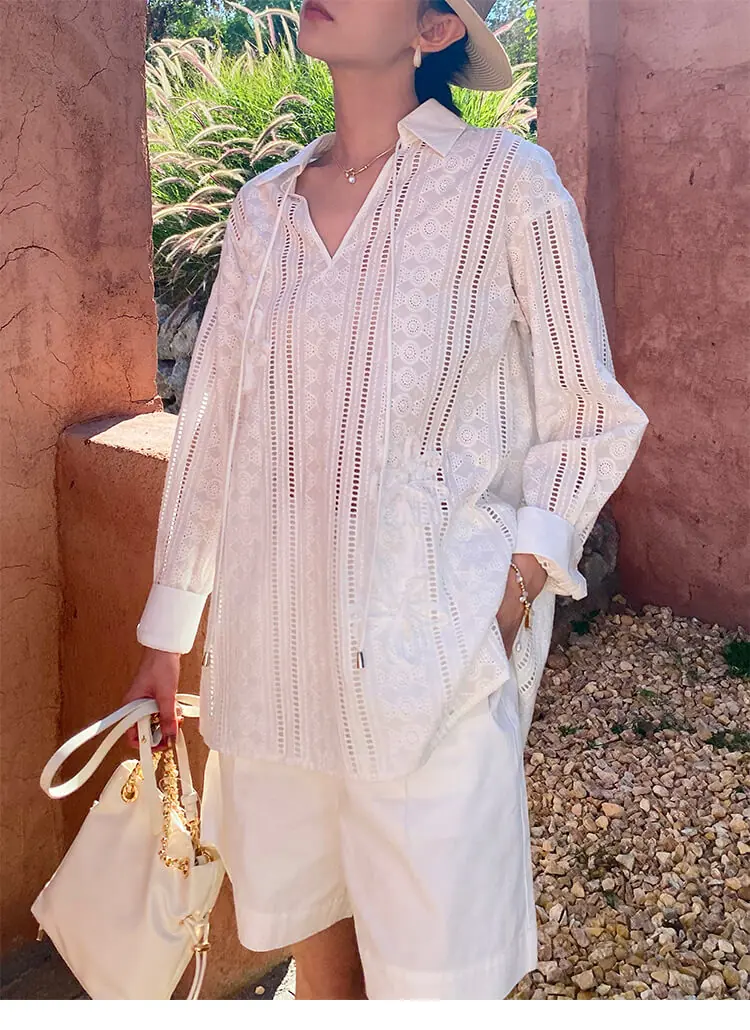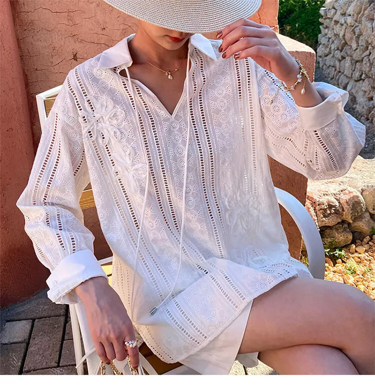French Riviera Cotton Broderie Anglaise Long Sleeve Shirt