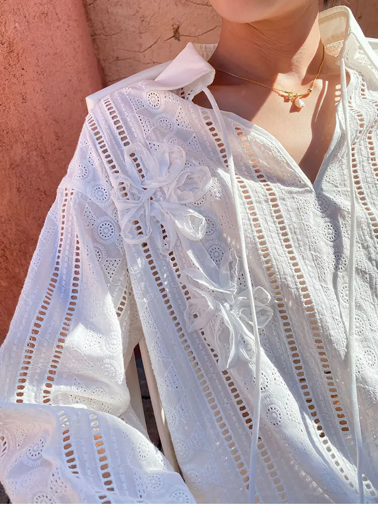 - Design: Relaxed mid-length fit, V-neck with tie fastening, allover floral embroidery and eyelet cutouts, long regular sleeves
