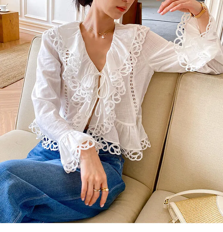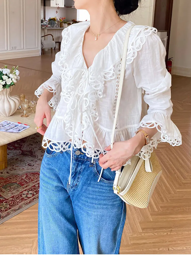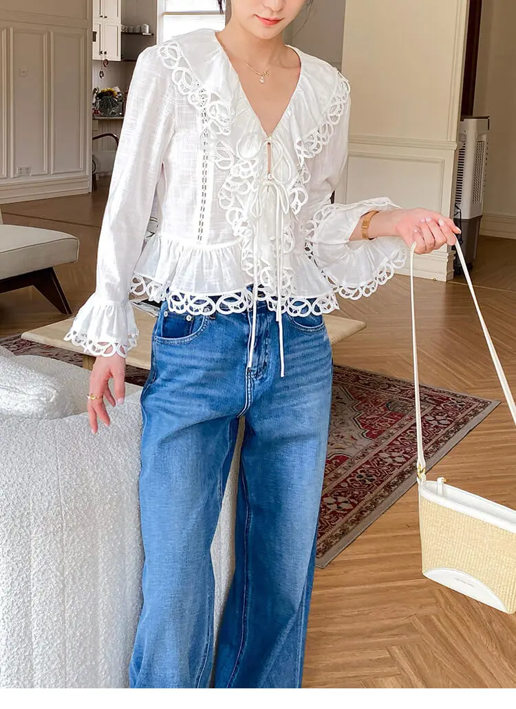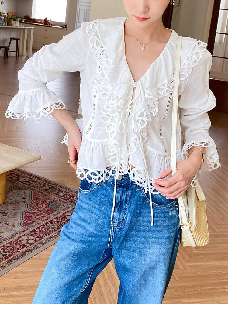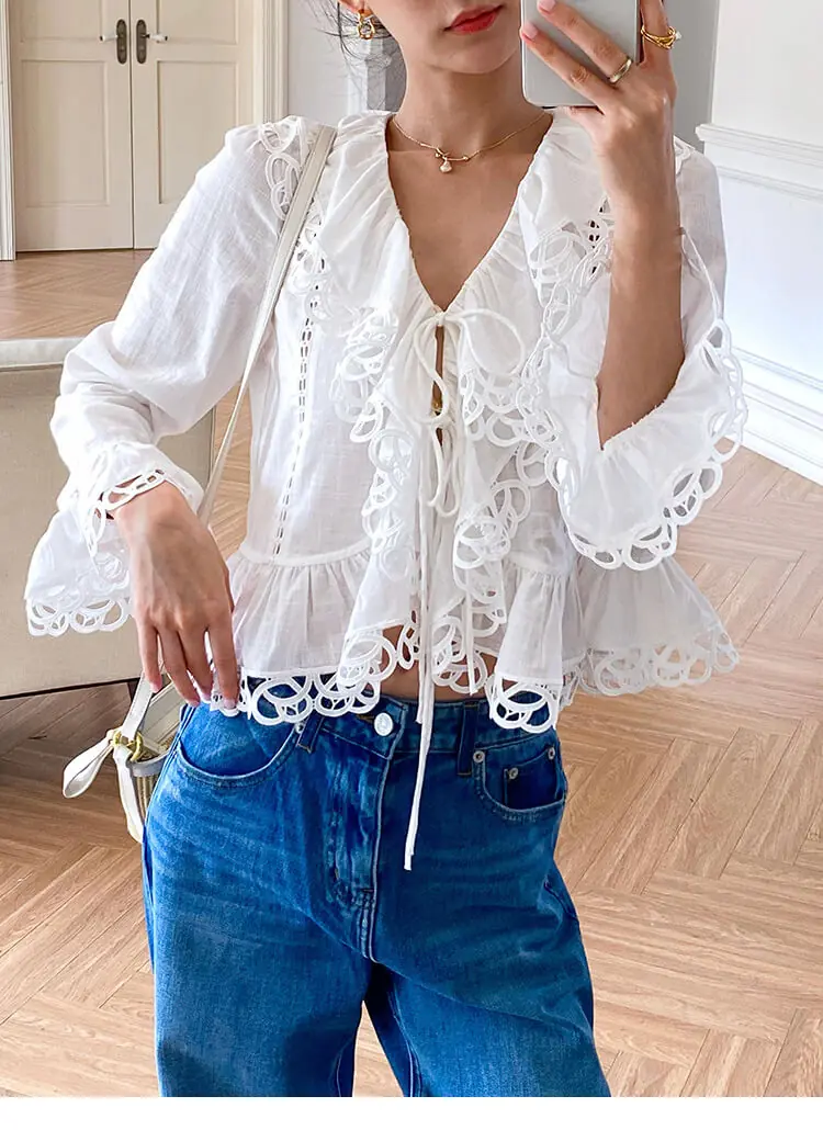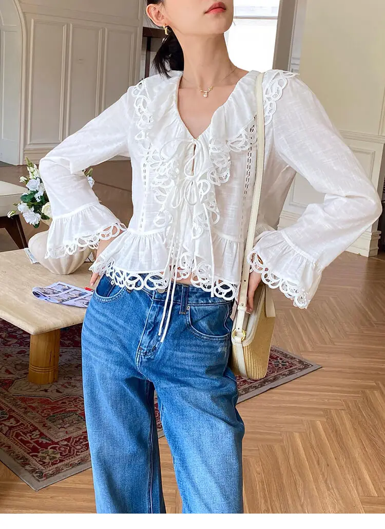 - Design: V-neck, scalloped lace trim, cutout details, flared long sleeves, cropped slim fit, two-button front tie closure