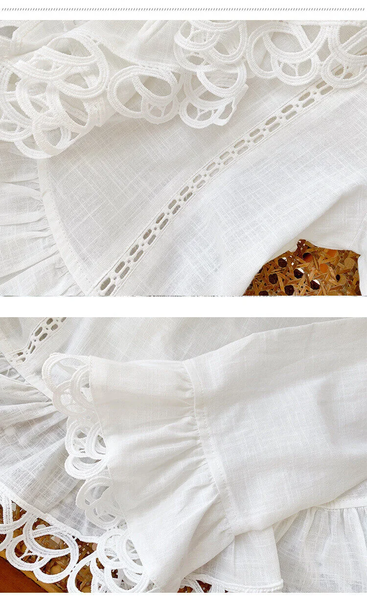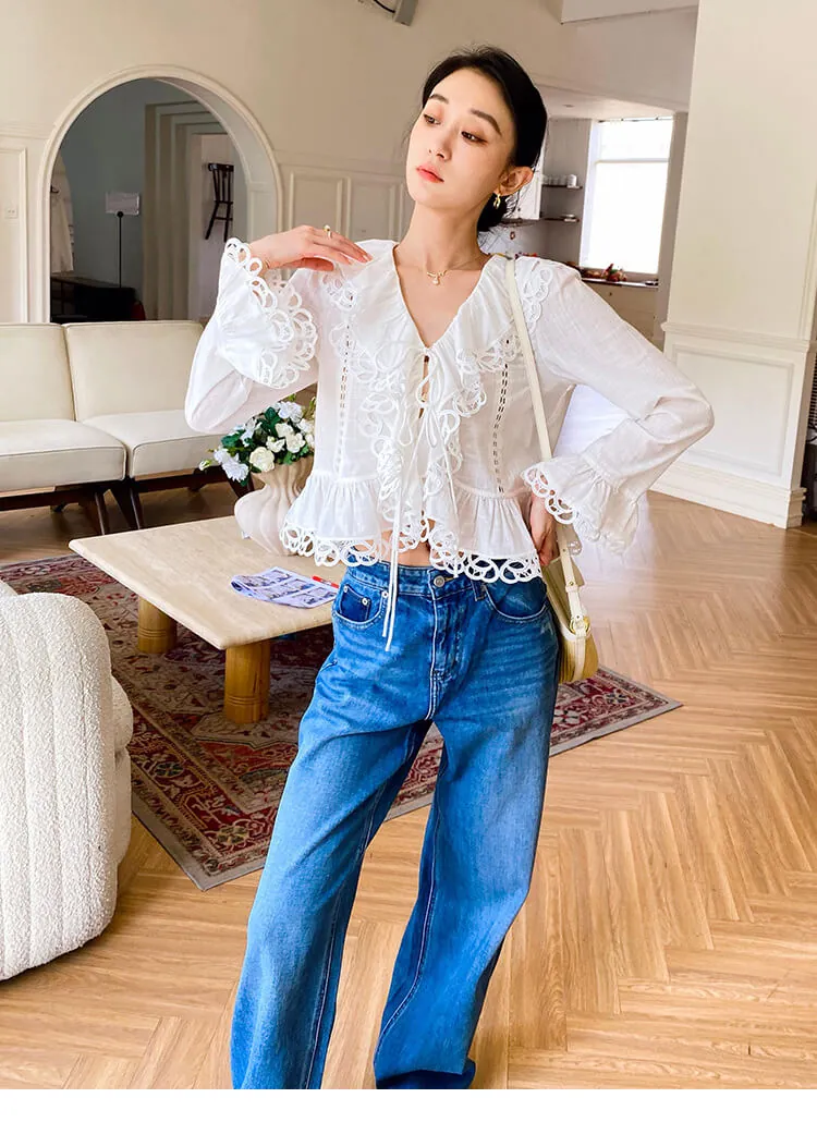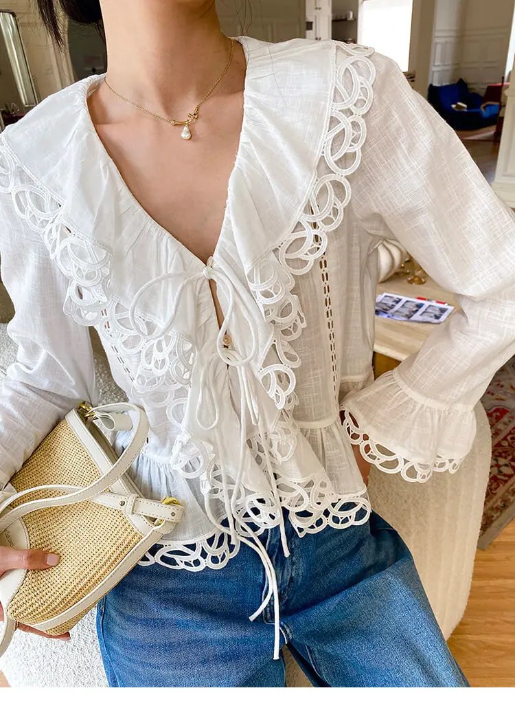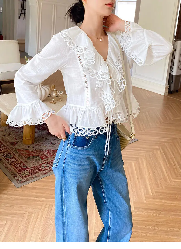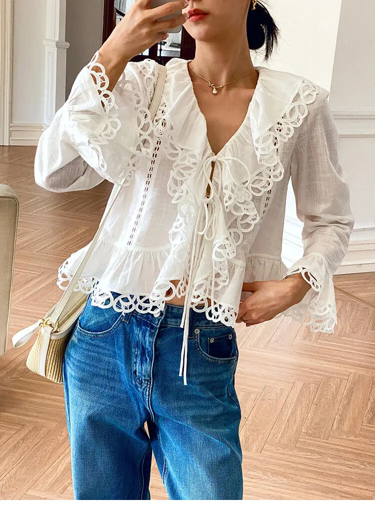 - Design: V-neck, scalloped lace trim, cutout details, flared long sleeves, cropped slim fit, two-button front tie closure