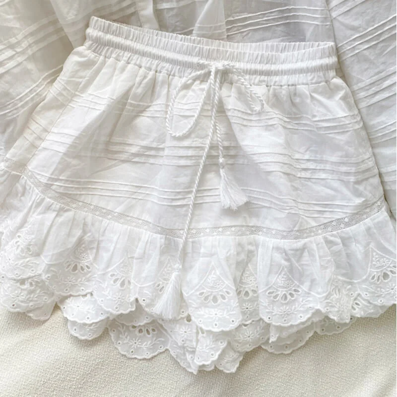 - Design: Tiered ruffled hem, delicate broderie anglaise embroidery, drawstring elasticated waist, subtle crochet cutout details