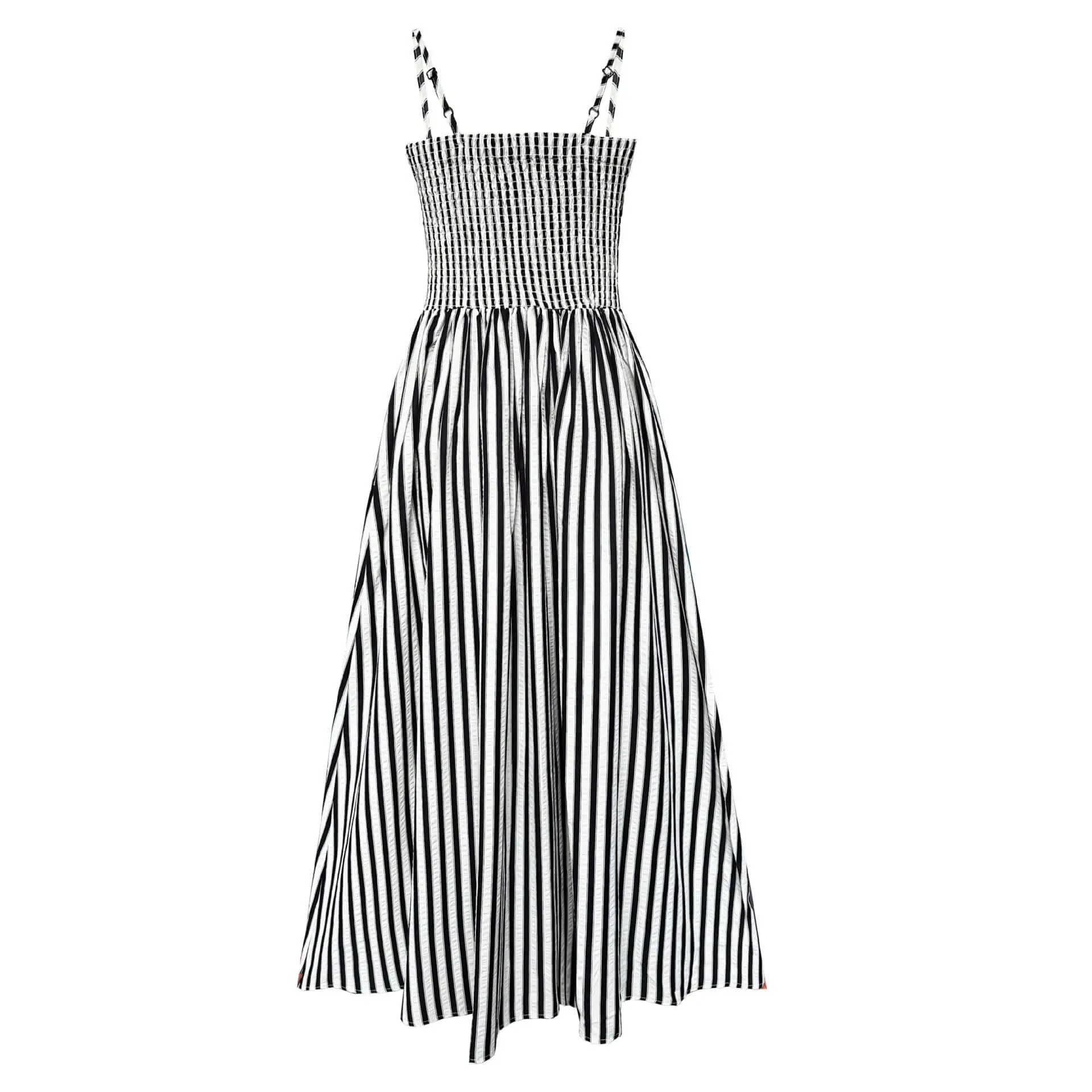 - Design: Vertical stripe print, ruched square neckline, adjustable spaghetti straps, high-waisted flowy A-line maxi cut, hidden side pockets, non-slip inner bust lining, smocked back for stretch