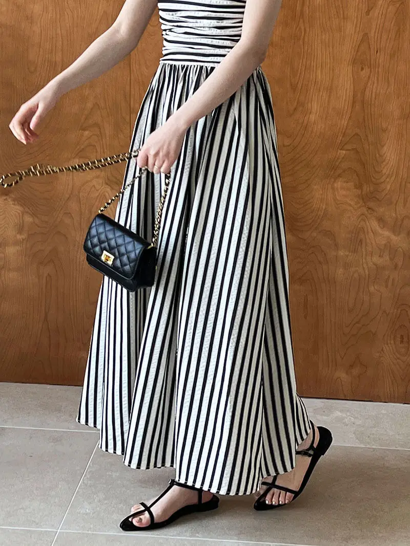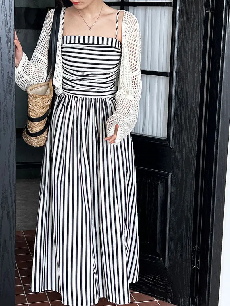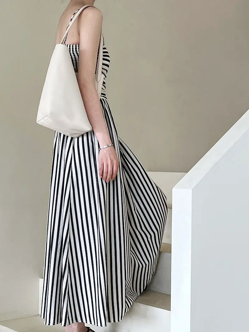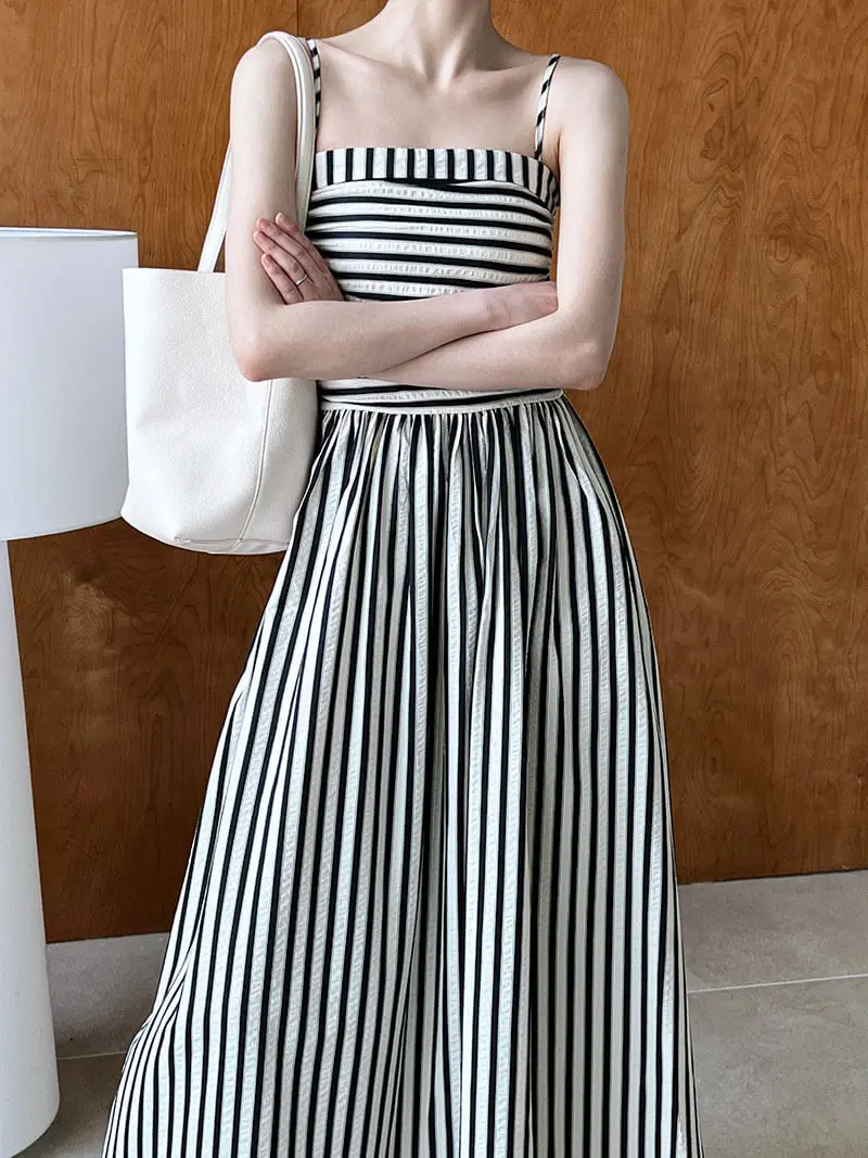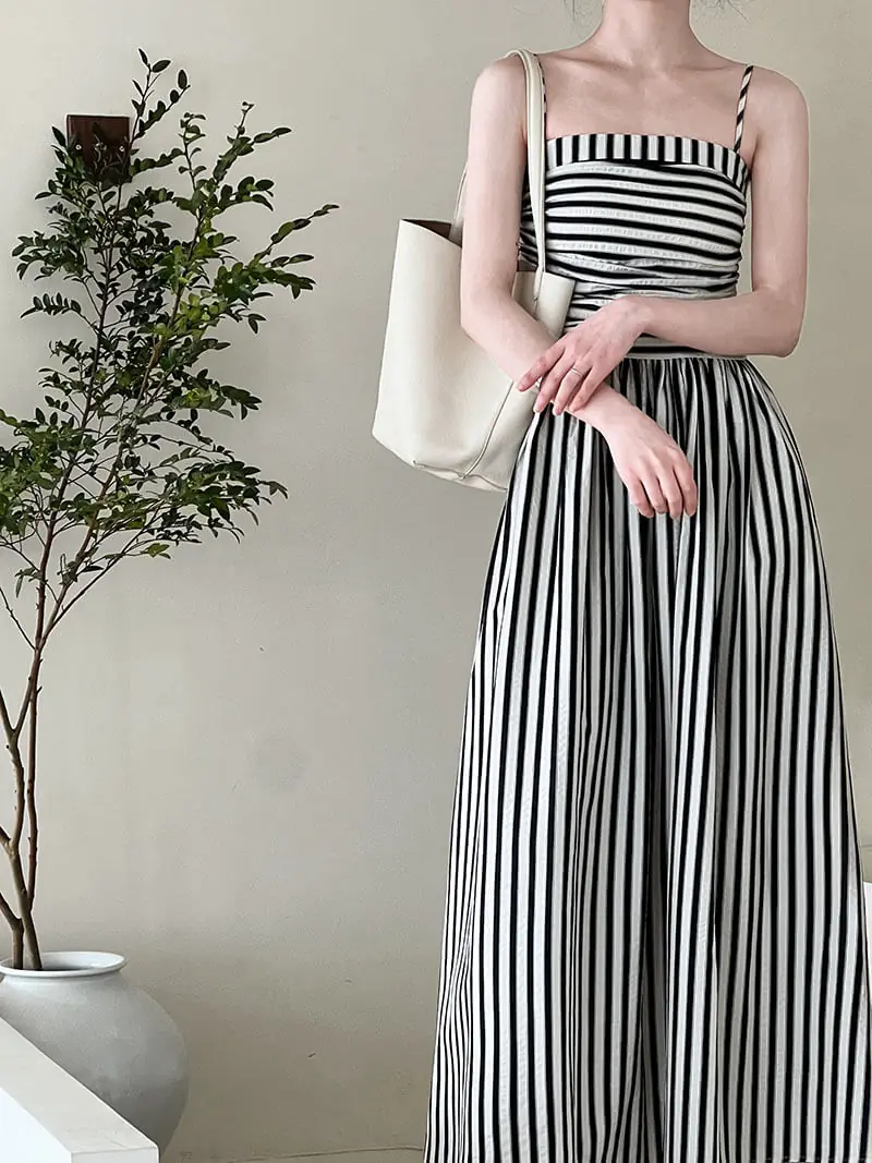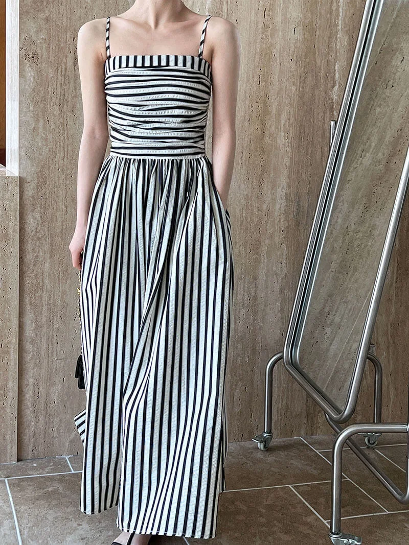 French Style Crinkled Striped Cotton Blend Spaghetti Strap Maxi Dress