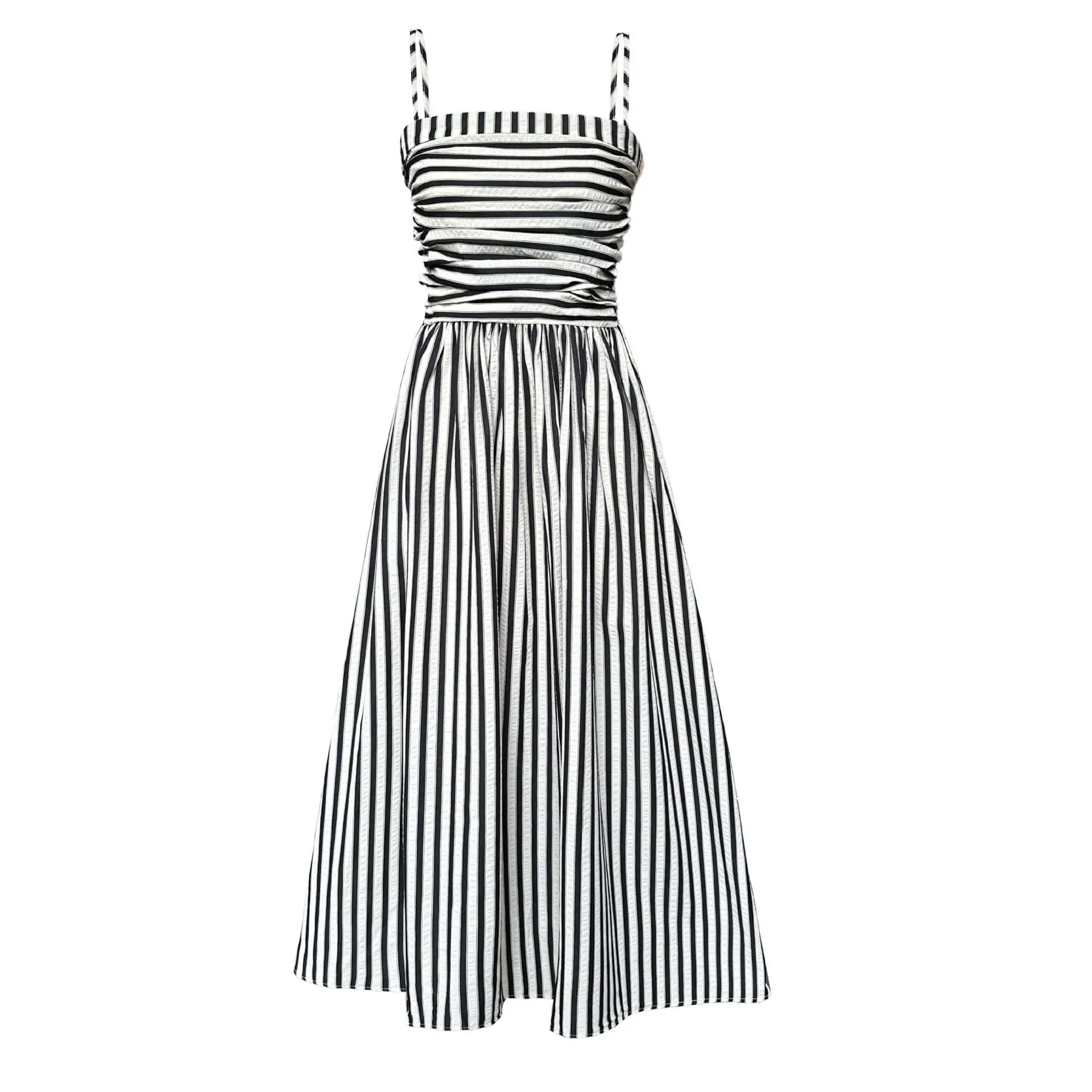 Breathable soft cotton blend sits gently against your skin as the flowy A-line skirt sways with every step. Classic vertical stripes and a figure-flattering ruched bodice bring effortless French Riviera charm to all your warm-weather outings.