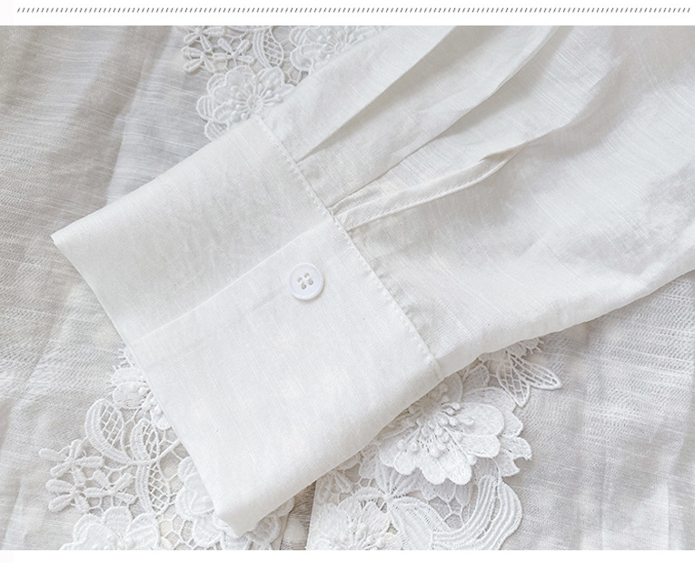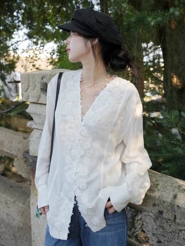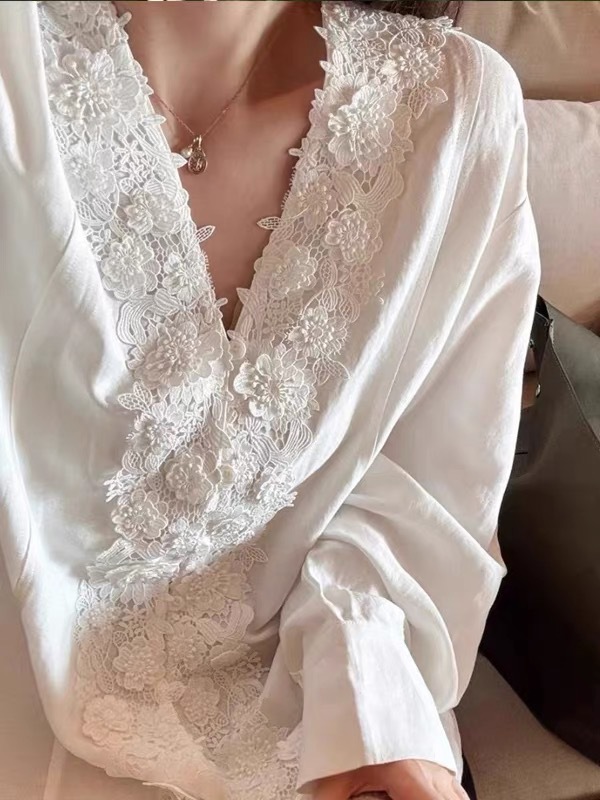 - Design Details: V – neck, long regular sleeves, lace patchwork, single – breasted placket, straight fit, three – dimensional cutout, regular length