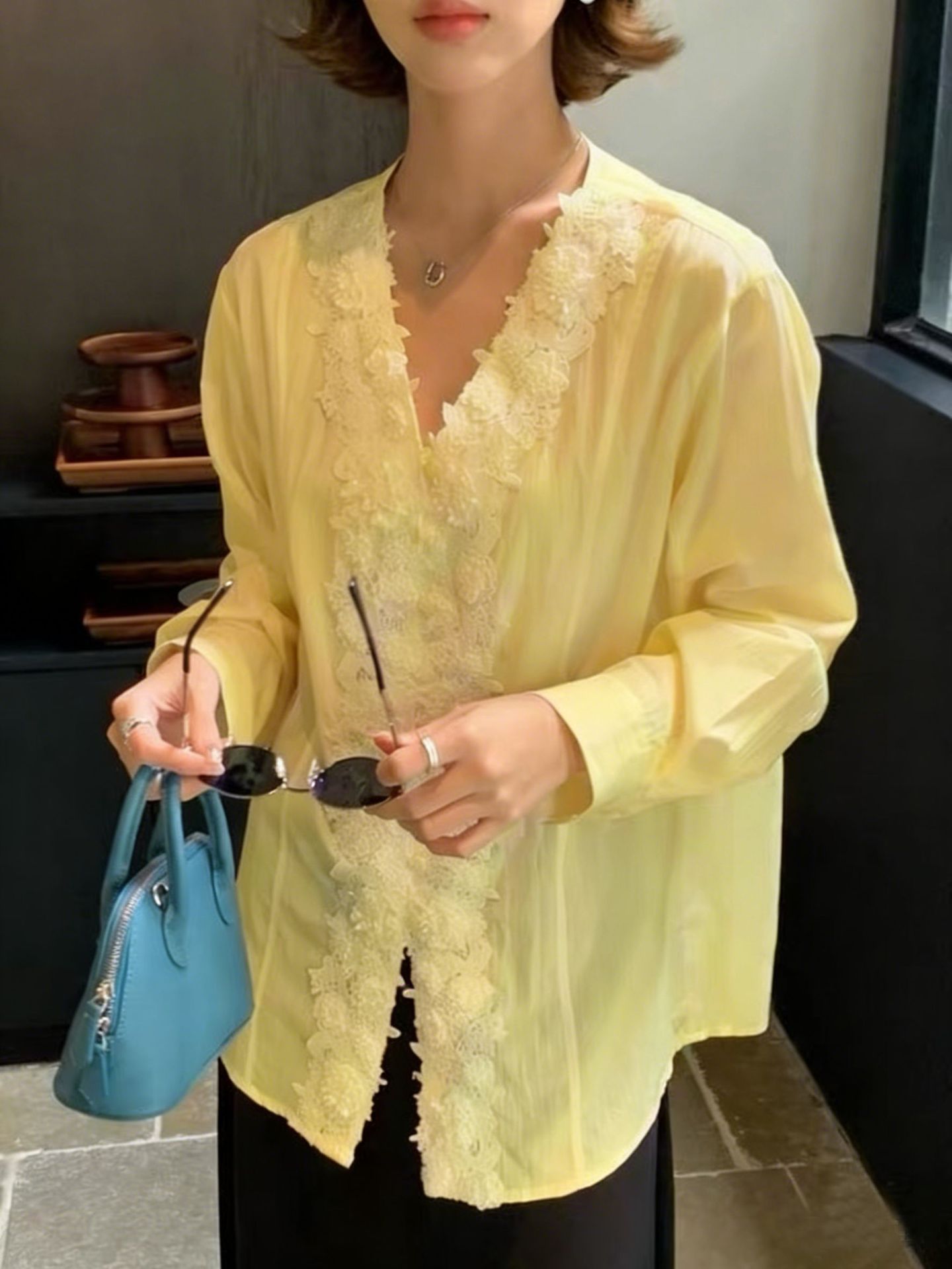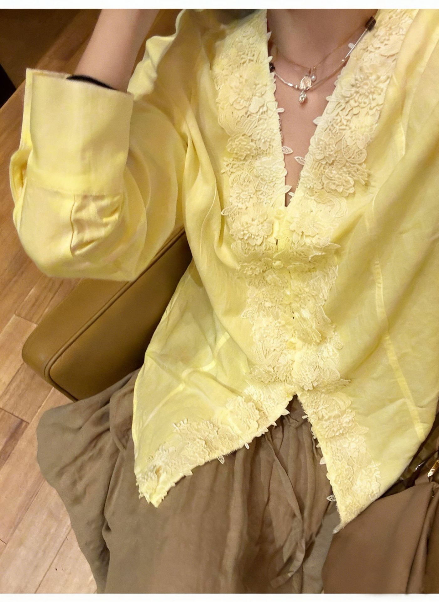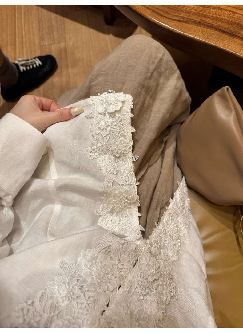 Upgrade your spring wardrobe with this French – style long – sleeve shirt! Made from a blend of linen and Tencel (Lyocell), it offers a soft, breathable feel perfect for warmer days. The V – neck design and delicate lace patchwork add a touch of romance, while the straight fit and single – breasted placket keep it effortlessly chic. With regular sleeves and a three – dimensional cutout detail, this solid – colored shirt works great for the office, casual outings, or even a brunch date. Available in White and Yellow, it’s the ideal piece to bring a French – inspired elegance to your everyday look.