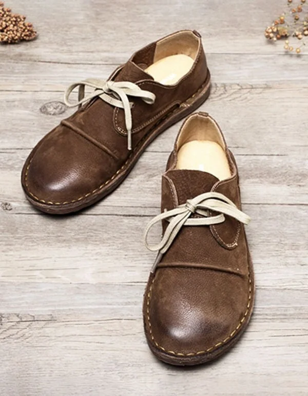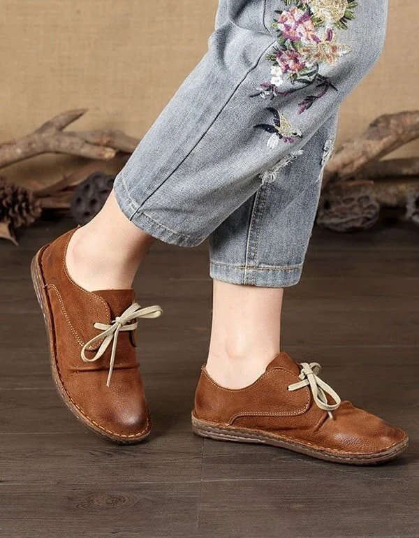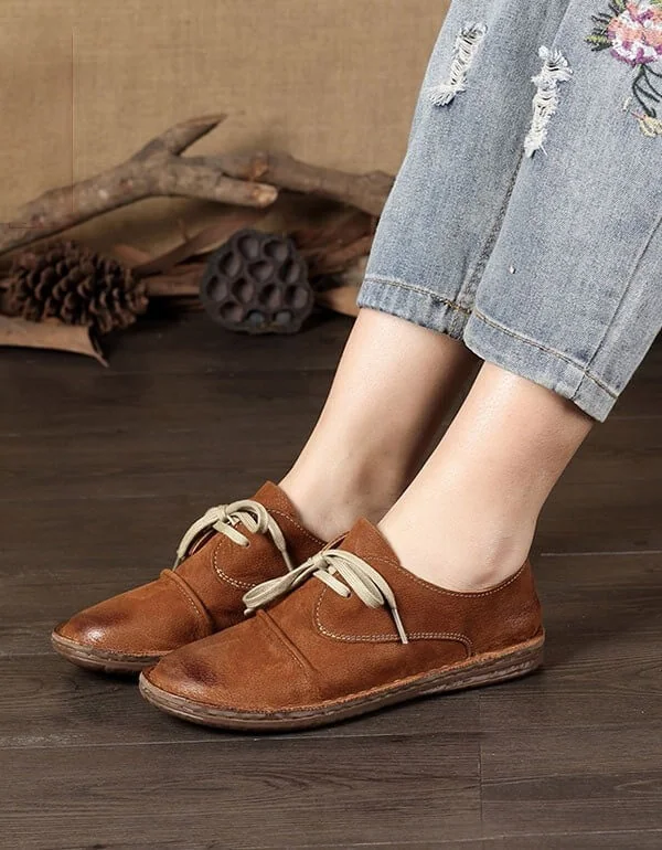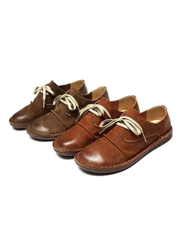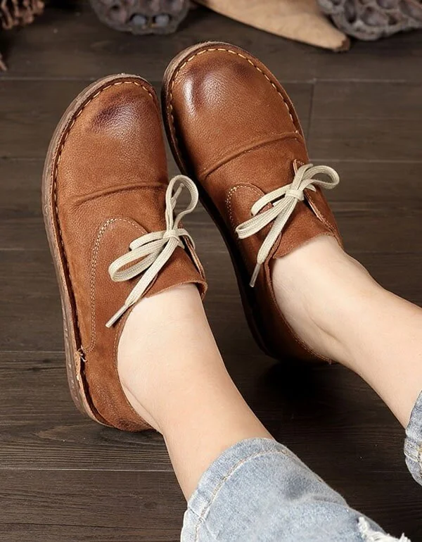 Handmade Leather Lace Up Round Head Flat Shoes Flat Shoes