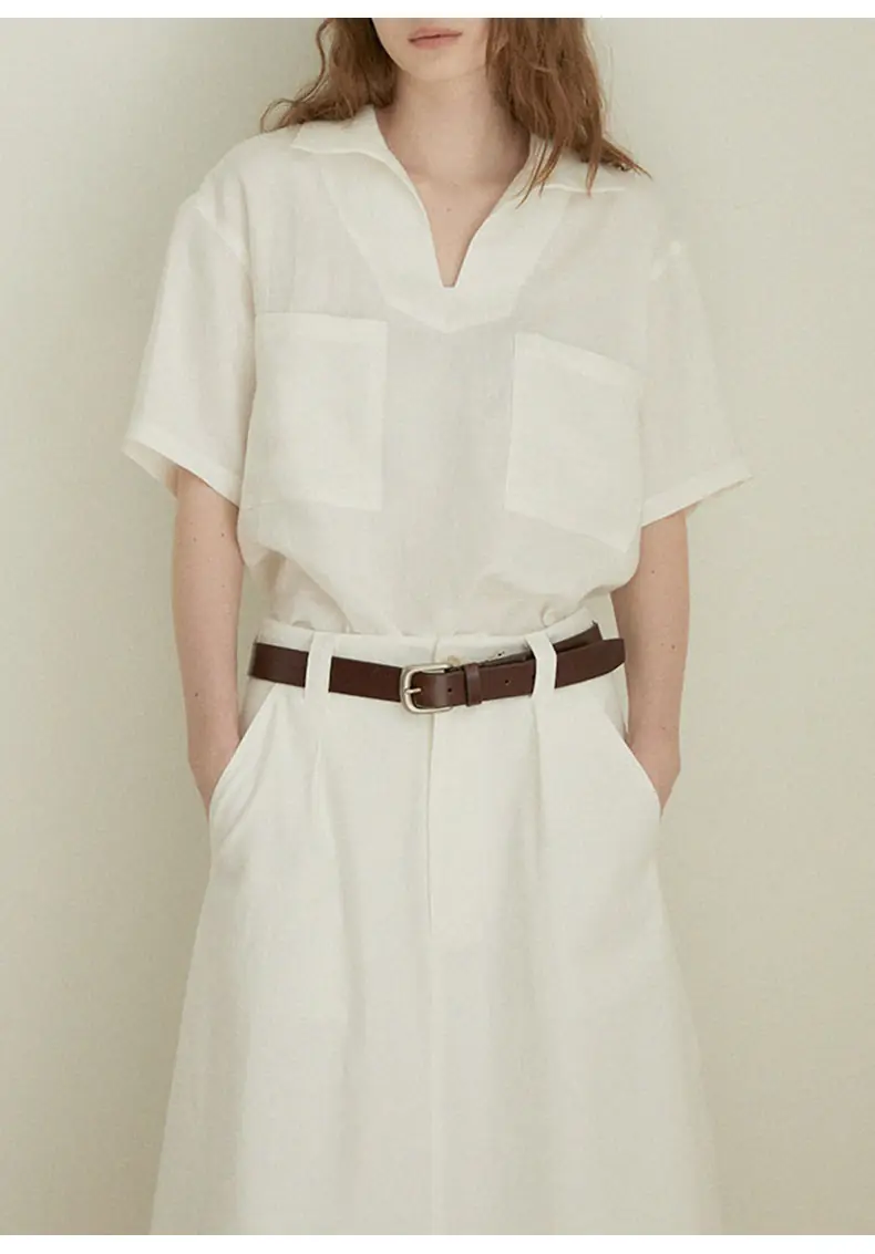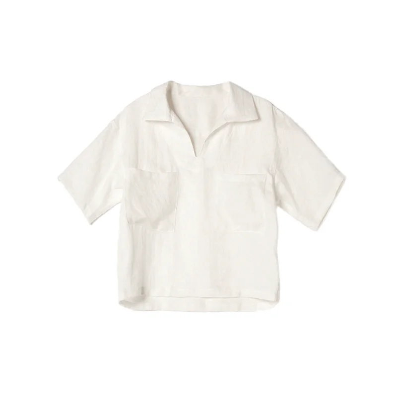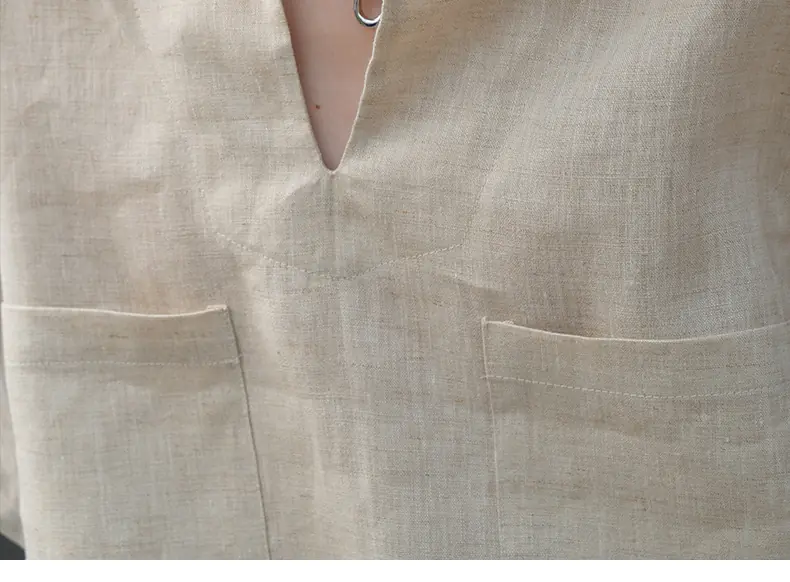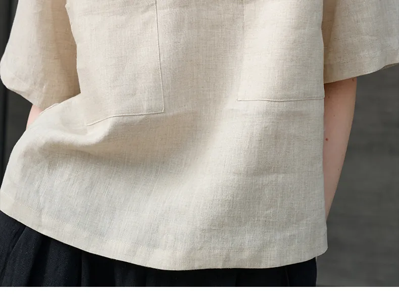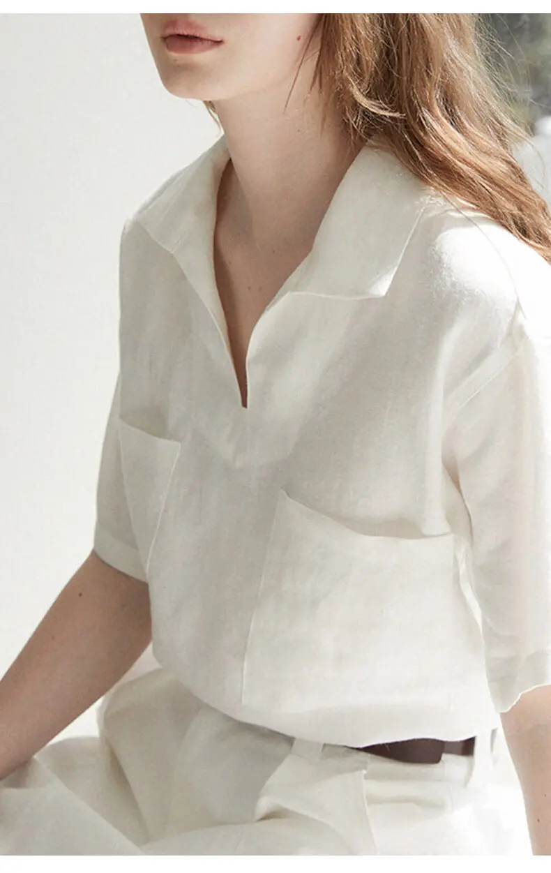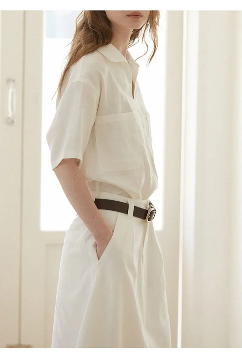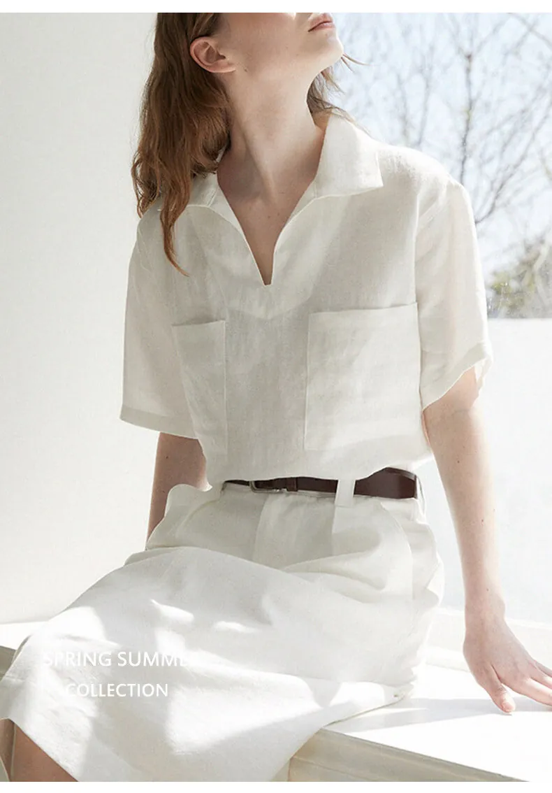 Minimalist Breathable Pure Linen V Neck Short Sleeve Shirt