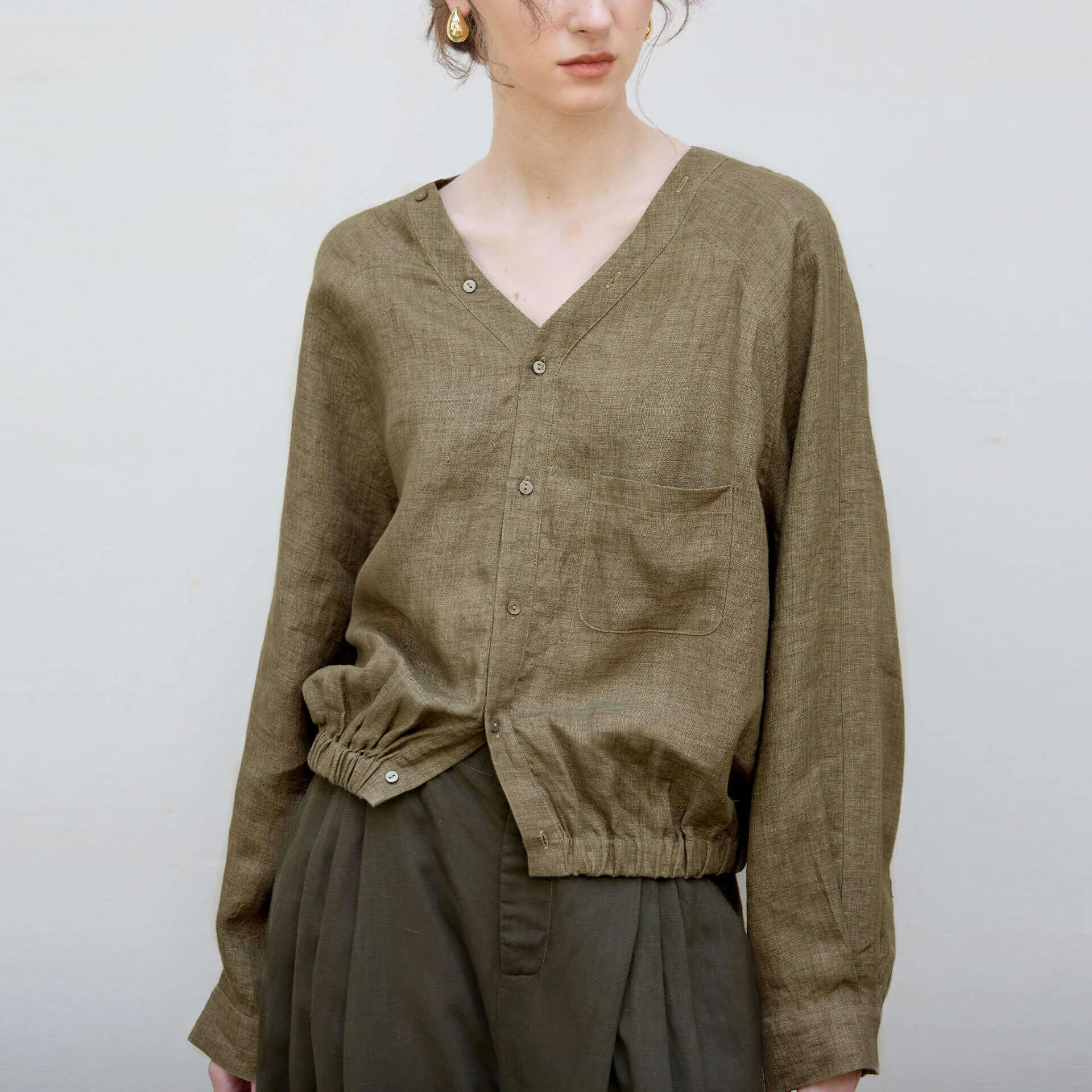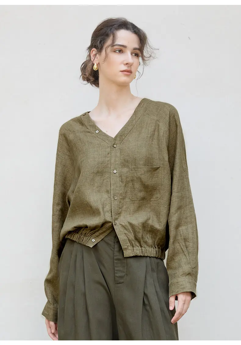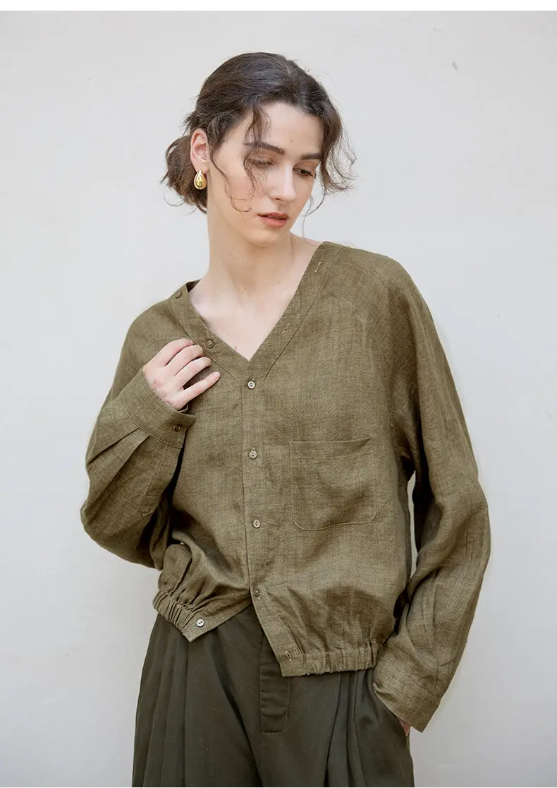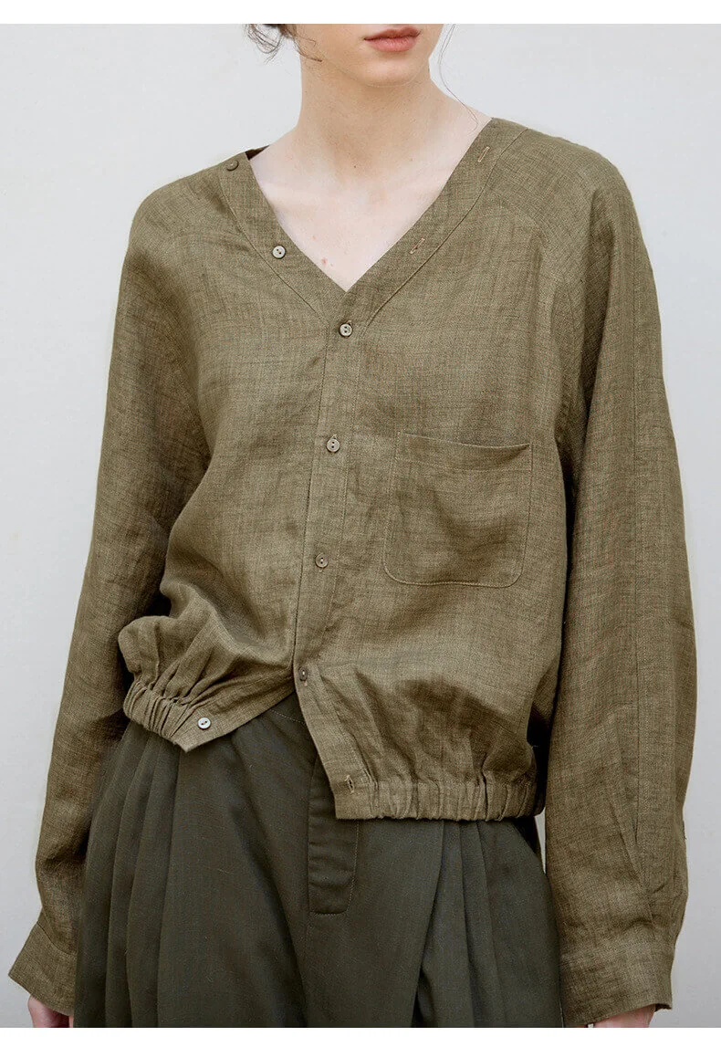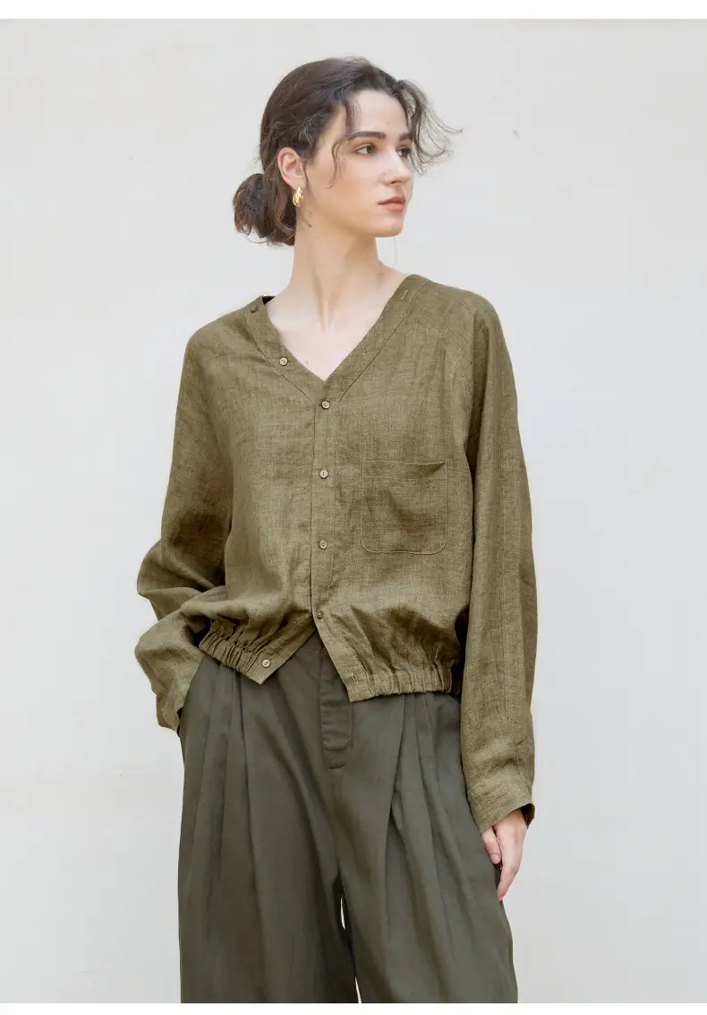 Minimalist Sustainable Linen V Neck Long Sleeve Cropped Shirt