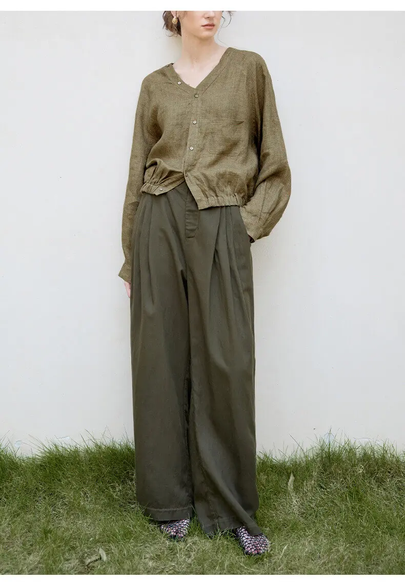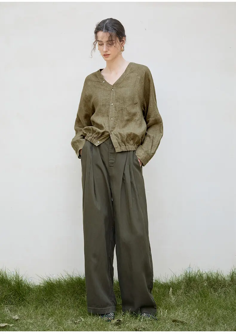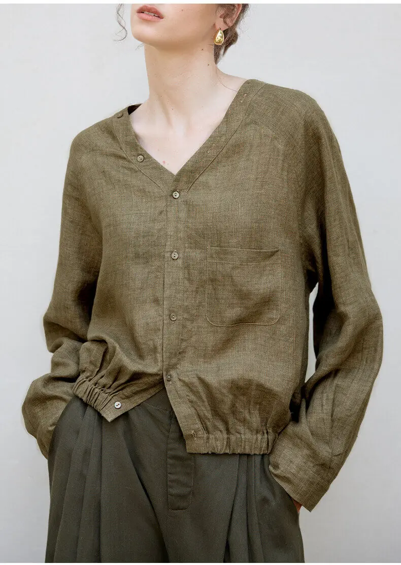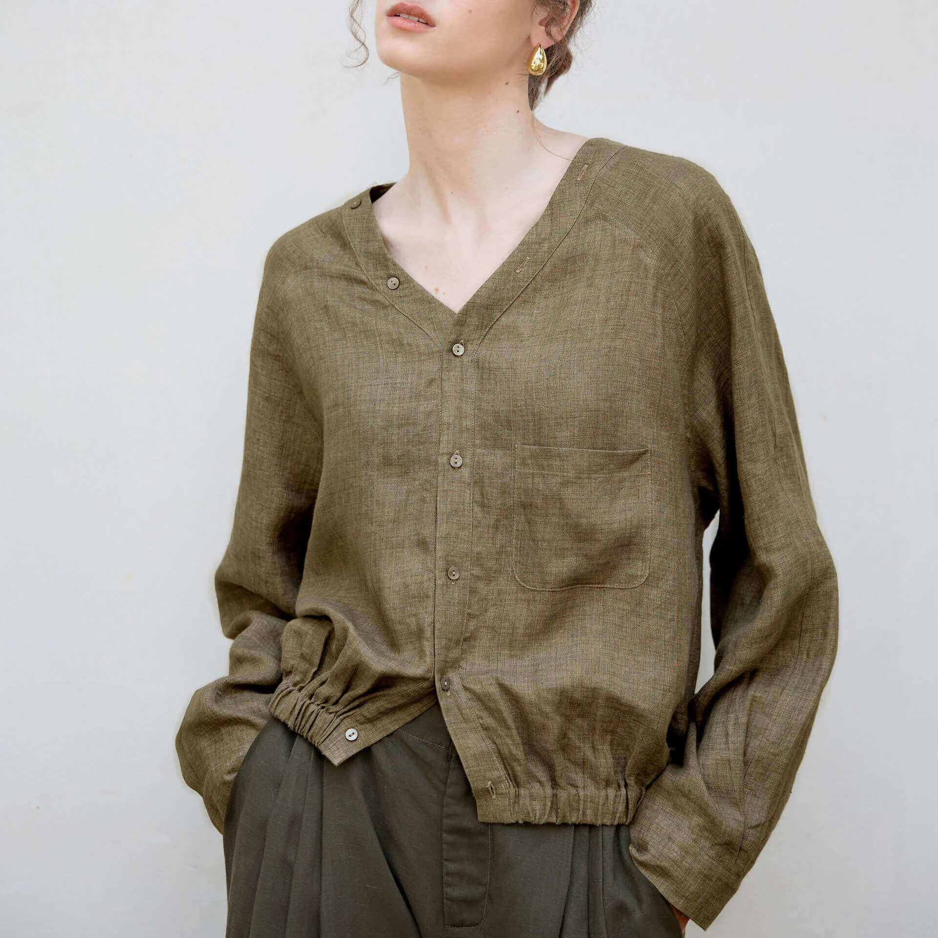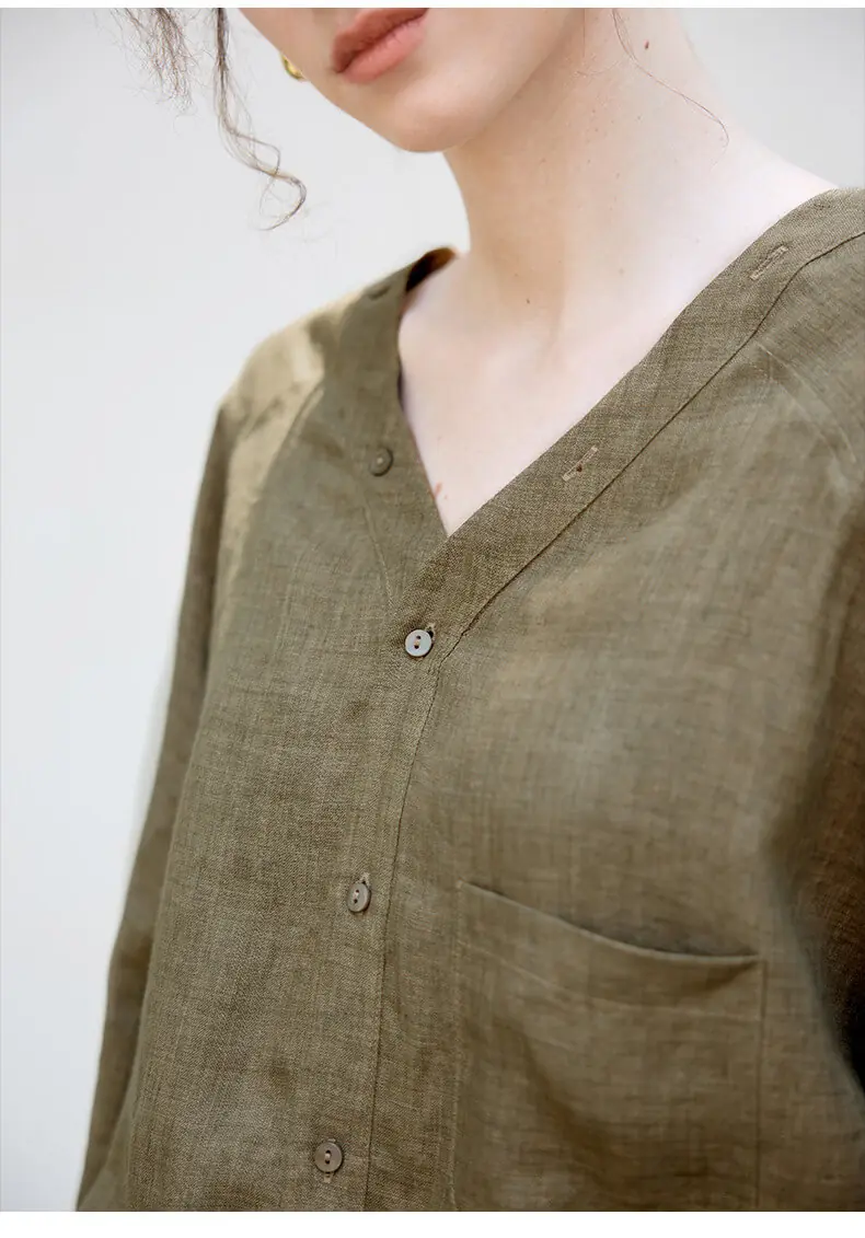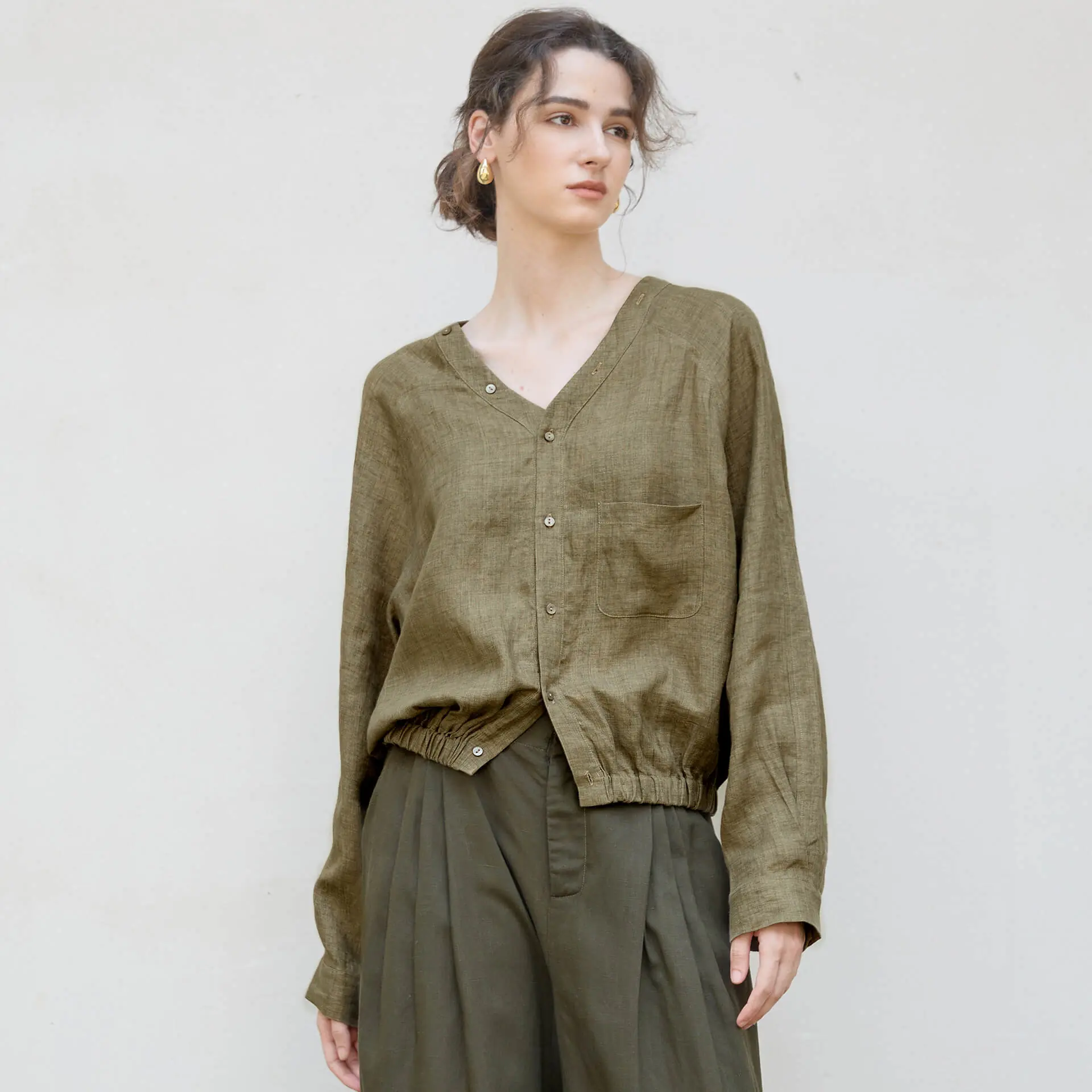 Minimalist Sustainable Linen V Neck Long Sleeve Cropped Shirt