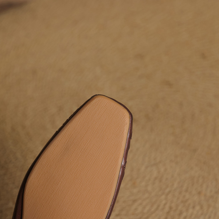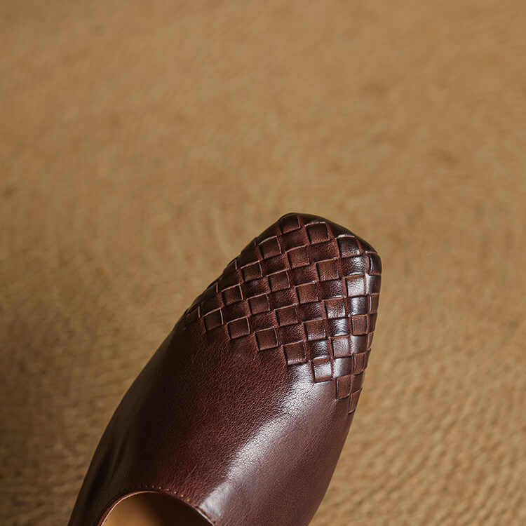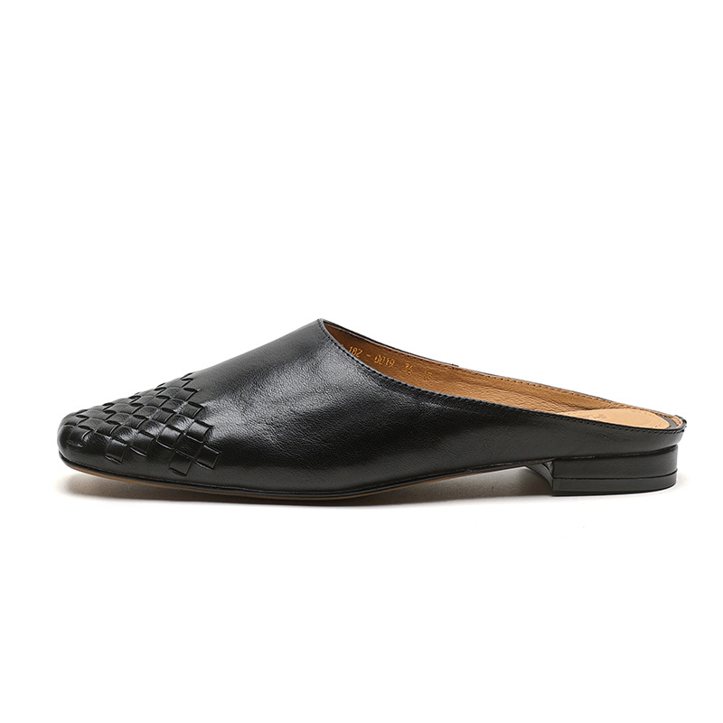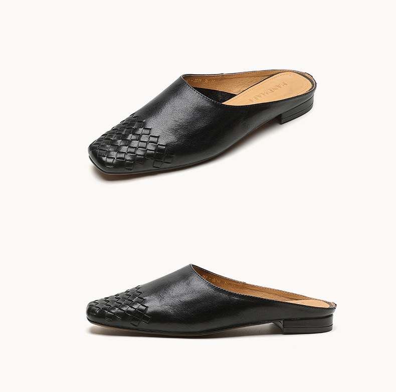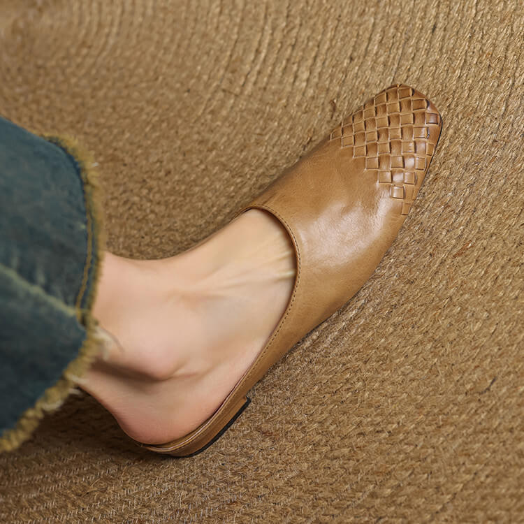 Minimalist Woven Genuine Leather Womens Square Toe Flat Mules