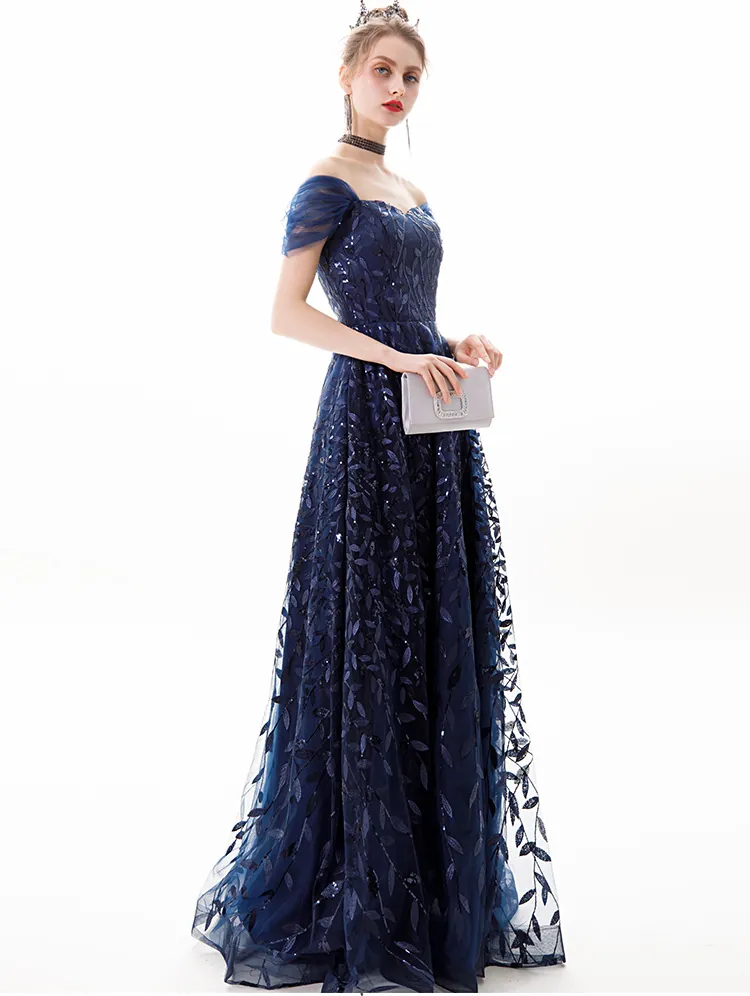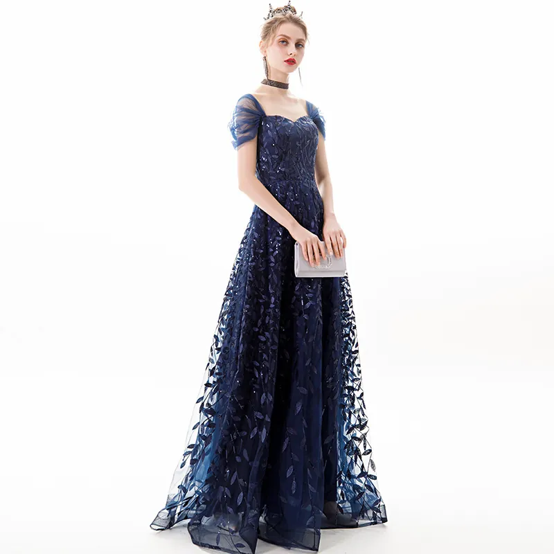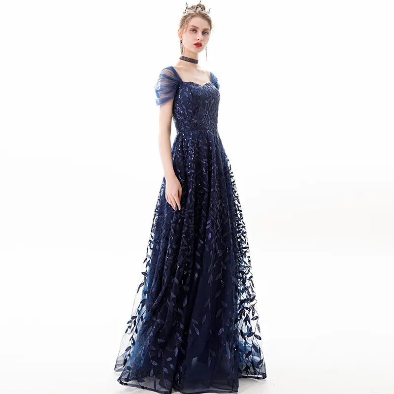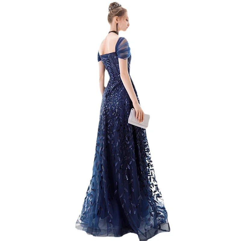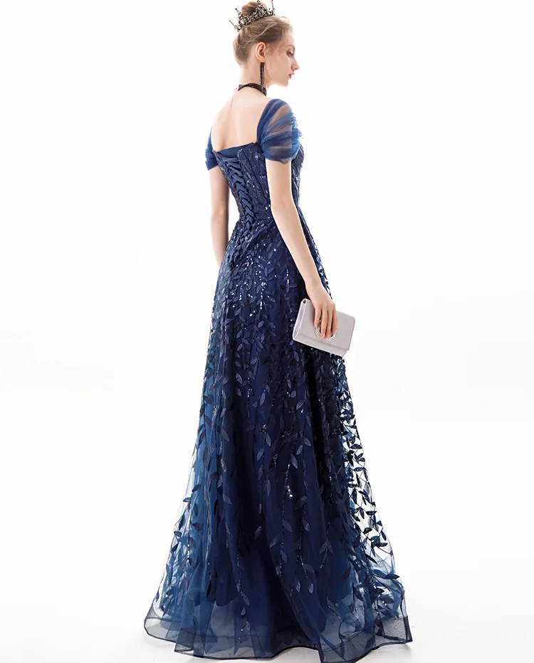 Navy Blue Lace Sleeveless High Waist Long Evening Gown Elegant Party Dress