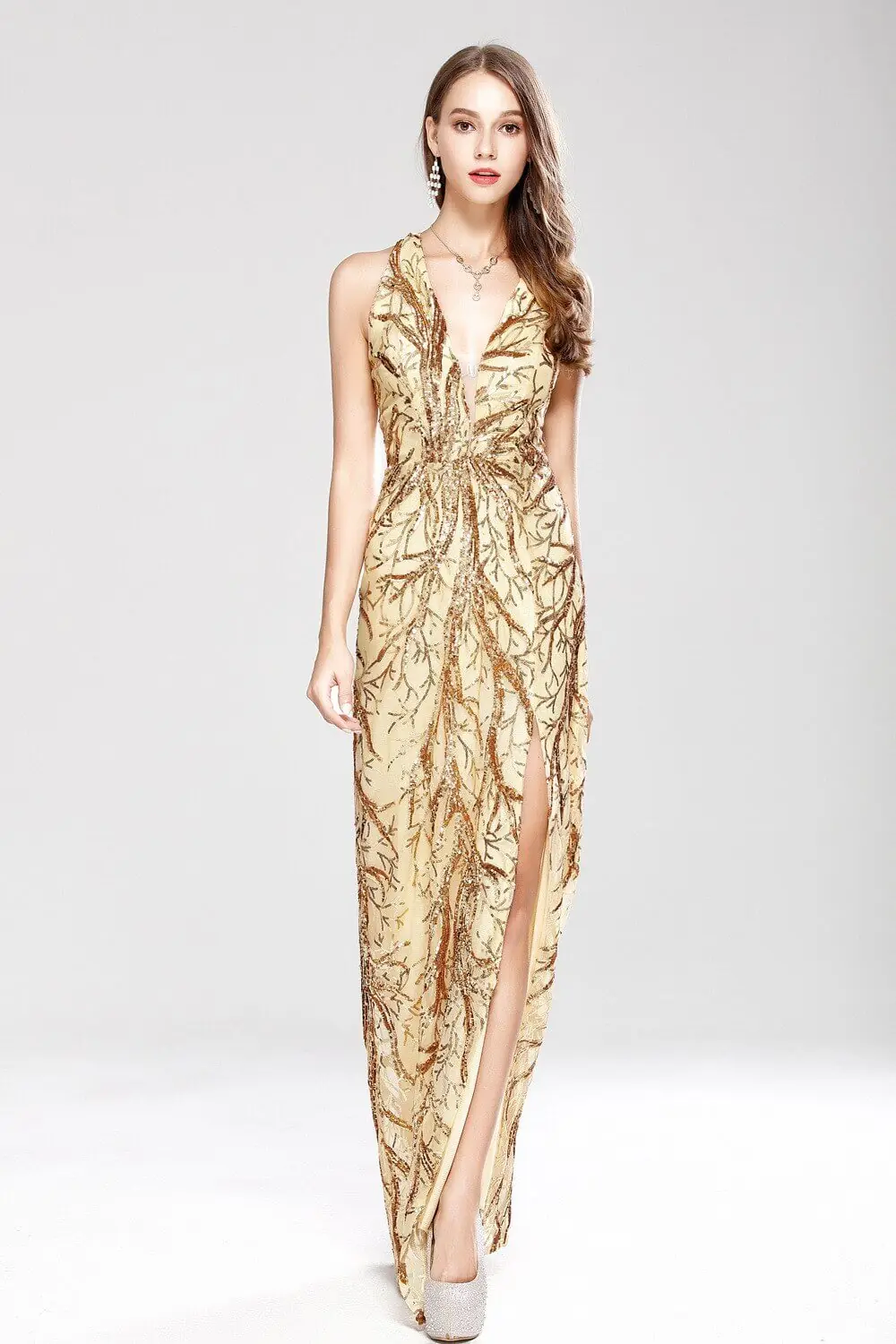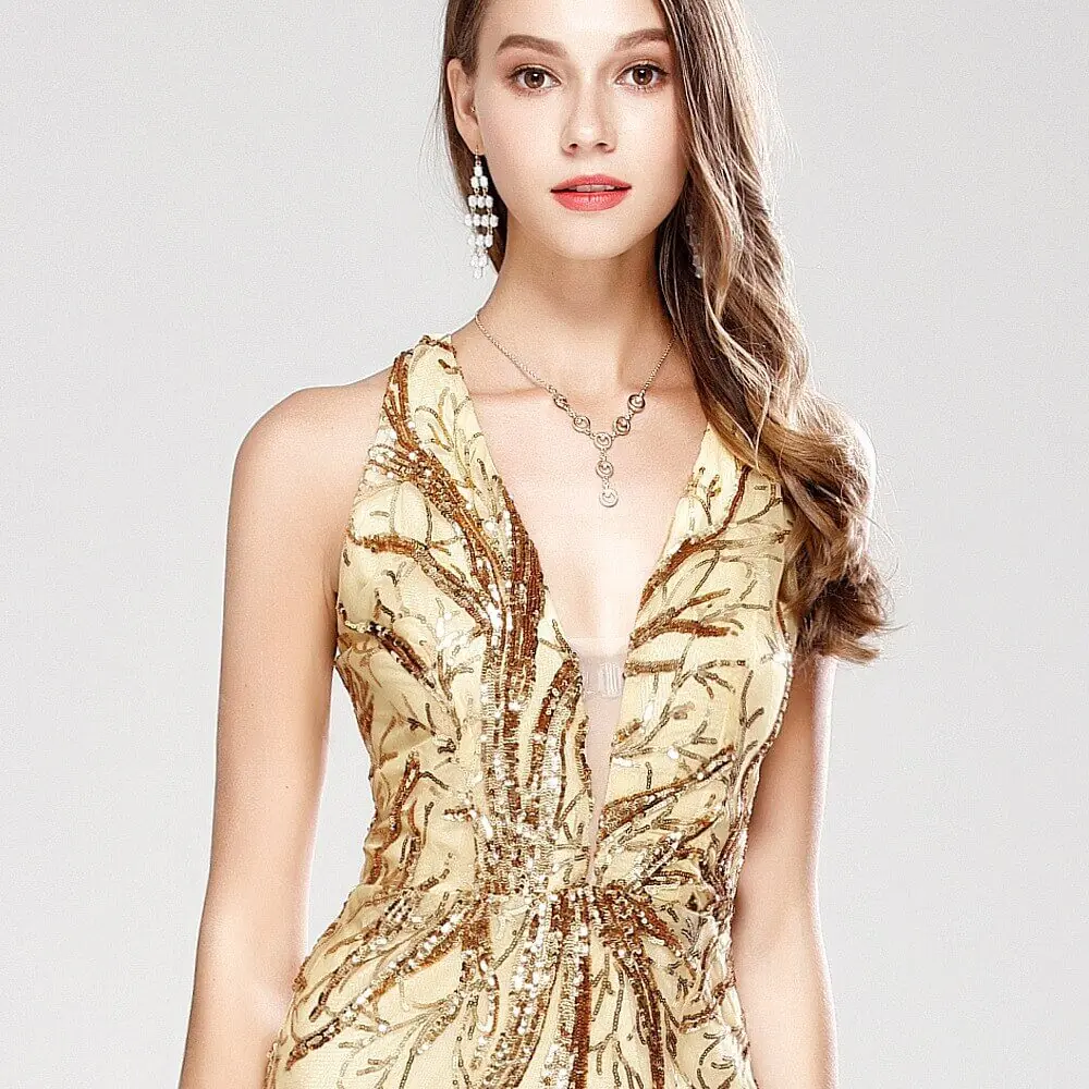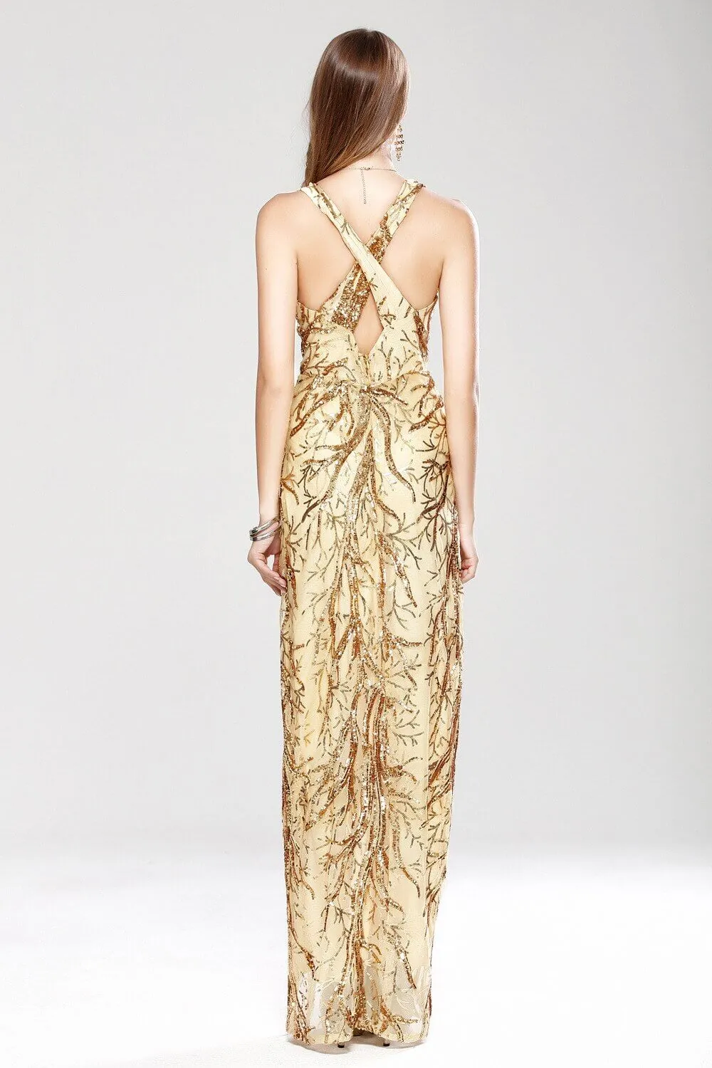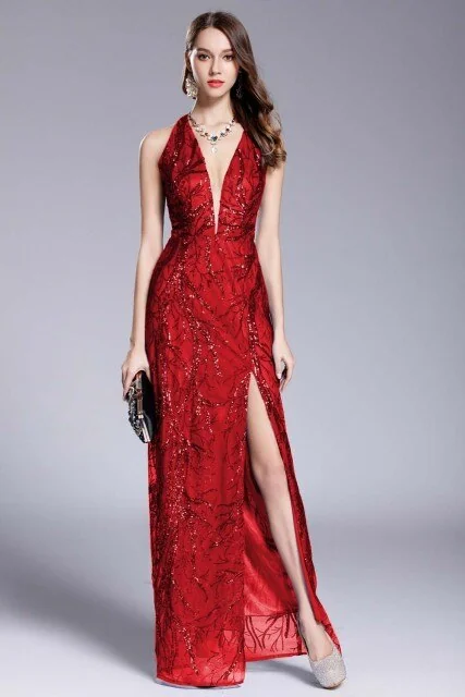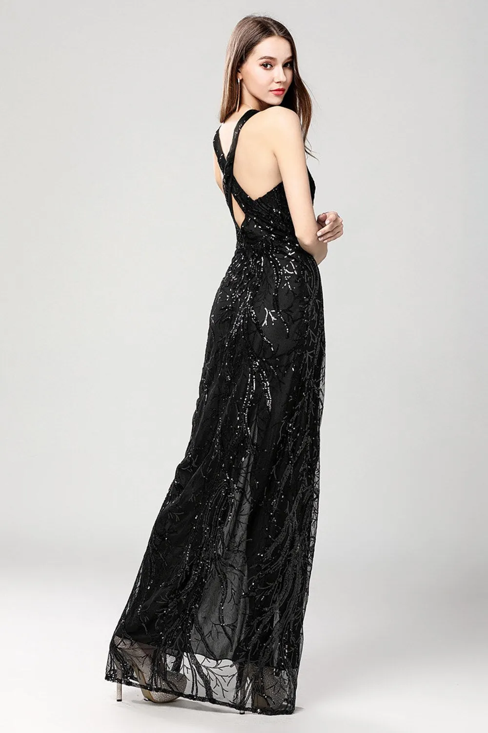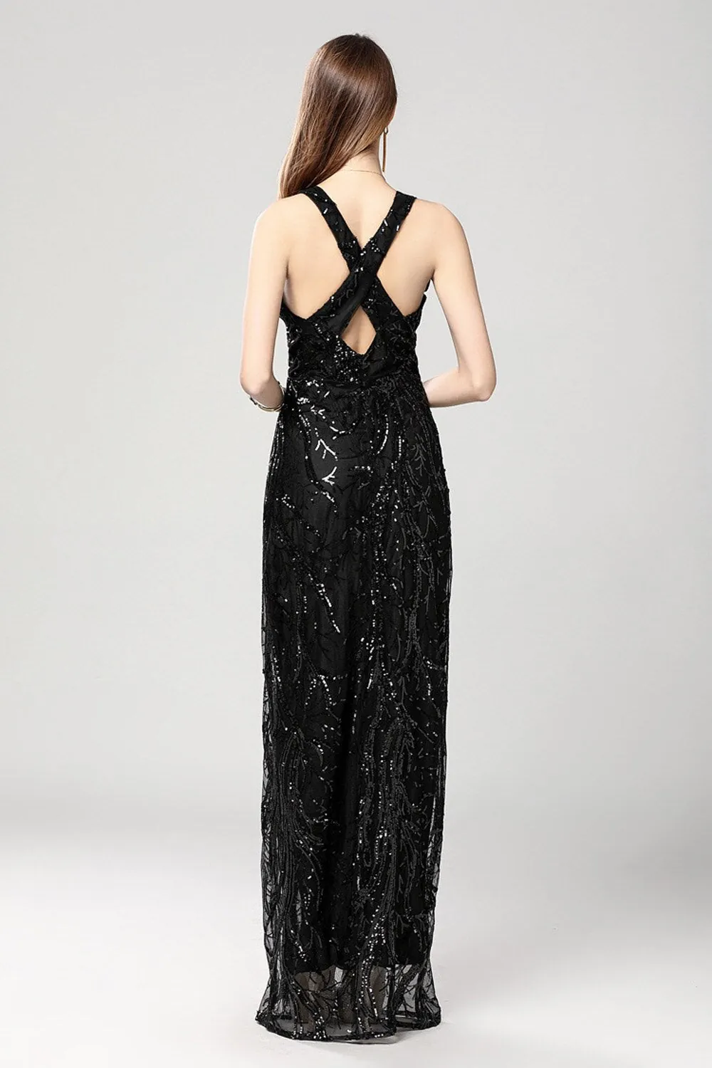 Women's Sexy Low V Neck Sleeveless Cross Open Back Embroidery Sequined Prom Party Dresses Long Runway Dresses