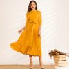 Summer Midi Dress Women Yellow Ruffled Hem Draped Back Buckle O-neck Mesh Lantern Half Sleeve Loose Casual Elegant Robe - Image 2