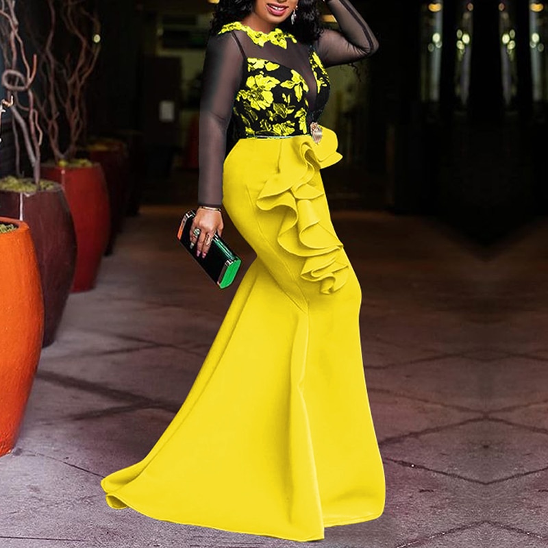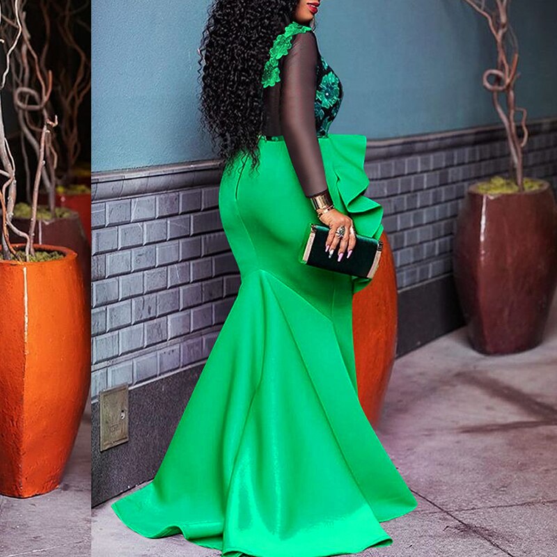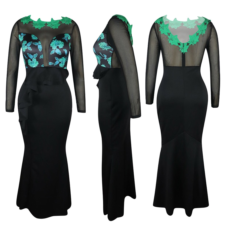 Plus Size Mesh Sheer Ruffles Long Sleeve Dress Women Elegant Transparent Bodycon Party Dress Patchwork Long Maxi Dresses - Hplify