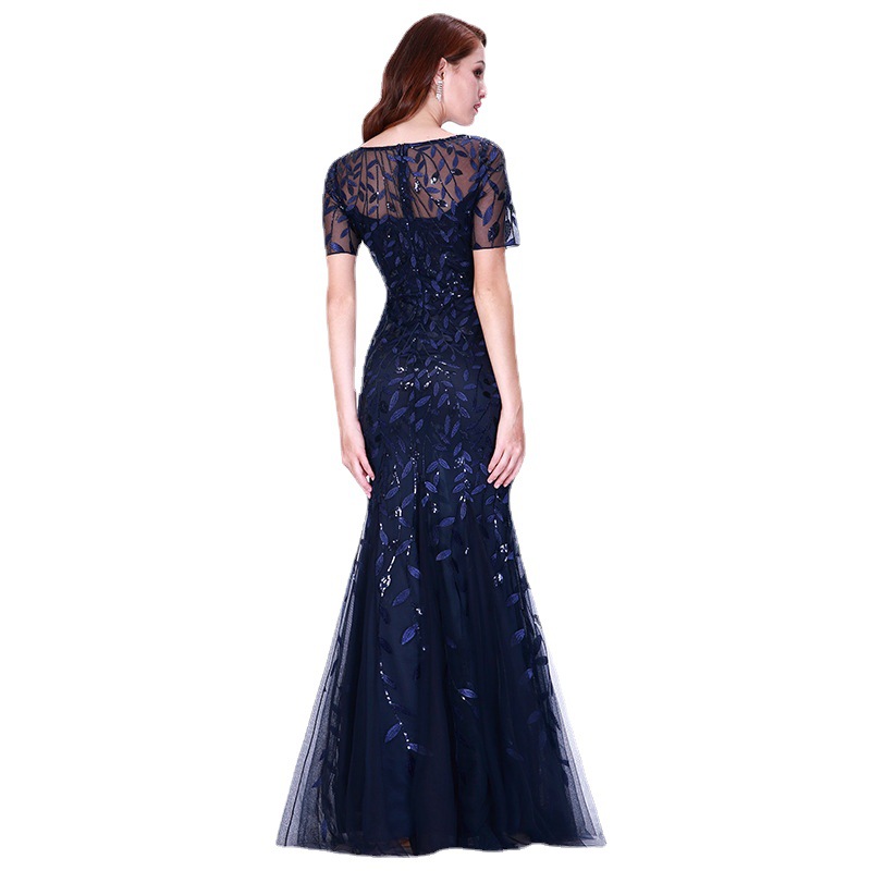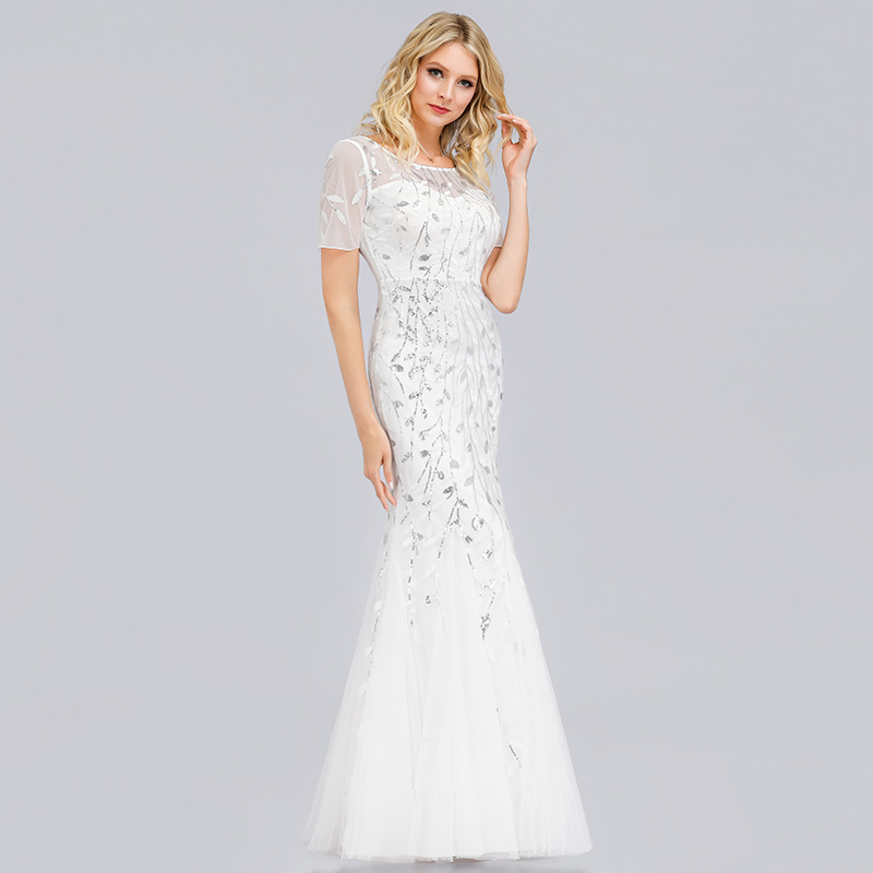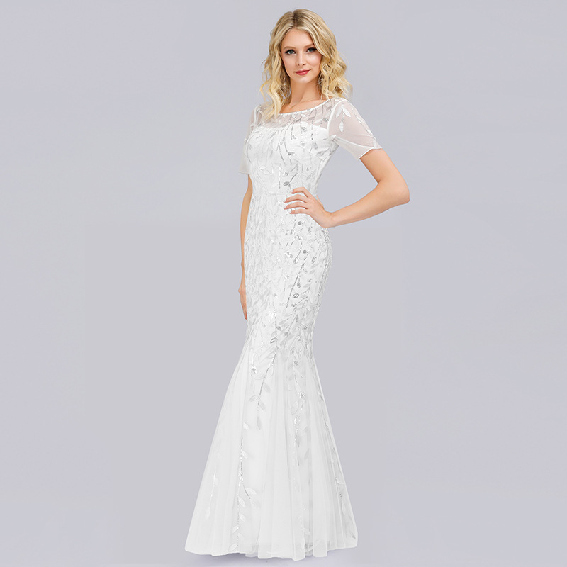 - Design: U-neck, short regular sleeves, mid-waist, full mermaid skirt, floor-length, sequin & tulle patchwork