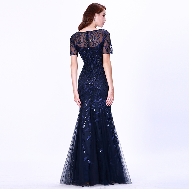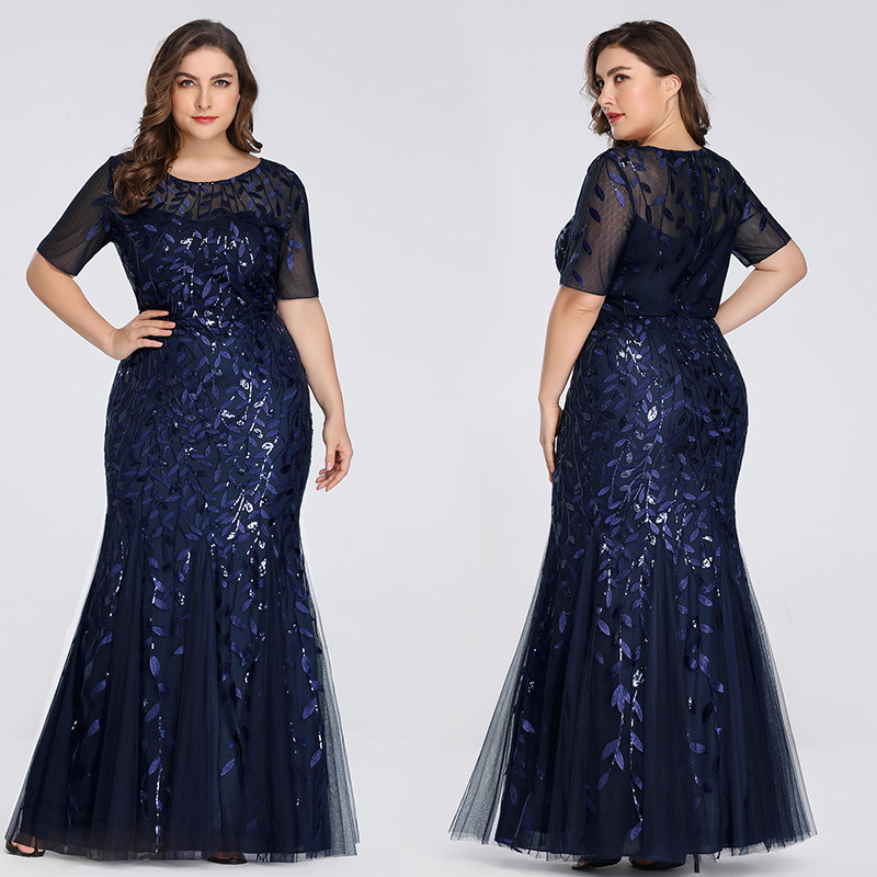 Plus Size Sequin Tulle Mermaid Evening Dress Short Sleeve Floor-Length