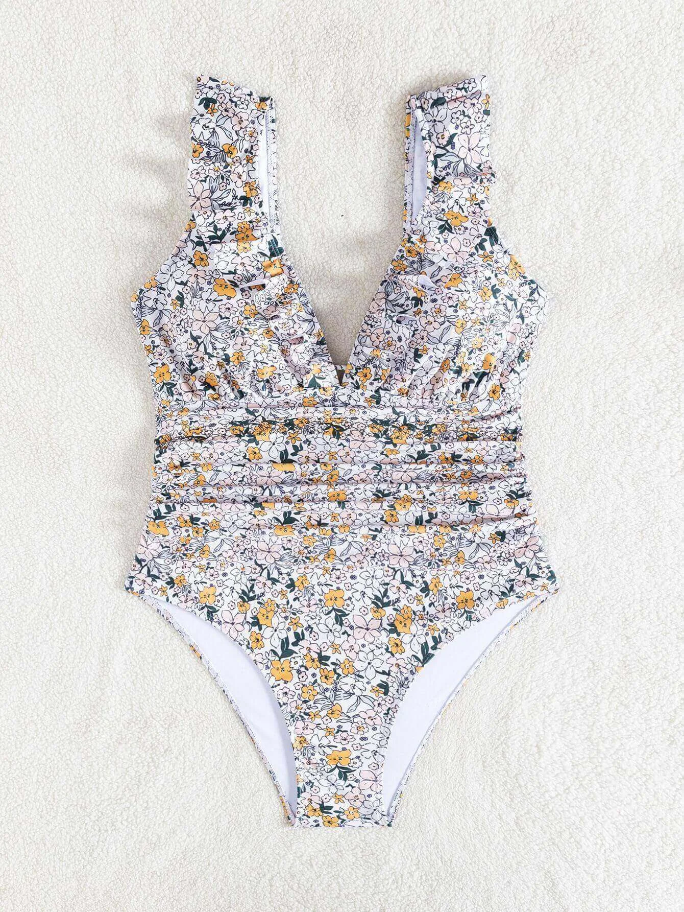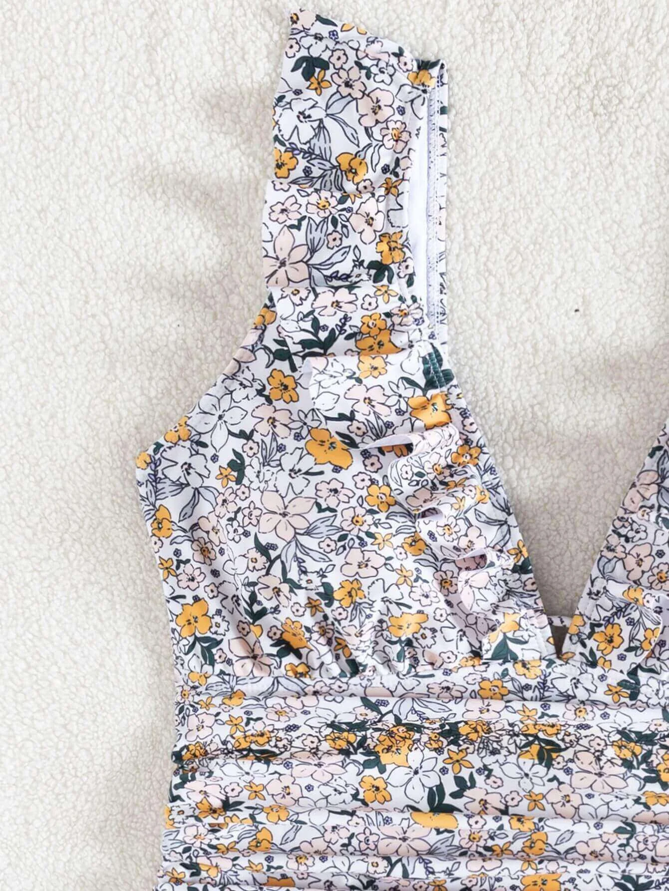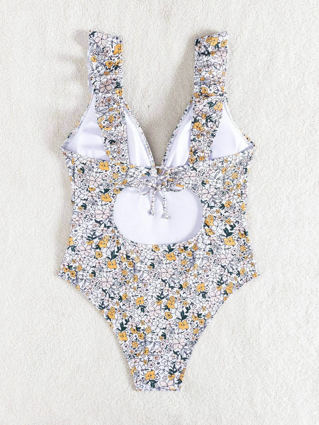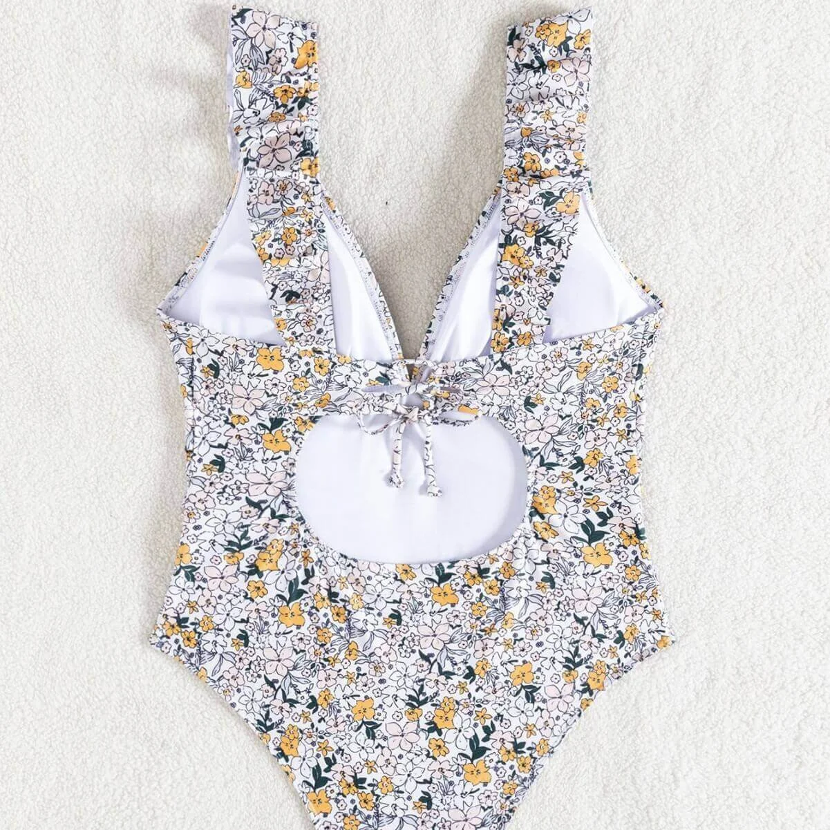 - Design Details: Deep V – neck, ruffled straps, open back with tie, padded cups (no underwire), floral print