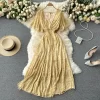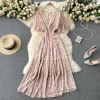 Solid Color Lace Ruffled Stitching Small Stand-up Collar Long-sleeved High-waisted Sweet Pink Dress