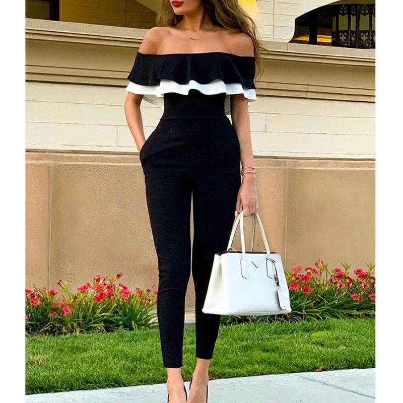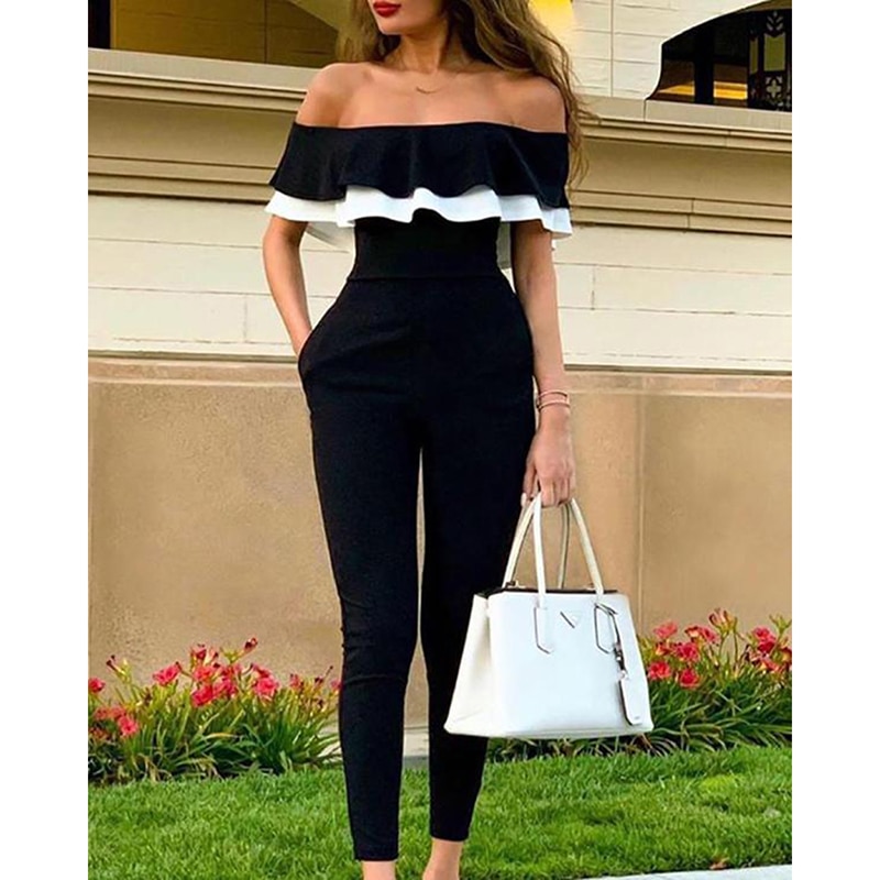 Ruffles design off shoulder jumpsuit women Short sleeve solid black romeprs womens jumpsuit Summer casual overalls woman - Hplify