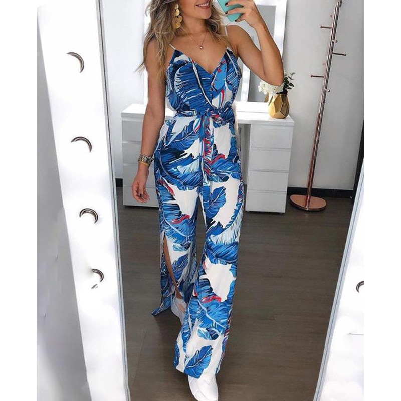 Sashes lace up long jumpsuit for women Summer casual loose rompers Split leg blue overalls for woman body mujer - Hplify
