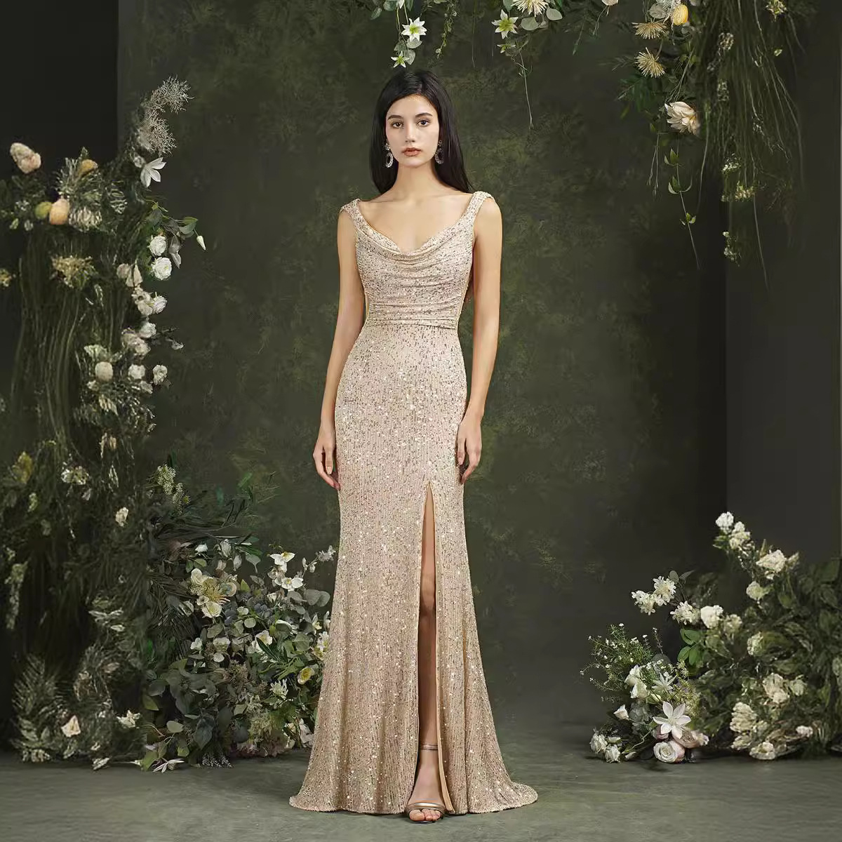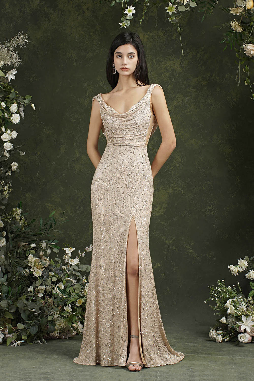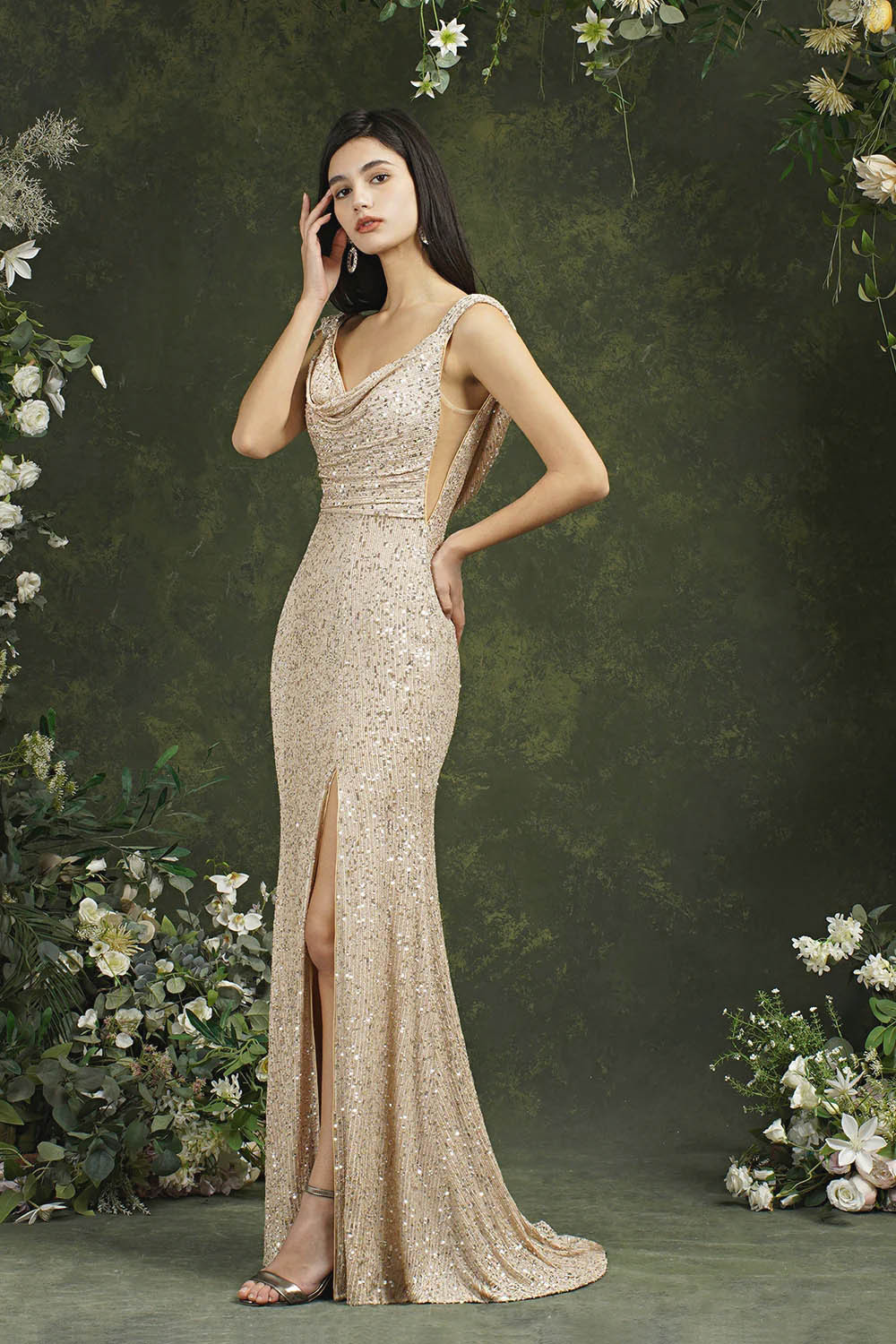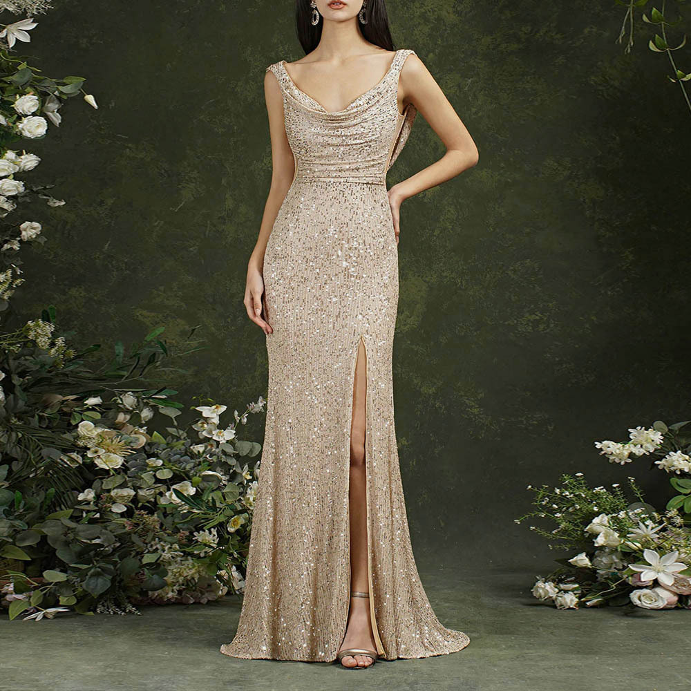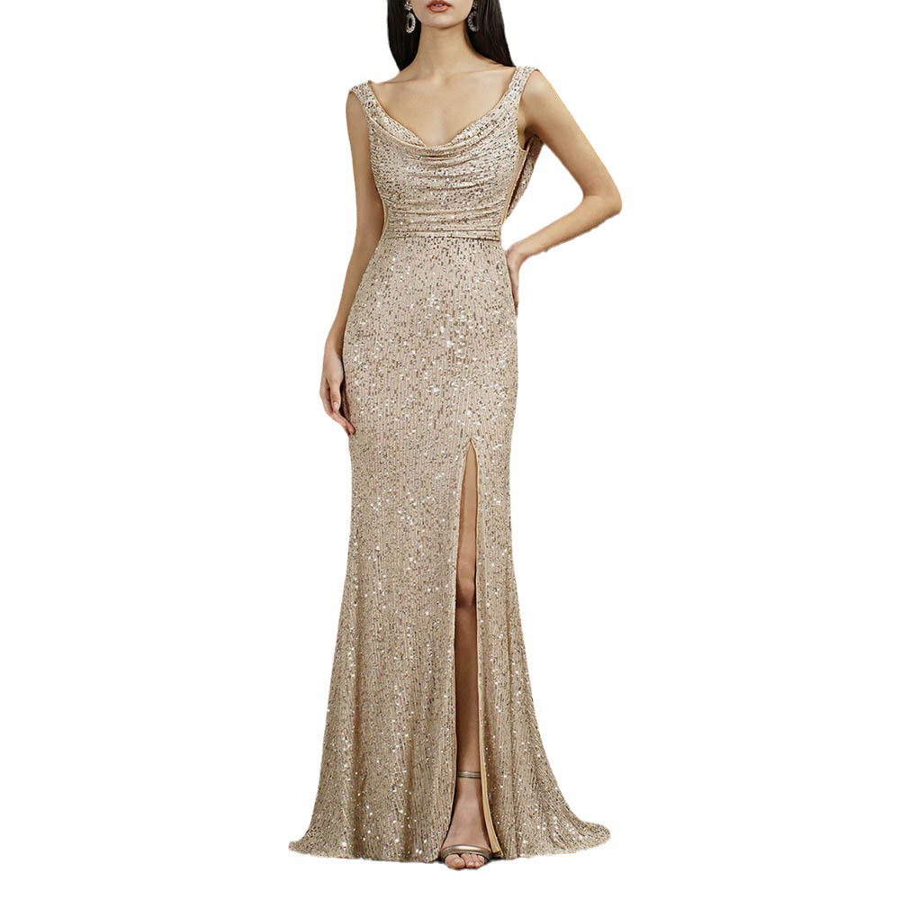 Sequin Evening Dress Sleeveless Draped Neckline Slit Maxi Elegant