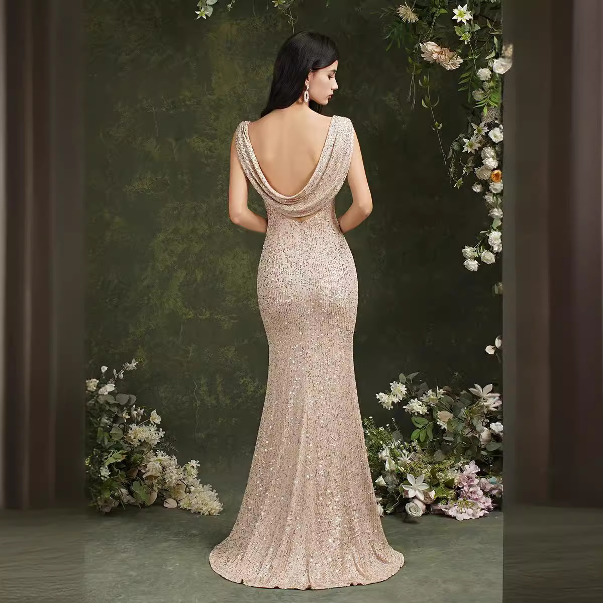 Make a statement at your next event with this Sequin Evening Dress! It has a sleeveless design, a draped neckline that adds elegance, and a slit maxi skirt that looks charming as you move. The medium – waist design flatters your figure, and the apricot solid – color sequin fabric (with polyester accounting for 95% or more) makes you stand out in any occasion, whether it’s a dinner party, a formal event, or a formal occasion at the office.