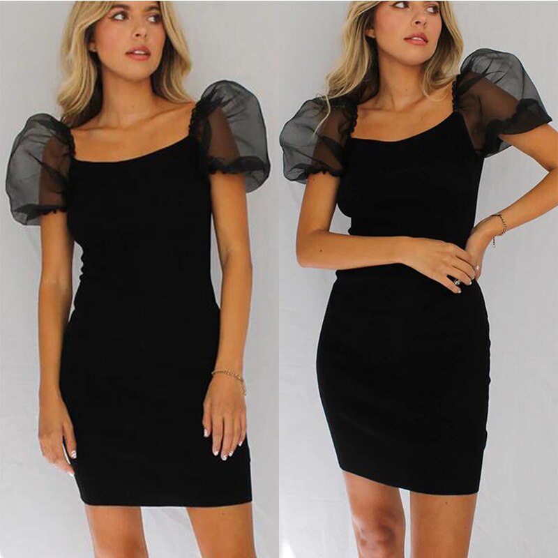 Sexy Dress Fashion Casual Solid Color Mesh Patchwork Square Collar Puff Sleeve Women Dress Short Sleeve Women Bodycon Dress - Hplify