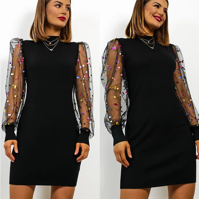 Sexy Dress Women Club Wear Bodycon Dress Casual Dot Printed Mesh Patchwork Turtleneck  Long Sleeve Women Dress - Hplify